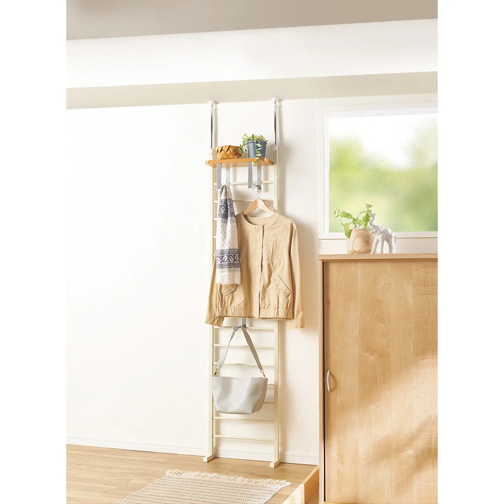 本商品は「突っ張り式薄型ブティックハンガーシリーズ ロータイプ 幅40cm 対応天井高183.5cm~248.5cm」です。奥行わずか18cm(脚部11cm)!のスリムタイプの収納ハンガー。壁面収納だから場所をとらず玄関のコートハンガーや寝室のコート掛けとしても。ウォークインクローゼット内でも便利に使え、色も設置場所に合わせて2色からお選びいただけます。使用例:ナチュラル ロータイプ 左から幅40cm、幅95cm省スペースの薄型設計!壁面にディスプレイ収納ご自宅の「壁」を使い勝手のいい収納空間に変える、壁面収納ハンガー「ブティックハンガーシリーズ」。タンスに収納する前のちょいがけハンガーとして、玄関に設置してコートハンガーとして、空いている壁を活用できます。幅は40cm・65cm・95cm・125cmから、スペースに合わせてお選びください。左:ホワイト ハイタイプ 幅40cm省スペースで叶う壁面収納最大の魅力は奥行の薄さ。奥行は棚板部分で約18cm、脚部はなんと11cm!玄関、廊下、踊り場など、空いている壁があれば収納スペースが増やせます。設置も簡単、安定感のある突っ張り式設置は支柱を伸ばしてつまみを回して固定。突っ張り部が2本別々に可動するので、段差のある梁にも対応します。自由に取り付け可能なL字フック取り付け位置が自由に変えられるL字フック。バッグや帽子、ストール等の小物をかけておくのに便利です。L字フックは、幅40cmは1個、65cmは2個、95cmと125cmは3個付属です。ハンガーがかけられるフック付き棚棚板にはハンガー掛け用のフックが下部分に付いています。フックは、幅40cmは2連、65cm・95cmは3連、125cmは4連です。棚は、引っかけるだけで好きな高さにセット可能。使用例:ナチュラル ハイタイプ 左から幅95cm、幅65cmどこでも使いやすい圧迫感のないデザイン薄型だから、廊下やベッドルーム、リビングに設置しても、圧迫感がなくスッキリした空間に。使用例:ホワイト ハイタイプ 幅125cmおでかけアイテムは玄関に集めて省スペースながら高さを持たせることで、洋服からカバン、ストール、小物等も収納できます。おでかけに必要な物をまとめておけば、準備・片付けもスムーズに。左からホワイト、ダークブラウン、ナチュラルカラーは2色、サイズは全8タイプカラーは、ホワイト、ナチュラルの2色。収納したい場所に合わせて、幅・高さをお選びください。ロータイプ(本体高さ172.5cm)突っ張り対応天井高さ:183.5〜248.5cmハイタイプ(本体高さ195.5cm)突っ張り対応天井高さ:200〜270cm