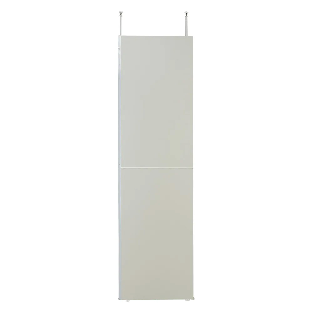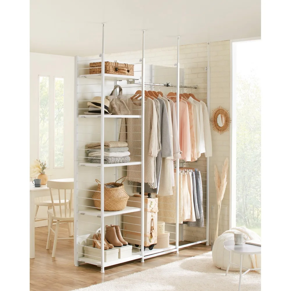 工事不要。天井までの高さを生かす突っ張り式の間仕切り収納です。清潔感あるホワイトカラー。圧迫感のないオープンタイプなので、コンパクトな空間にもおすすめ。衣類や雑貨を収納しながら、限られた空間を機能的に活用できます。空間を自在に仕切って、大容量収納も手軽に!寝室やリビングルームに置いても使いやすいクローゼットハンガー。施工不要でダイニングとリビング、ベッドとデスクスペースなど、目的に応じて収納を増やしつつ手軽にお部屋を仕切ることが可能です。ホワイトカラーでどんな部屋にもすっきり馴染むどんな部屋にも馴染みやすいホワイト色は圧迫感がなく、シンプルなデザインで、部屋全体の雰囲気を壊さずに、おしゃれで落ち着いた空間を演出します。カスタマイズ自在!自分だけの理想の収納を実現棚板とハンガーバーは8cm間隔でお好みの位置に設置可能。自分のライフスタイルや服の種類に合わせて、理想的な収納スペースをカスタマイズできます。毎日の使い勝手が格段に向上し、収納のストレスも解消します。天井の段差も対応!突っ張り式で安定設置突っ張り式だから天井の段差にも対応できる優れもの。安定した設置が可能で、場所を選ばずに使えます。手間いらずで簡単に取り付けられるので、すぐにお部屋を整えることができます。予算を抑えておしゃれに収納!リノベーション不要の万能間仕切りリノベーションしない収納計画にも、リノベーションしたお部屋にもピッタリ。この間仕切り収納は、天井までの高さを生かした大容量収納が魅力です。低予算でありながら、ワンルームなど限られた広さでも、すっきりと間仕切り&収納を実現できます。リビングに在宅ワークスペースを作ったり、寝室にクローゼットスペースを設けたりと、自分のニーズに合わせて自在に使えます。あなたのニーズに合わせる可変型収納システムライフスタイルに応じてサイズと収納タイプを自由にお選びいただけます。ハンガー2段、ハンガー&棚、棚タイプの3種類があり、高さは210〜260cmと高めの設計で、別売りのハンガー2段タイプには衣類の2段掛けも可能。※写真は別売りの「ハンガー&棚タイプ・幅90cm」「棚タイプ連結用・幅58cm」「ハンガー2段タイプ連結用・幅88cm」※写真は天井高さ240cm