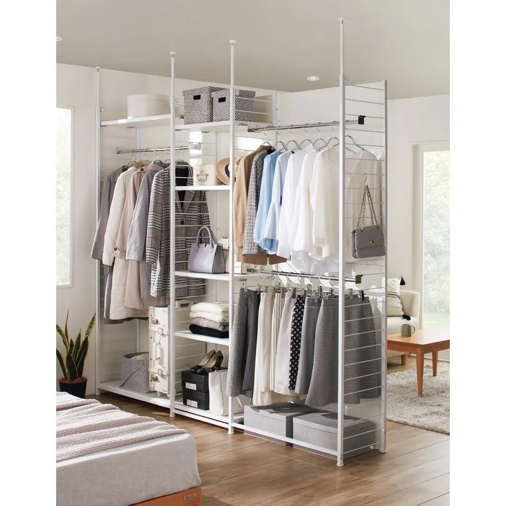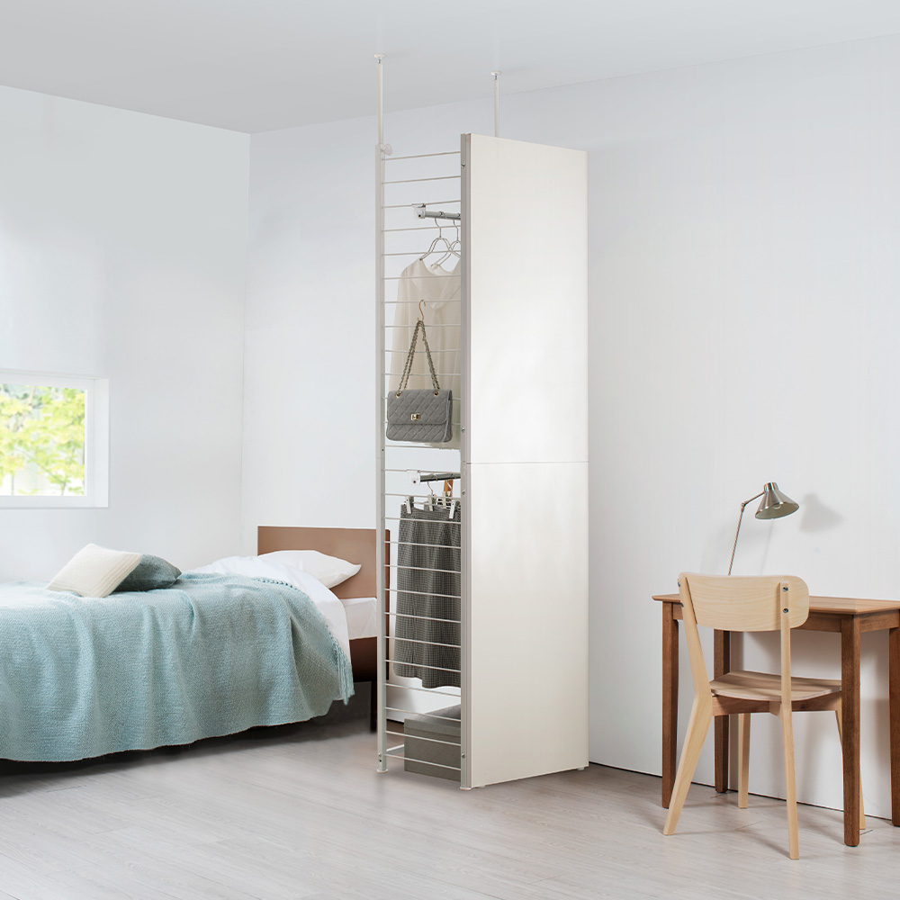 空間を間仕切りながら大容量収納まで叶えます。寝室やリビングルームに置いても使いやすいクローゼットハンガーです。限られたスペースを目的別に使い分けて、機能も居心地もアップ。