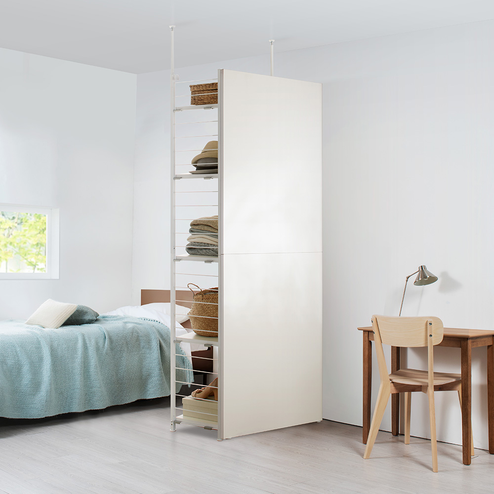 工事不要。天井までの高さを生かす突っ張り式の間仕切り収納です。清潔感あるホワイトカラー。圧迫感のないオープンタイプなので、コンパクトな空間にもおすすめ。衣類や雑貨を収納しながら、限られた空間を機能的に活用できます。収納もスペースも思いのまま。収納面とパネル面で手軽にお部屋を間仕切りできる一台二役の間仕切りハンガーラックシリーズ置くだけで手軽に空間を間仕切りながら、大容量収納まで叶えてくれる間仕切り収納。寝室やリビングルームに置いても使いやすいクローゼットハンガーです。施工不要でダイニングとリビング、ベッドとデスクスペース等、目的に応じて収納を増やしながらお部屋を仕切ることが可能です。【Point 1】清潔感あるホワイトカラーで、デザイン性も兼ね備えた収納シリーズ●どんな部屋にも馴染みやすいホワイト色。●圧迫感がなく北欧風インテリアに合わせやすいデザインです。【Point 2】収納物や使い勝手に応じて、サイズと収納タイプをお選びいただけます●天井の段差にも対応できる突っ張り式。●本体の商品の幅は60cm・90cmの2サイズをご用意致しました。●収納タイプはハンガー2段、ハンガー&棚、棚タイプをご用意。●本体高さ210cmと高めの設計なので、別売りのハンガー2段タイプには衣類の2段掛けも可能。取り出しやすく、ゆったり余裕をもって掛けられます。●棚板とハンガーバーは8cm間隔でお好みの位置に設置できます。●使う場所や収納物、収納量に応じてお好みで組み合わせることも可能です。●複数台並べて使う場合は、本体に連結用を組み合わせてください。●連結用を組み合わせれば、大きな空間でも間仕切ることが可能です。リノベーションしない収納計画にも、リノベーションしたお部屋にも◆間仕切りと収納を兼用でき、天井までの高さを生かした容量も魅力。リノベーションよりもぐっと低予算で、ワンルームなど限られた広さでもすっきりと間仕切り&収納を叶えます。◆リノベーションして広くなったお部屋にもおすすめ!たとえばリビングの中に在宅ワークスペースを作る、寝室の中にクローゼットスペースを設けるなど、間仕切りとして自在にお使いいただけます。片面は天井までの高さを生かした収納空間なので、お部屋がいつも片づいた状態を保てます。【Point3】様々な用途に使える間仕切り収納●広めのお部屋に置いたベッドスペースの目隠しとして。●テレワークをするための、ホームオフィス空間の間仕切りとして。●ダイニングスペースとくつろぐスペースの間仕切りとして。●収納が少ないお部屋に置けば、トランクや季節家電を隠せるウォークインクローゼットを作ることが出来ます。※棚板は本体1台につき合計最大7枚まで設置できます。※幅が同じ商品の場合、棚板とハンガーバーはどの位置にも付け替え可能です。※連結用(商品番号589741〜46)は単体ではご使用できません。本体(商品番号589735〜40)と合わせてお選びください。※連結用(商品番号589741〜46)は向かって左側のみ本体(商品番号589735〜40)と連結可能で、複数台並べて設置することができます。