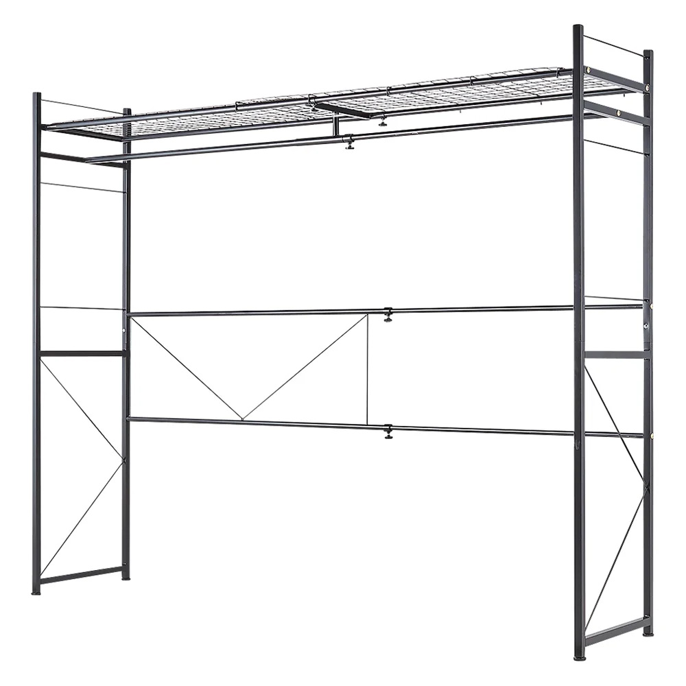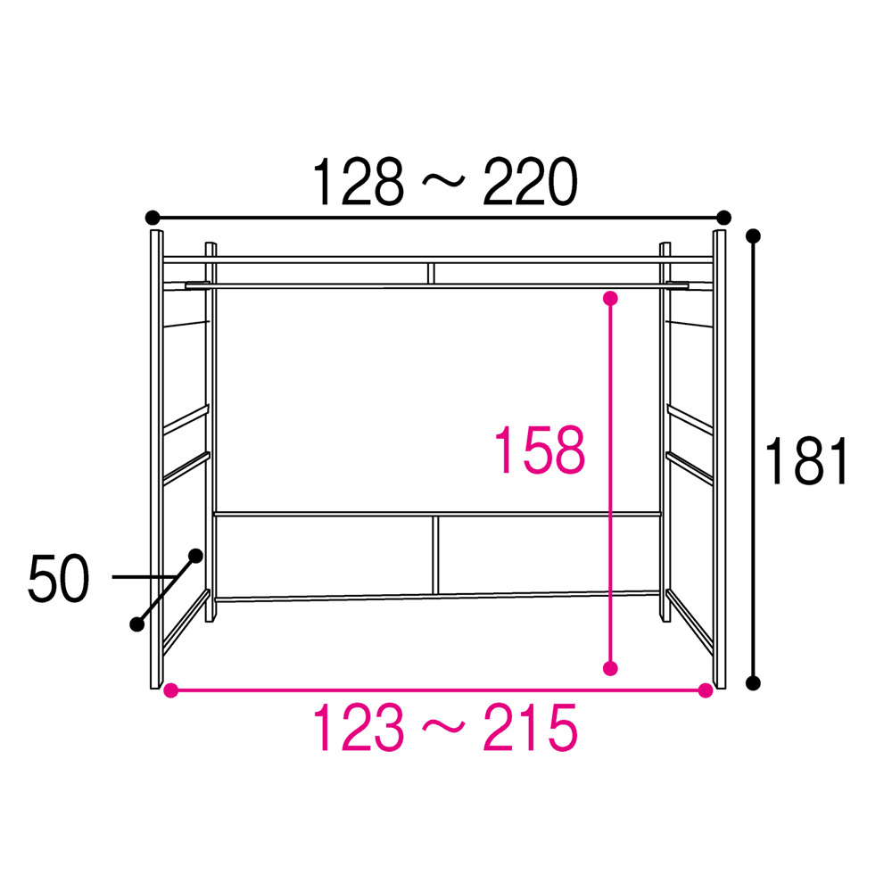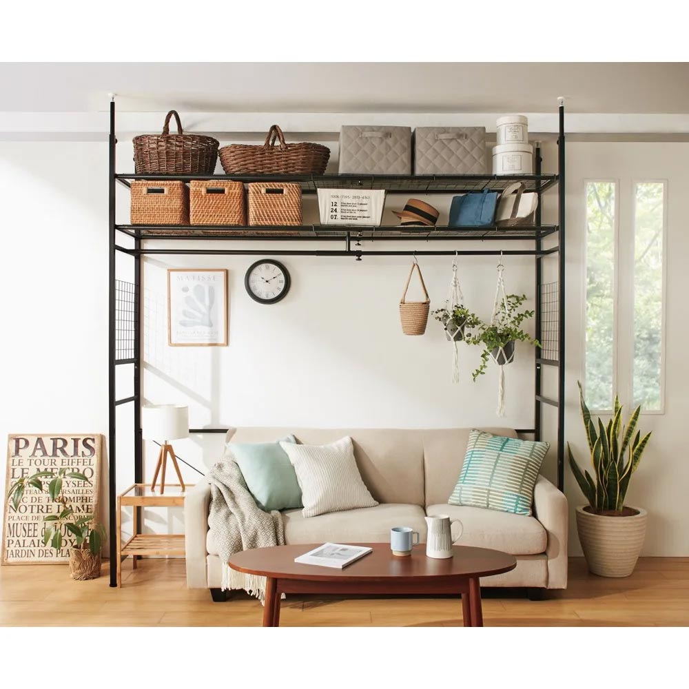 部屋が狭い!収納が少ない!解決策は家具上の空間にありました。伸縮自在で収納が少ないお部屋の悩みを解決できる収納ラックです。収納が少ないお部屋に特におすすめ。家具の上も収納になる、スペースを最大限活かせる収納ラック収納が少なく、家具を置くスペースもあまりない…。という方にお使いいただきたい、伸縮自在の収納ラックです。●お部屋のスペースでかなりの部分を占めるのはソファやデスクなどの大型家具。●この収納ラックを使えば、その場所も大容量の収納スペースに大変身。●床面積を占有する家具はもう置けない、でも収納が欲しい。●そんな欲張りなお悩みを解決できるラックです。限られたスペースを余すところなく活かせるような、こだわり満載の伸縮ラックです●商品の幅は128cm〜220cmまで無段階で伸縮可能。●ラックの下にソファを横置きしてもすっぽり収まります。●デスクと組み合わせて、集中できるワークスペースに。●鏡を置いたチェストと組み合わせれば、メイクや身支度のコーナーが手軽に作れます。●家具を置いた、上部のスペースを有効活用できます。ハンガーやメッシュ棚にたっぷり収納可能●バッグ等の収納に便利なメッシュ棚は高さ181cmは1段、天井突っ張りタイプは2段付きです。●普段使いのバッグや衣類、リネンなど、様々な物を収納することが可能です。●またハンガーバーにはデイリーな衣類を収納しておけるので、クローゼットにしまう必要がありません。●色はホワイトとブラックの2色からお選びください。●安心の日本製です。