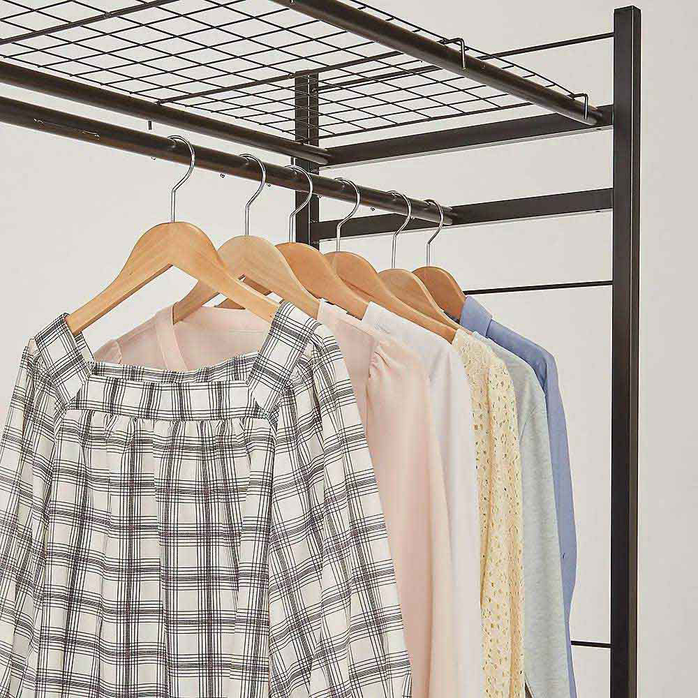 ハンガーバーにはたっぷり衣類が収納出来ます。メッシュ棚1段にはバッグやリネン、畳んだ衣類など収納できます。