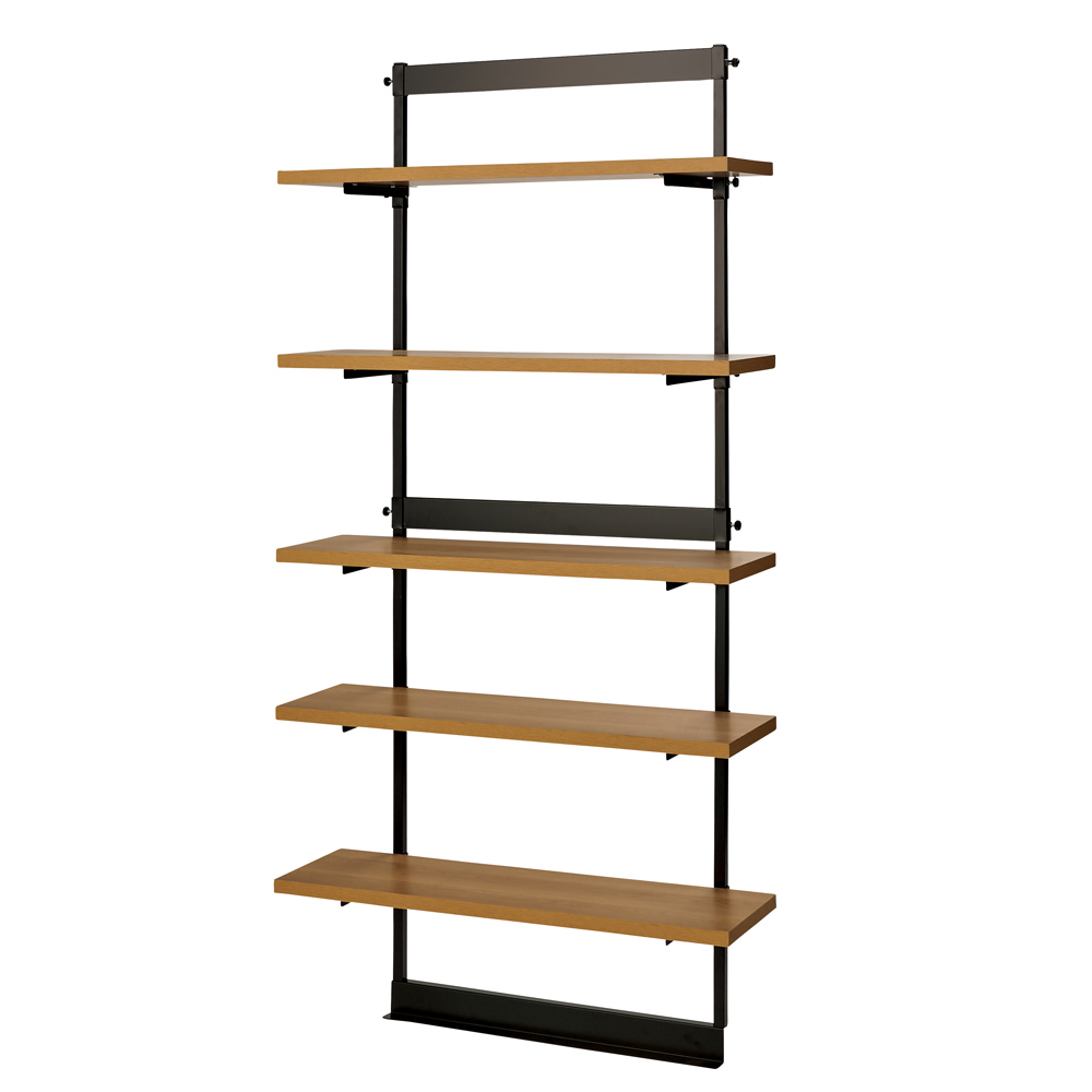 コーディネート例(イ)ブラック 突っ張らないでも壁にピッタリ設置できる薄型ラック。今まで意識した事がないスペースも収納として活用できます。 ※写真左からラダーラック幅65cmタイプ、ミラー幅60cmタイプ、棚 幅60cmタイプ。