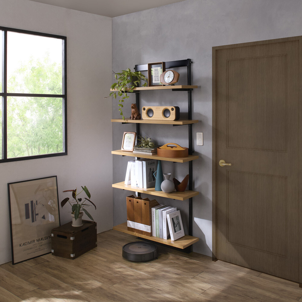使用イメージ(イ)ブラック 賃貸でも安心。石膏ボードの壁に付属の壁面固定具で誰でも簡単に設置でき、取り外し後は壁の針跡も目立ちにくいです。 ※写真は別売りの幅80cmタイプです。