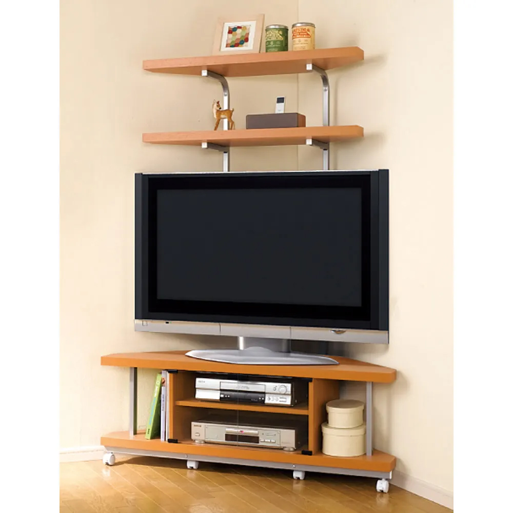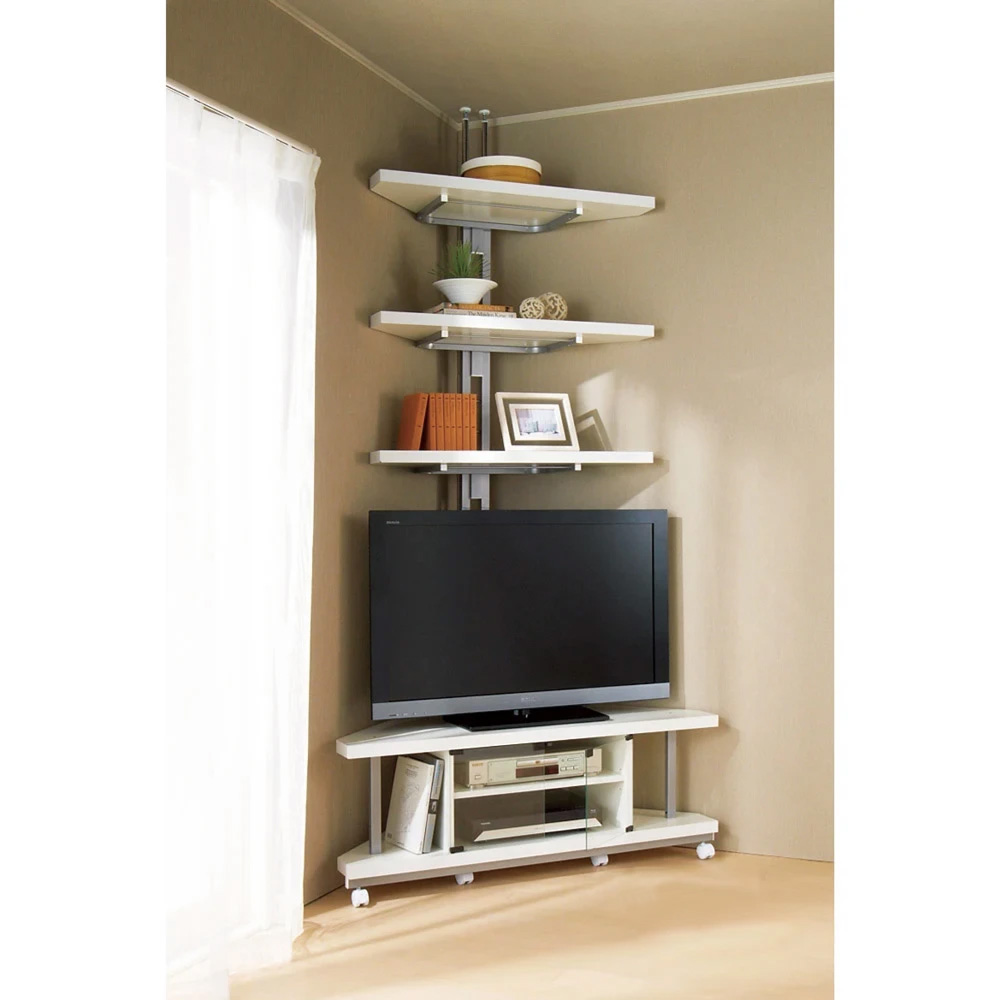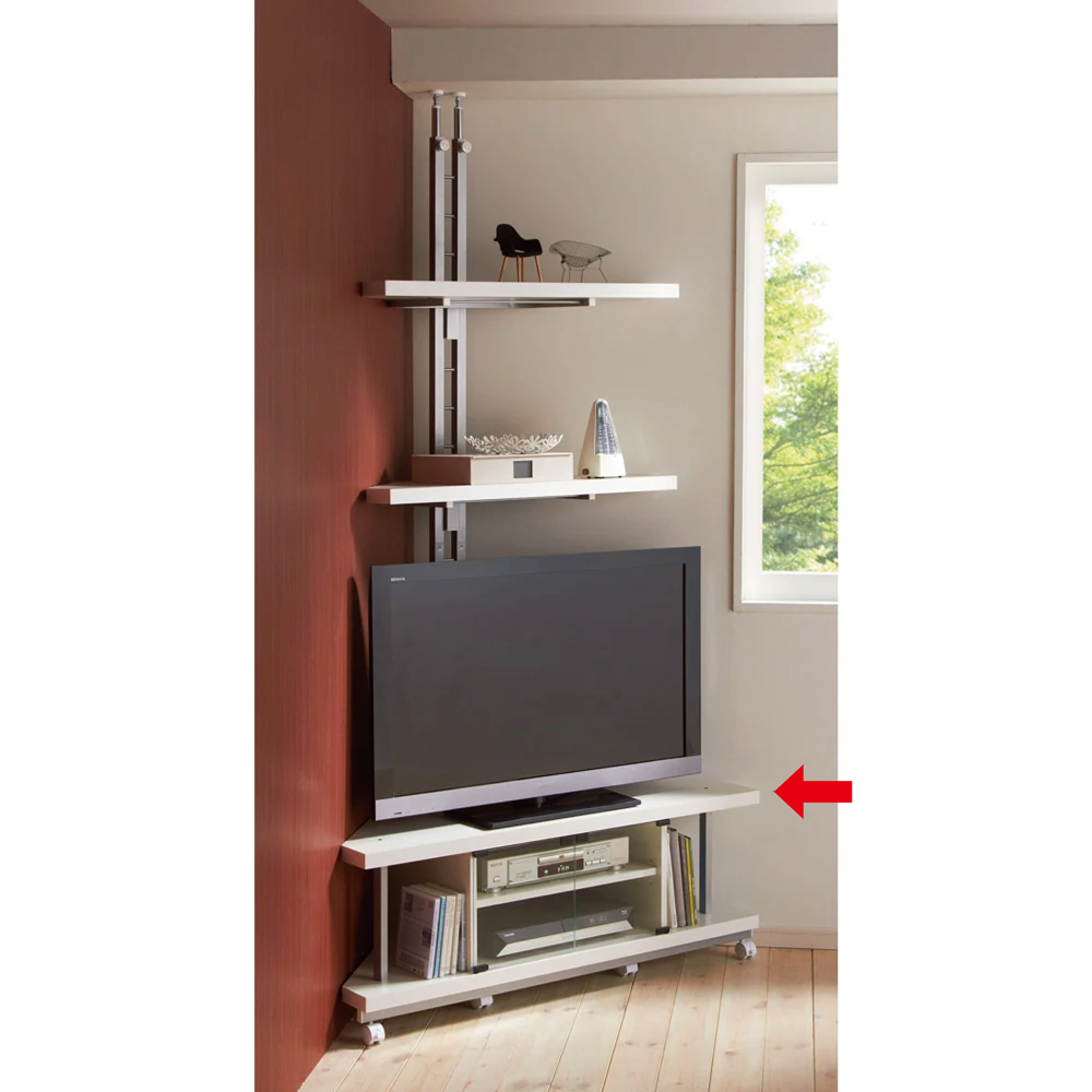 (イ)ホワイト×シルバー デッドスペースになりがちなTV上の空間が、圧迫感なく飾れる収納スペースに。 ※お届けはコーナー用テレビ台のみとなります。突っ張り式ラックは別売となります。