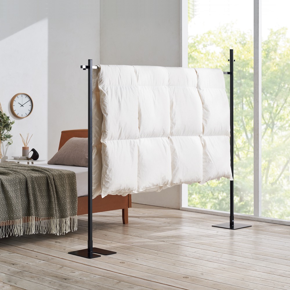 (ア)ブラック ロングタイプは毛布や掛け布団が干せるサイズ。シングルの毛布やパッドシーツ、2〜3人分の洗濯物が掛けられます。風の強い日や花粉の季節は窓際で掛け布団を干しても