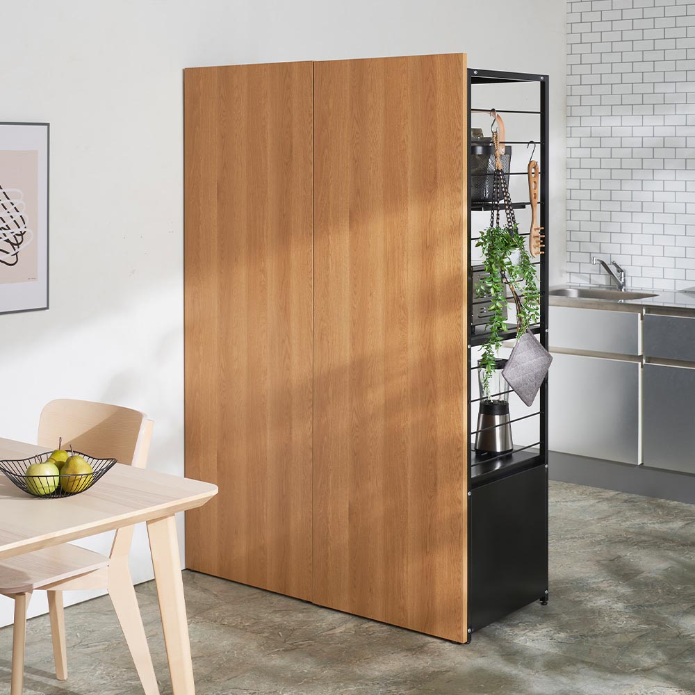 コーディネート例(イ)ブラウン 間仕切りしながら収納できる一台二役のキッチンラック。LDK を仕切って家電や食品をすっきり収納。 ※写真左からゴミ箱タイプ、棚タイプ。