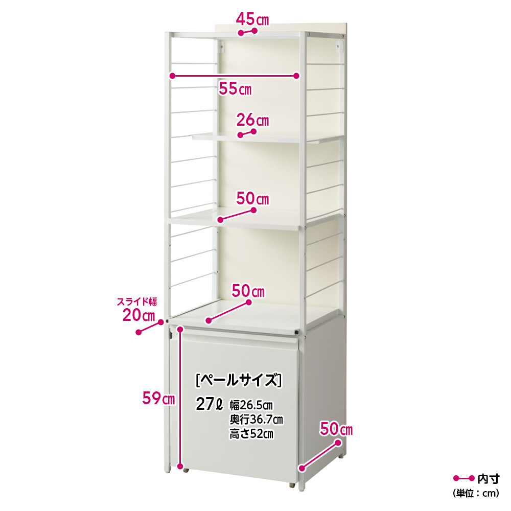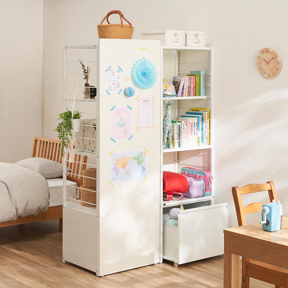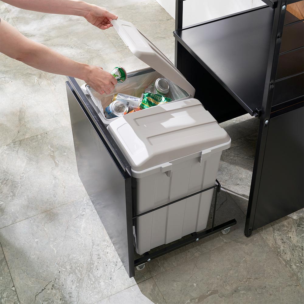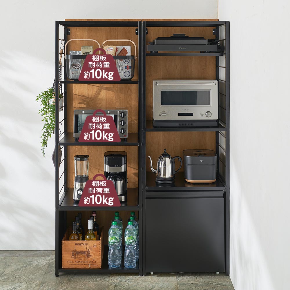間仕切りとしても使える背面パネル付き頑丈ラック。棚板1枚あたり約10kgの耐荷重で、重い調理家電も安心して収納できます。ゴミ箱タイプは引き出してサッと捨てられるプッシュ式のゴミ箱付きです。ブラック 写真左から棚タイプ、ゴミ箱タイプ ※お届けはゴミ箱タイプです間仕切りとしても使える背面パネル付き頑丈ラックワゴンタイプ、ゴミ箱タイプ、棚タイプを選んで、調理家電や食品ストックなどを効率的に収納できる頑丈ラック。背面パネル付きなので、間仕切りとしても活用できます。ブラック 写真左からゴミ箱タイプ、棚タイプ ※お届けはゴミ箱タイプですゴチャつきがちな収納部分はパネルで目隠し調理中の散らかりや収納部のゴチャつきをパネル面でスッキリ目隠し。キッチンとダイニングをうまく使い分けできます。ホワイト ※写真は別売りのワゴンタイプと棚タイプの組み合わせです。両サイドから収納が使えるレイアウトもOK向きを変えて2台並べれば、両サイドから収納が使えるレイアウトに。寝室と子どもスペースを仕切る、一部屋を子ども2人で分けるなど、様々な使い方ができます。写真左:ホワイト 写真右:ブラック日本製の頑丈なつくり安心の日本製。色はホワイトとブラックの2色展開で、お部屋に合わせてお選びいただけます。写真左:ホワイトのパネル面 写真右:ブラックのパネル面 ※写真は別売りのワゴンタイプ背面から見ても美しいパネル面間仕切り、目隠しの役割を果たし、背面から見ても美しいパネル面。木製なのでマスキングテープでメモやお子さまの絵を貼ったり、ディスプレイを楽しんだりできます。ブラック 写真左から棚タイプ、ゴミ箱タイプ ※お届けはゴミ箱タイプです棚板1枚あたり10kgの耐荷重で大量収納が可能に棚板1枚あたり10kgの耐荷重を実現。重い調理家電や飲料などのストックも、安心して収納できます。側板に引っかけるだけの可動棚板は設置も移動も簡単側板のバーにひっかけるだけで設置、移動が簡単な可動棚。上から2段目はハーフ棚なので、調理家電の蒸気を避けられます。隠せるゴミ箱付き最下段の収納スタイルによって3つのタイプから選べます。ゴミ箱タイプは引き出してサッと捨てられるゴミ箱付きです。調理家電スペースとして便利なスライド棚炊飯器、電気ケトル、コーヒーメーカーなど、使用時にフタを開けたり、蒸気が出たりする調理家電はスライド棚に。目いっぱい引き出せるレール式で、配膳用スペースとしても使えます。棚板は水や汚れに強いスチール製棚板はスチール製だから、水や汚れに強く、汚れてもサッと拭きとるだけでお手入れ簡単。シンクやコンロの横に置いても安心です。