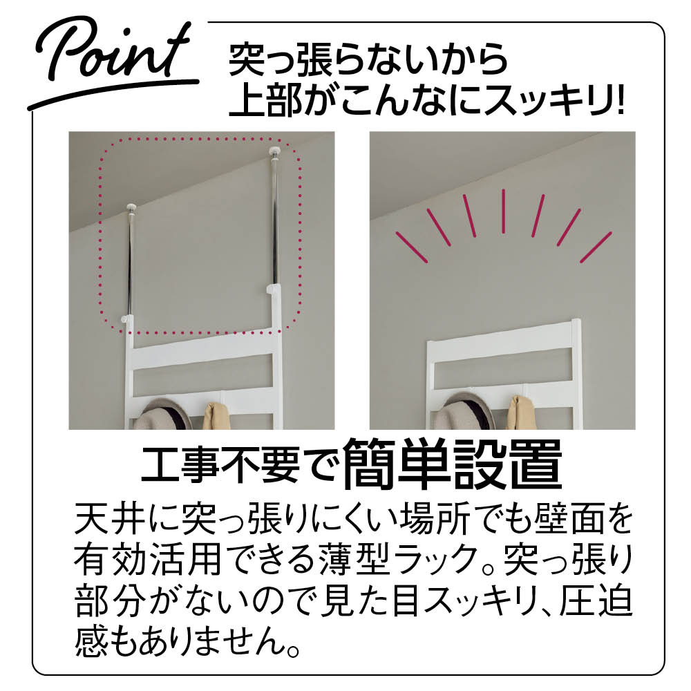 使用イメージ(ア)ホワイト 突っ張らないでも壁にピッタリ設置できる薄型ラック。今まで意識した事がないスペースを収納として活用できます。 ※写真は別売りのラダーラック幅45cmタイプ。