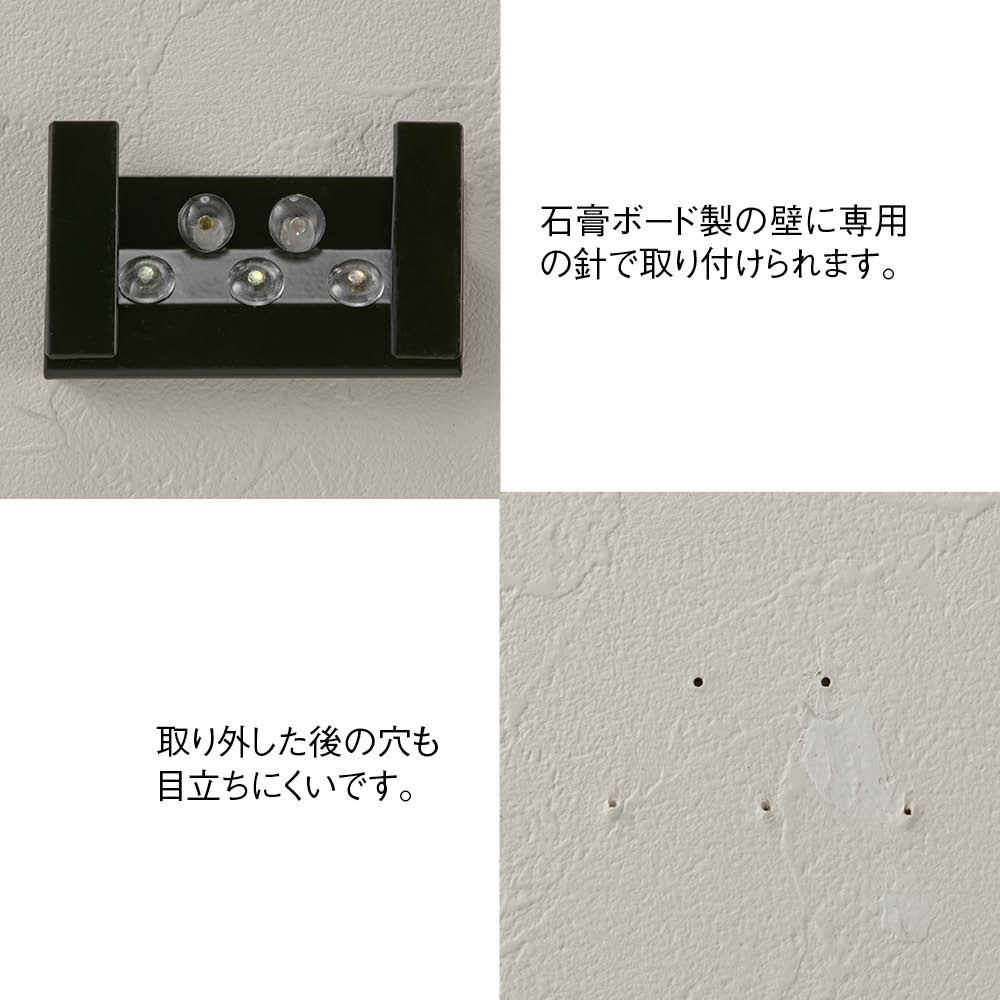 石膏ボードの壁に付属の壁面固定具で誰でも簡単に設置でき、取り外し後は壁の針跡も目立ちません。