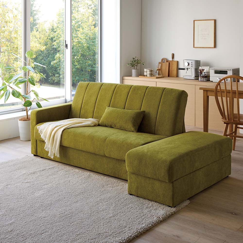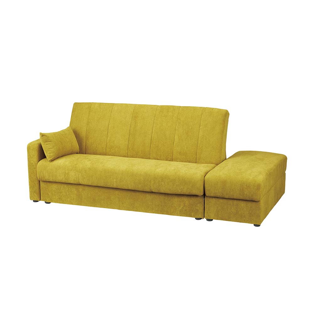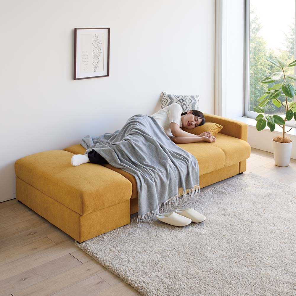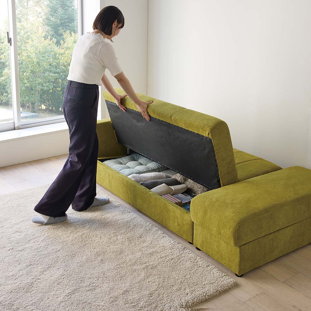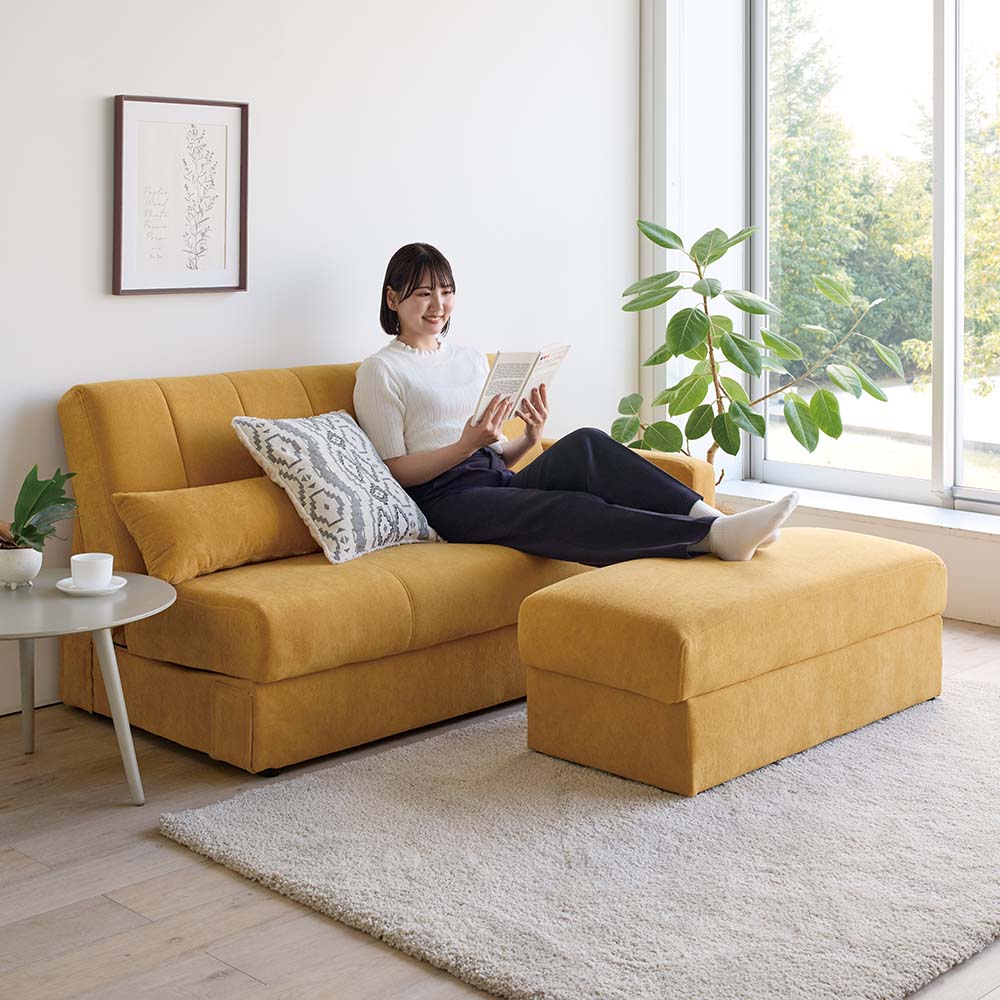 ビビッドカラーが魅力のソファベッド。リビングに溢れがちなこまごまとしたアイテムを、座面下にたっぷりしまえて空間がすっきり。収納もくつろぎも、これひとつで座面の下には大容量の収納スペース付き。もっとリビングに収納が欲しいけど家具は増やしたくない…。そんなお悩みを解決するソファベッド。リビングに散らかりがちなリモコンや雑誌、ブランケット類まですっきり収まります。いろいろ使えるオットマン付き横につければゆったり3人がけのソファになり、背面のリクライニングを倒せば、お昼寝や来客用の簡易ベッドにも早変わり。ソファの前に置けば、脚を伸ばしてくつろげるカウチスタイルに。気分まで明るくなる、鮮やかなはっ水機能付き張地お部屋の印象をパッと華やかにしてくれる、ビビッドなカラー。張地ははっ水加工済みなので、飲み物をこぼしてもサッと拭くだけ。