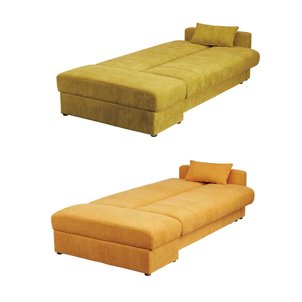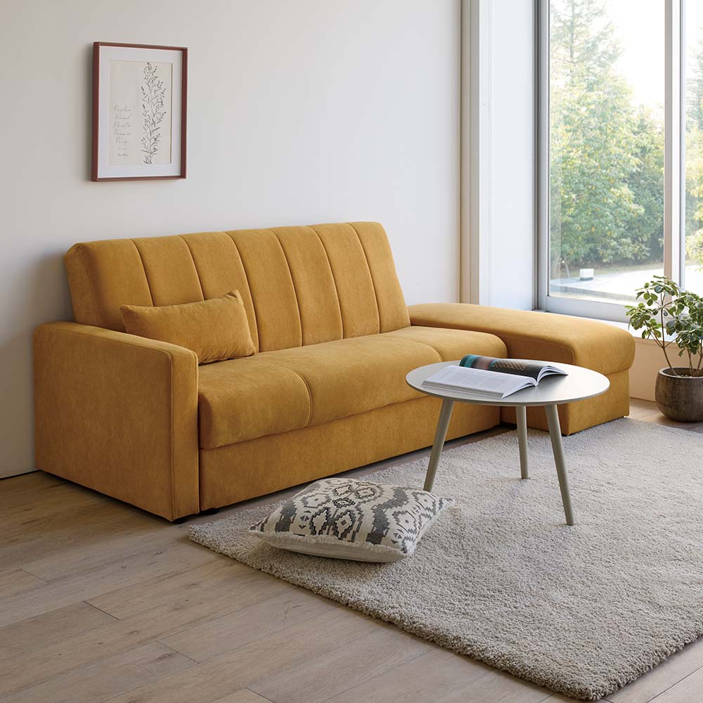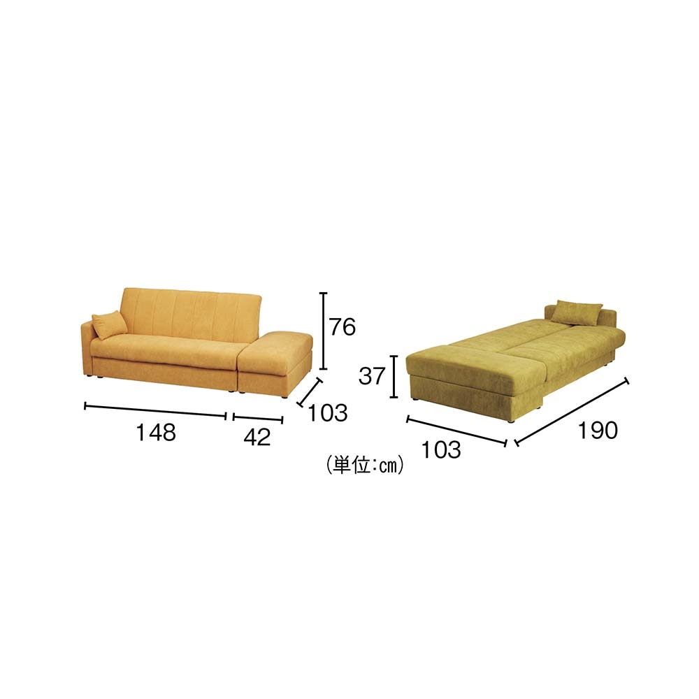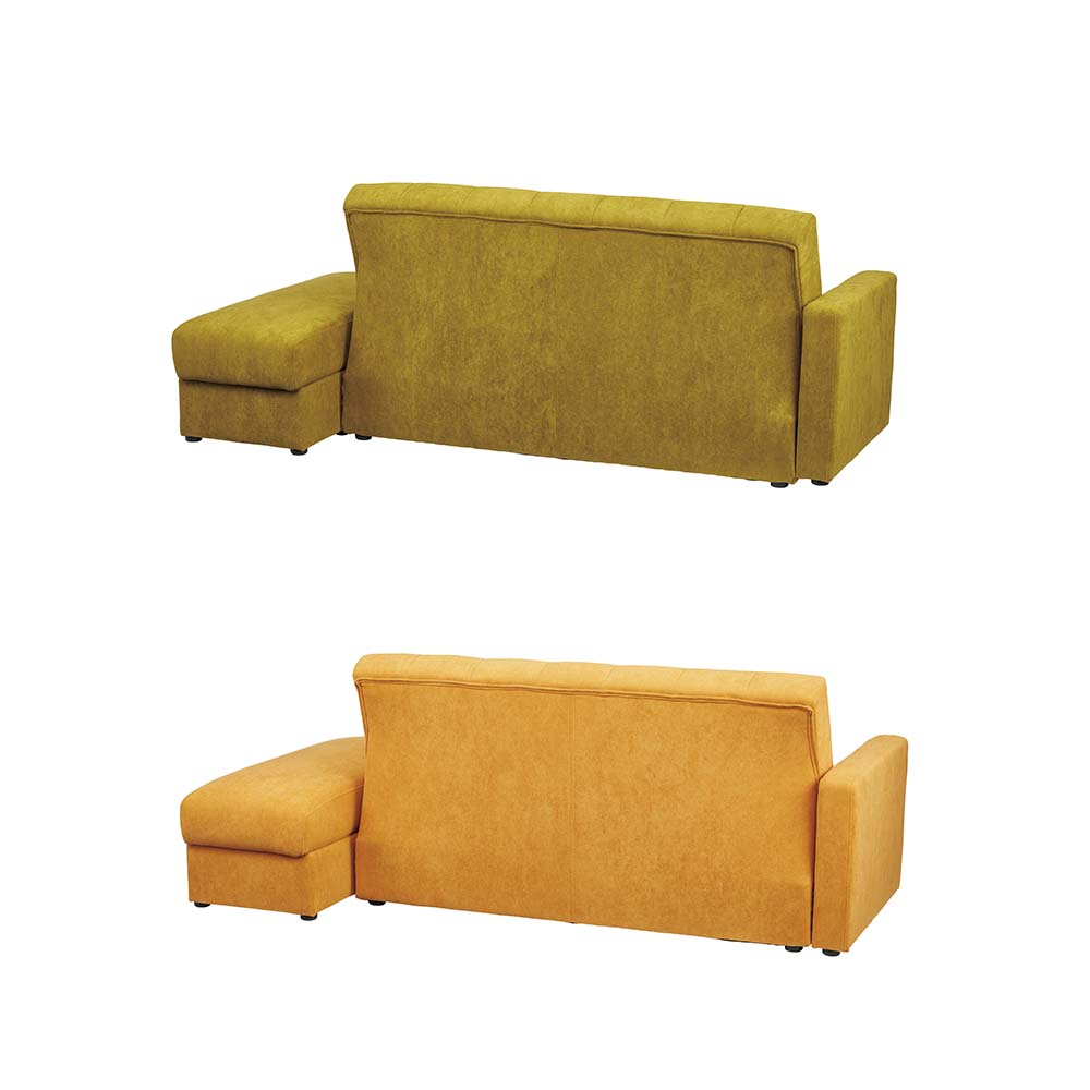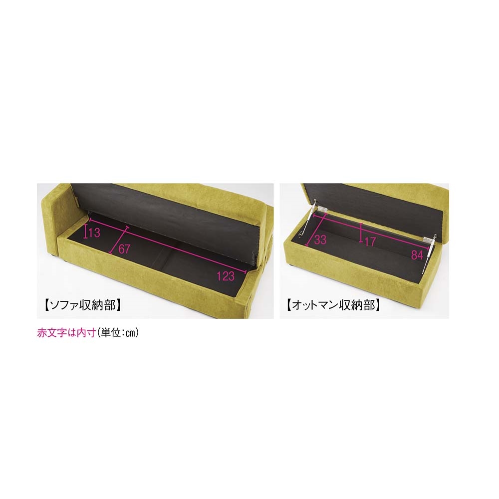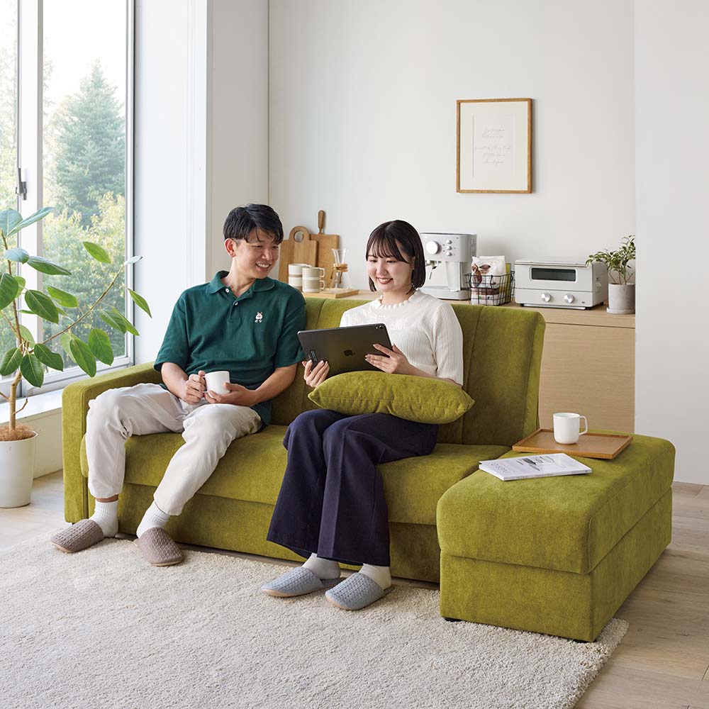 ビビッドカラーが魅力のソファベッド。リビングに溢れがちなこまごまとしたアイテムを、座面下にたっぷりしまえて空間がすっきり。収納もくつろぎも、これひとつで座面の下には大容量の収納スペース付き。もっとリビングに収納が欲しいけど家具は増やしたくない…。そんなお悩みを解決するソファベッド。リビングに散らかりがちなリモコンや雑誌、ブランケット類まですっきり収まります。いろいろ使えるオットマン付き横につければゆったり3人がけのソファになり、背面のリクライニングを倒せば、お昼寝や来客用の簡易ベッドにも早変わり。ソファの前に置けば、脚を伸ばしてくつろげるカウチスタイルに。気分まで明るくなる、鮮やかなはっ水機能付き張地お部屋の印象をパッと華やかにしてくれる、ビビッドなカラー。張地ははっ水加工済みなので、飲み物をこぼしてもサッと拭くだけ。