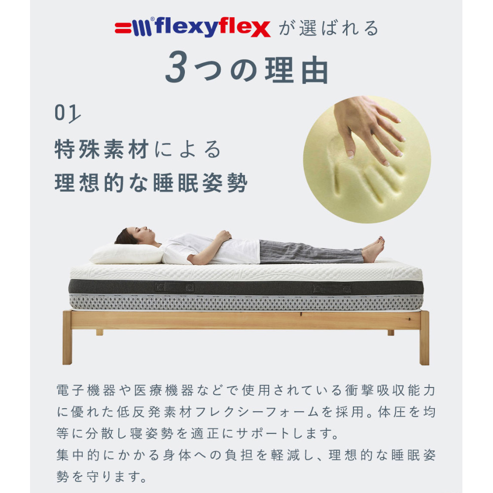 欧州トップクラスの高反発ウレタン採用で、包み込まれるように快適な寝心地。芯材は通気性のよい高反発ウレタン。湿気をため込まず爽やかな寝心地。衝撃吸収力に優れた低反発素材が体圧を分散し理想的な寝姿勢に。カバーは取り外して洗濯機で洗えてお手入れ簡単。flexy flex/フレクシーフレックス1973年設立。寝具先進国イタリア有数のマットレスメーカー。最先端の設備と素材を使い、熟練職人が仕上げた製品は欧州はじめ世界で愛用されています。
