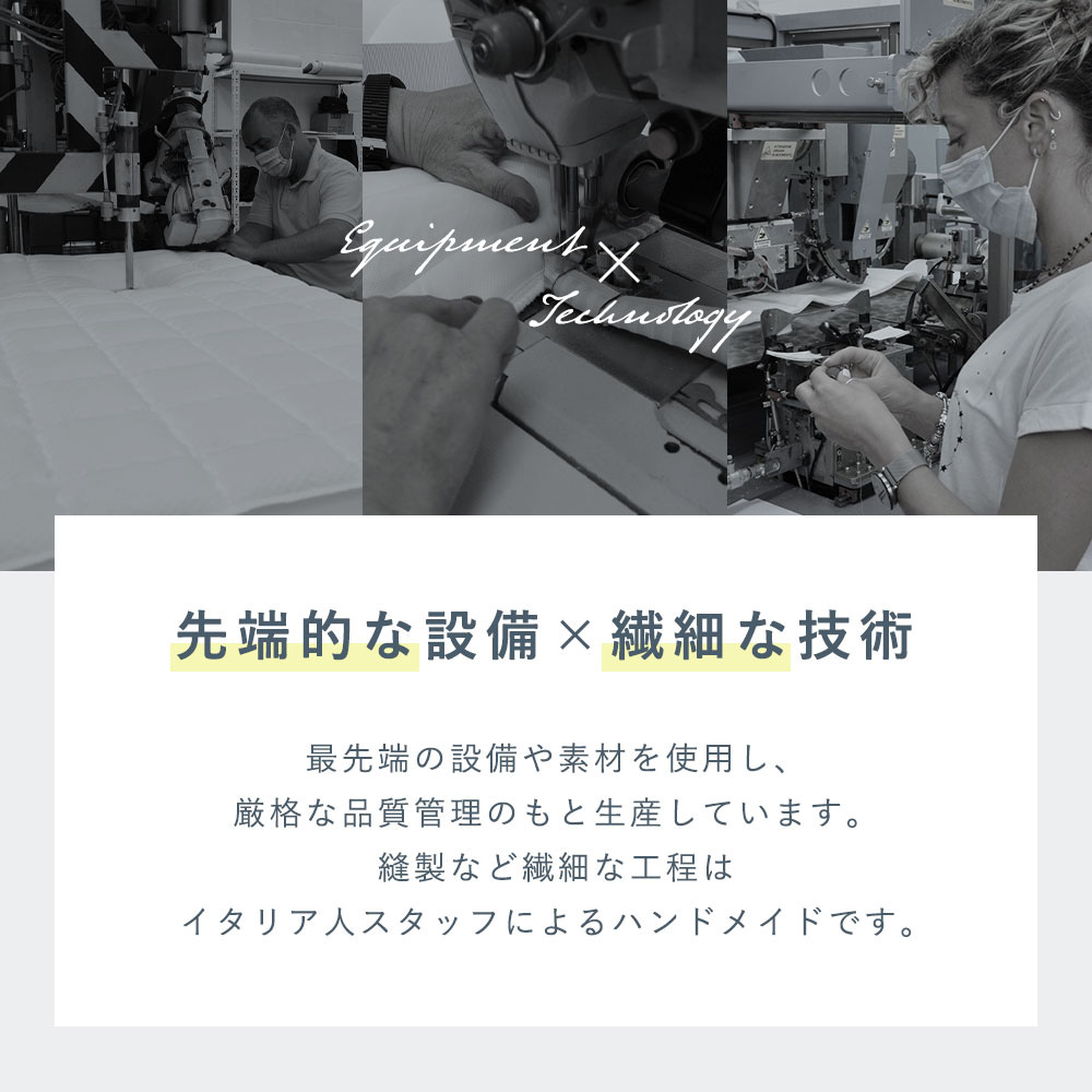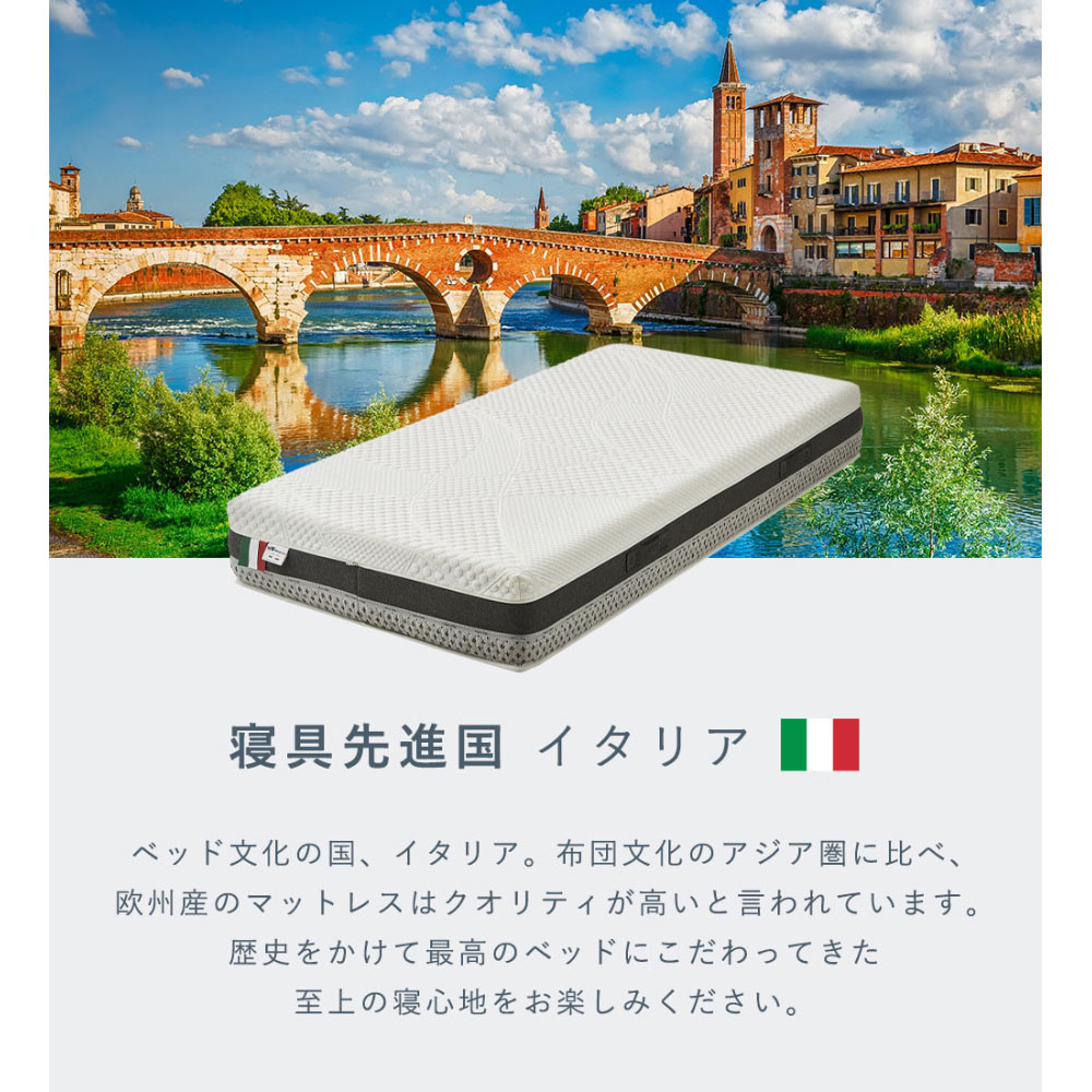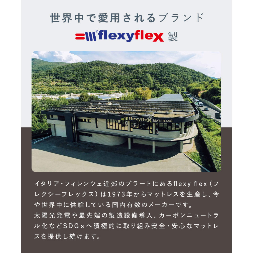欧州トップクラスの高反発ウレタン採用で、包み込まれるように快適な寝心地。芯材は通気性のよい高反発ウレタン。湿気をため込まず爽やかな寝心地。衝撃吸収力に優れた低反発素材が体圧を分散し理想的な寝姿勢に。カバーは取り外して洗濯機で洗えてお手入れ簡単。flexy flex/フレクシーフレックス1973年設立。寝具先進国イタリア有数のマットレスメーカー。最先端の設備と素材を使い、熟練職人が仕上げた製品は欧州はじめ世界で愛用されています。