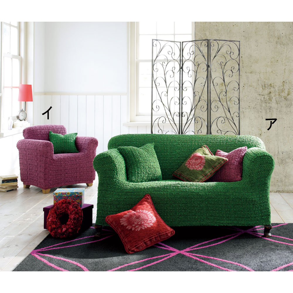 いつものソファに飽きたら、[クルール]の印象的な色で手軽にイメージチェンジ。ぐんっと伸びてソファにぴったりフィットします。差し色としても使いやすい、印象的なニュアンスカラーがソファの存在感を高めます。ちょっと大胆な色もカバーなら挑戦してみる価値あり!(ア)アボカド、(イ)グレープ、(エ)チョコ、(キ)ブルーベリー、(ク)カフェオレの5色は、黒糸とのミックス調になっているので、奥行きのある落ち着いた雰囲気の色合いに。自慢のヨーロッパ製。■スペインのメーカーから直輸入。ディノスのソファカバーは、ソファメーカーが数多く存在するヨーロッパ、中でも、スペインのメーカーが生地生産から縫製まですべての工程を手掛けるため、クオリティの高さと、カラー&デザインの豊富さが魅力です。掛け変え、ラクラク。■ソファにぴったりフィット。お使いのソファにかぶせ、すき間に布を押し込めば出来上がり!よく伸びて掛け替えしやすく、キレイにフィットします。■面倒な手間はいりません。ソファを返したり、裏で結んだりなどの面倒な作業もなく、簡単に掛けられます。