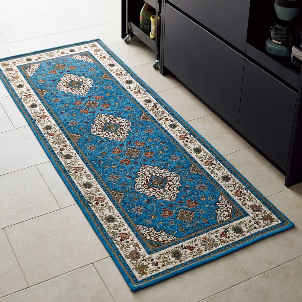 光沢感のある柔らかな手触りと、細密な多色表現されたクラシック柄はイタリアンデザイン。モールのようなシェニール糸で適度なボリューム感がありながら、厚さ約3mmと薄手なので、ご自宅でのお洗濯も簡単。ドアの開閉にも引っかかりにくく邪魔になりません。光沢感のある柔らかな手触りと、細密な多色表現されたクラシック柄はイタリアンデザイン。散りばめられた花々が色鮮やかに美しい、上品な雰囲気です。モールのようなシェニール糸は柔らかな風合いで、適度なボリューム感がありながら、厚さ約3mmと薄手なので、ご自宅でのお洗濯も簡単。ドアの開閉にも引っかかりにくく邪魔になりません。お揃いのクッションカバーとのコーディネートもおすすめです。●ジャカード織とはジャカード織機で織られた織物です。立体的で複雑な柄を作ることができます。織物のため比較的薄手で床との段差もできにくく、折りたたみもしやすいので使わないときの収納にも便利です。【滑りにくい加工について】裏面にすべりにくくするための加工が施されておりますが、使用期間や裏面と接する床面の状態により、効果は一定ではありません。状況により市販の滑り止めとの併用をお勧めします。【ドラム式洗濯機使用不可理由】ドラム式洗濯機の構造上、片寄りが発生しエラーや故障の原因になる可能性があるため、ドラム式洗濯機で洗うことはできません。