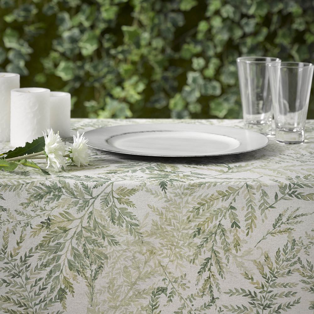 地中海の陽光を受けて可憐に、伸びやかに育った葉をデザインし、はっ水加工を施したスペイン製テーブルクロス。
