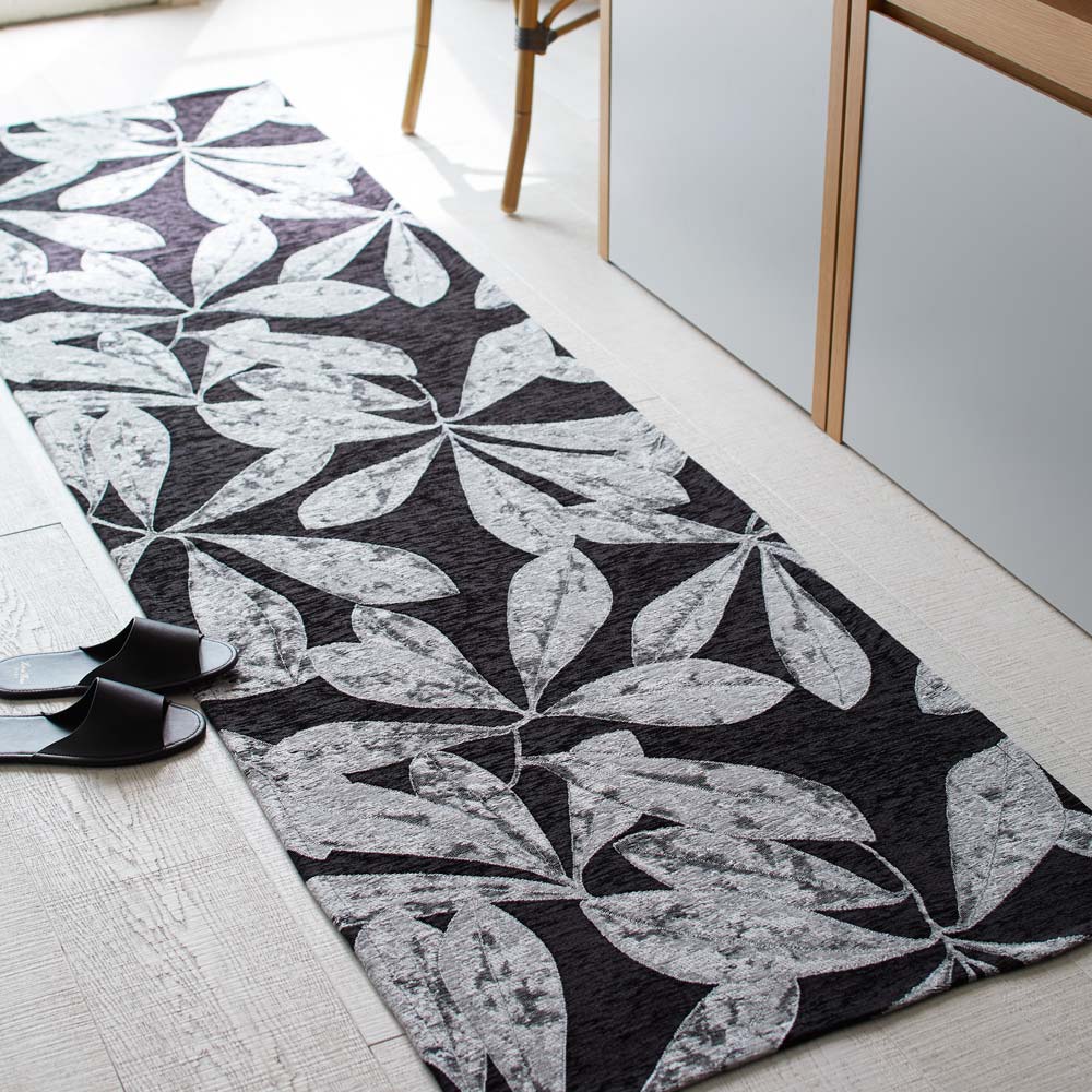 イタリアンデザインならではの大胆なモチーフと繊細な表現力。キッチンにリビングに、使い方広がるロングマット。存在感のある美しいデザインと高い品質。日常に素敵な彩りを添えてくれるマット。自然の優美さを表現したリーフ柄は、見る角度によって表情が変わります。シェニール糸を使ったジャカード織で、適度なボリューム感がありながら厚さ約3ミリと薄手なので、ご自宅でのお洗濯も簡単。ドアの開閉のじゃまにもなりません。同シリーズのラグやソファカバーと、トータルにコーディネートできます。【ポイント1】リーフモチーフシェニール糸を使用したリーフモチーフ。厚さ約3ミリの使いやすいフラットタイプです。【ポイント2】裏面は滑りにくい加工裏面には滑りにくい加工が施されていますので、ズレにくく快適にご使用いただけます。【ポイント3】床暖房対応床暖房のお部屋で使用できます。【ポイント4】丸洗いOK洗濯機で丸洗いできますので、いつも清潔に使えます。※乾燥機・ドラム式洗濯機は使用できません。