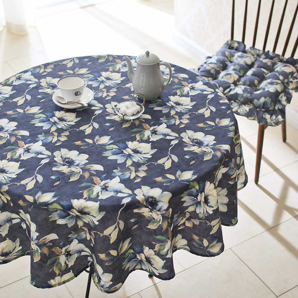 ベロア調の上質な生地に大柄な花柄。フリルのついたチェアパッドもお揃いで華やかなテーブルセッティングに。スペイン製のサイズ展開豊富なテーブルクロス。柄行きは華やかに、色合いはシックに、華やかながら大人らしさを残したお洒落なデザインで空間を上品に演出。日常の食卓はもちろん、おもてなしの場にもぴったりです。チェアパッドと組み合わせても素敵です。●汚れても丸洗いOK!汚れたら気軽に洗濯機で洗えるのでいつでも清潔にお使いいただけます。屋外でのガーデンパーティーでも活躍しそう。卓上に飾る花でより一層の彩りを添えそうです。豊富なサイズ展開正方形・長方形3サイズと円形145cmの4タイプ。同柄のテーブルランナーは長さ3サイズ展開で、どんなテーブルにもマッチします。