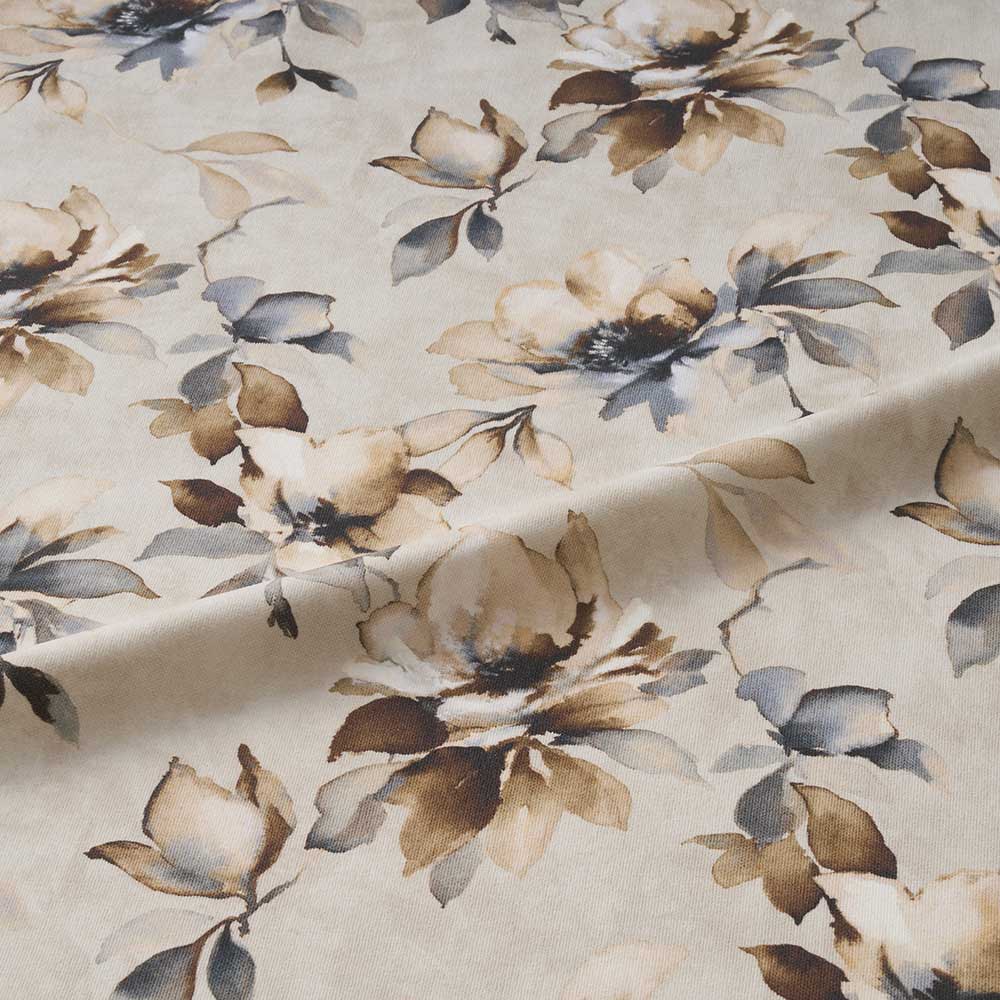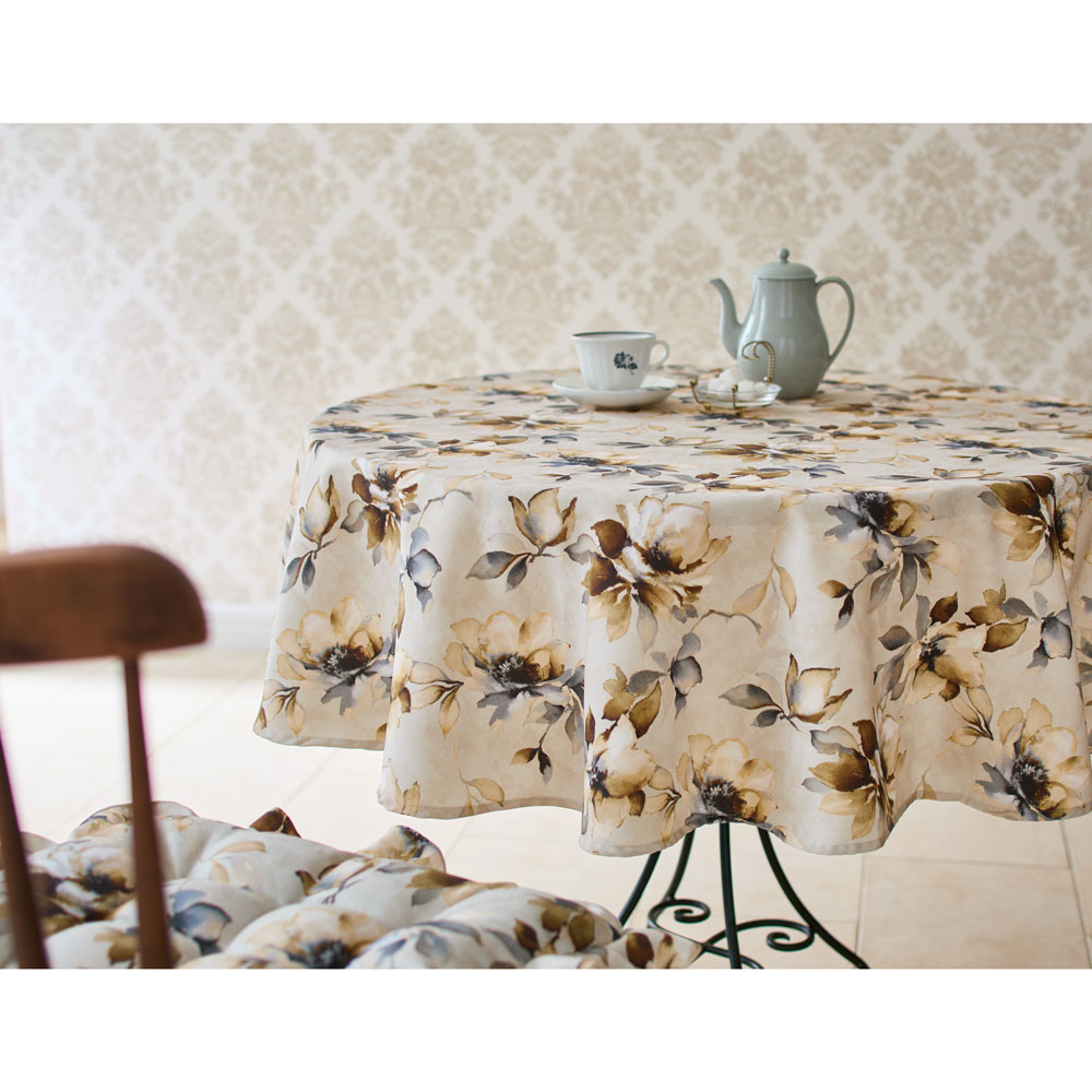 ベロア調の上質な生地に大柄な花柄。フリルのついたチェアパッドもお揃いで華やかなテーブルセッティングに。スペイン製のサイズ展開豊富なテーブルクロス。柄行きは華やかに、色合いはシックに、華やかながら大人らしさを残したお洒落なデザインで空間を上品に演出。日常の食卓はもちろん、おもてなしの場にもぴったりです。チェアパッドと組み合わせても素敵です。●汚れても丸洗いOK!汚れたら気軽に洗濯機で洗えるのでいつでも清潔にお使いいただけます。屋外でのガーデンパーティーでも活躍しそう。卓上に飾る花でより一層の彩りを添えそうです。豊富なサイズ展開正方形・長方形3サイズと円形145cmの4タイプ。同柄のテーブルランナーは長さ3サイズ展開で、どんなテーブルにもマッチします。