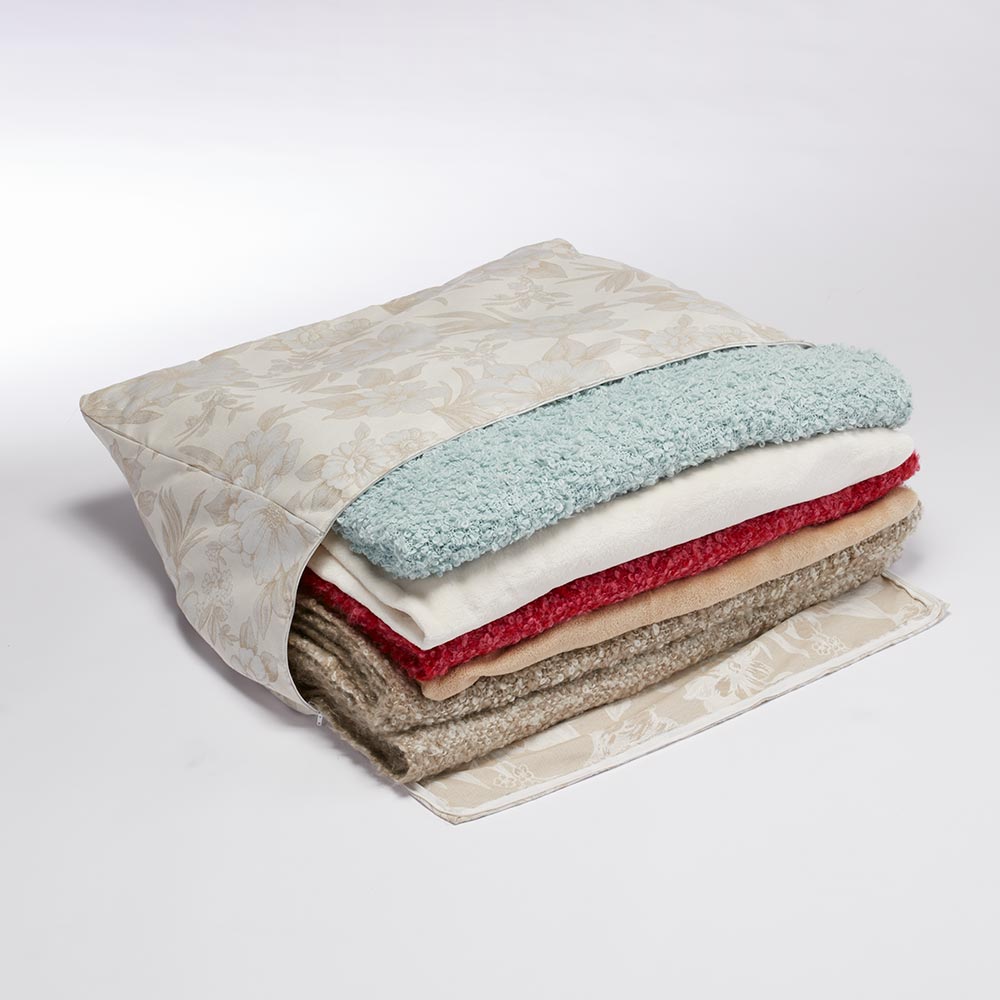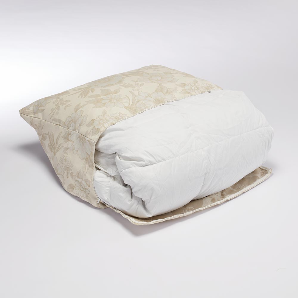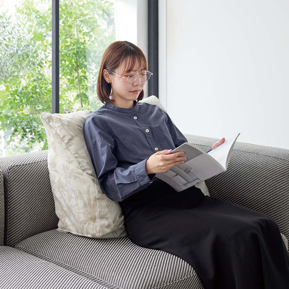 収納場所を取るオフシーズンの掛け布団が、ラグジュアリーなクッションに変身。ちょっと背もたれが欲しいときの相棒として活躍します。