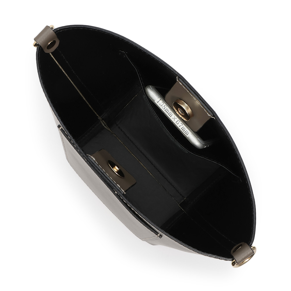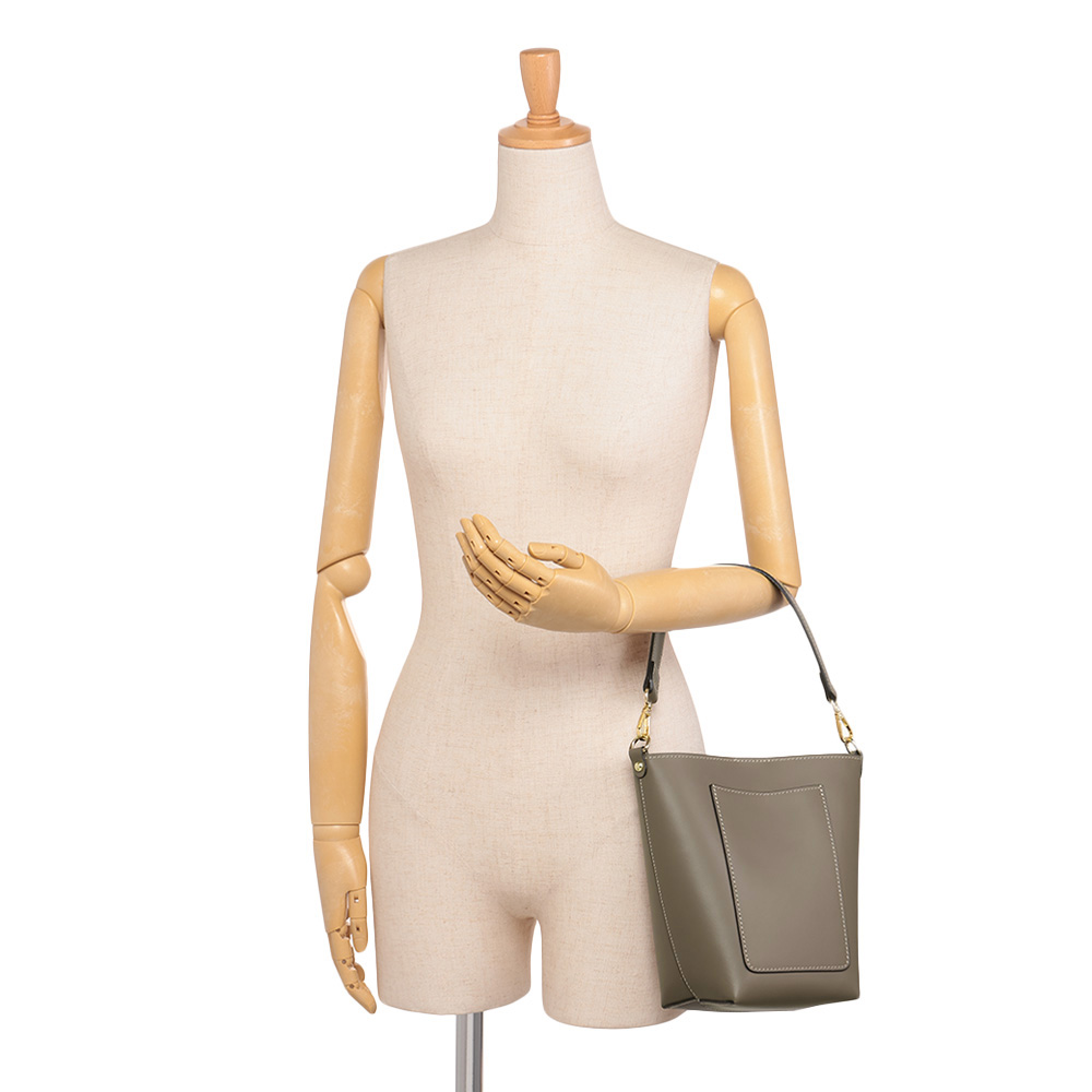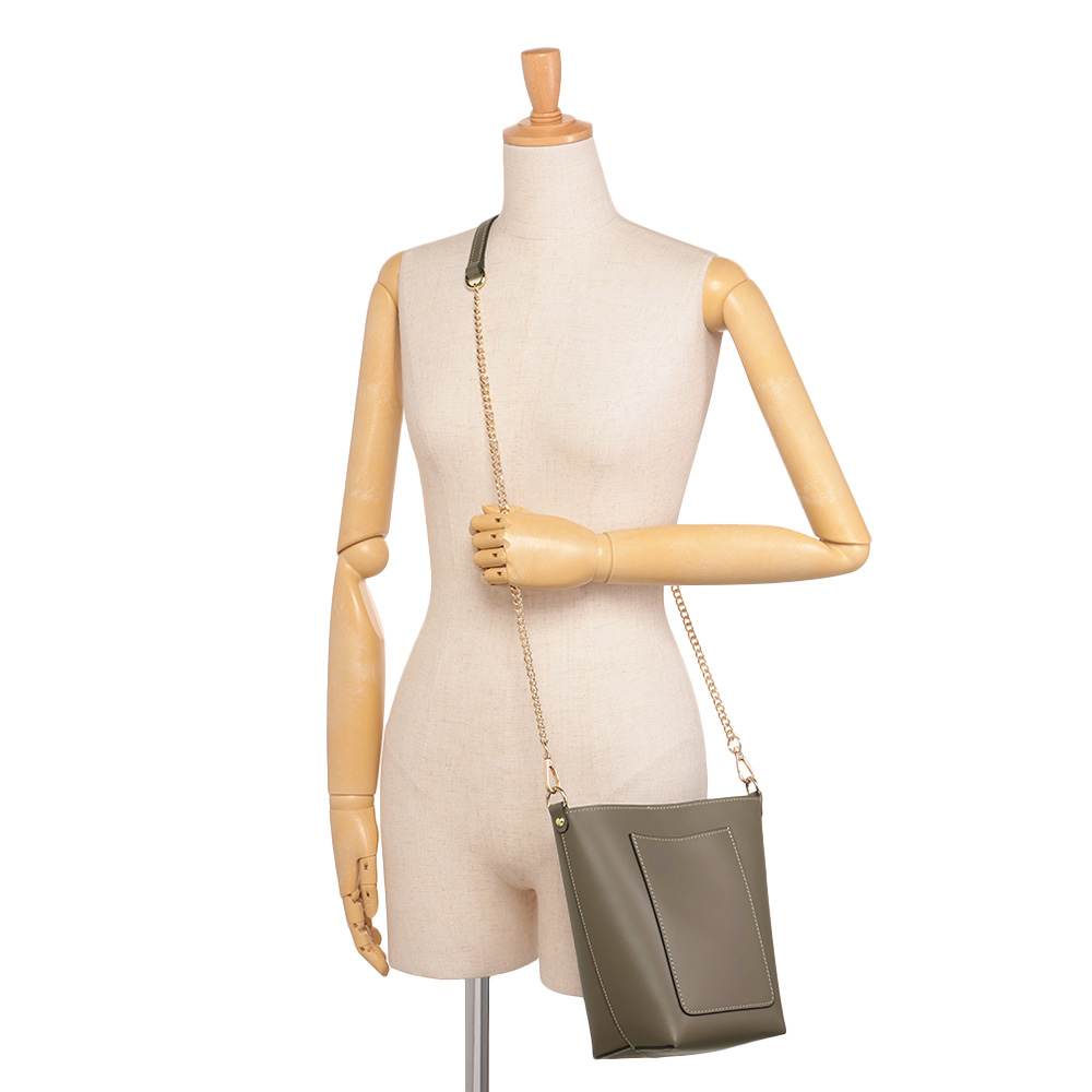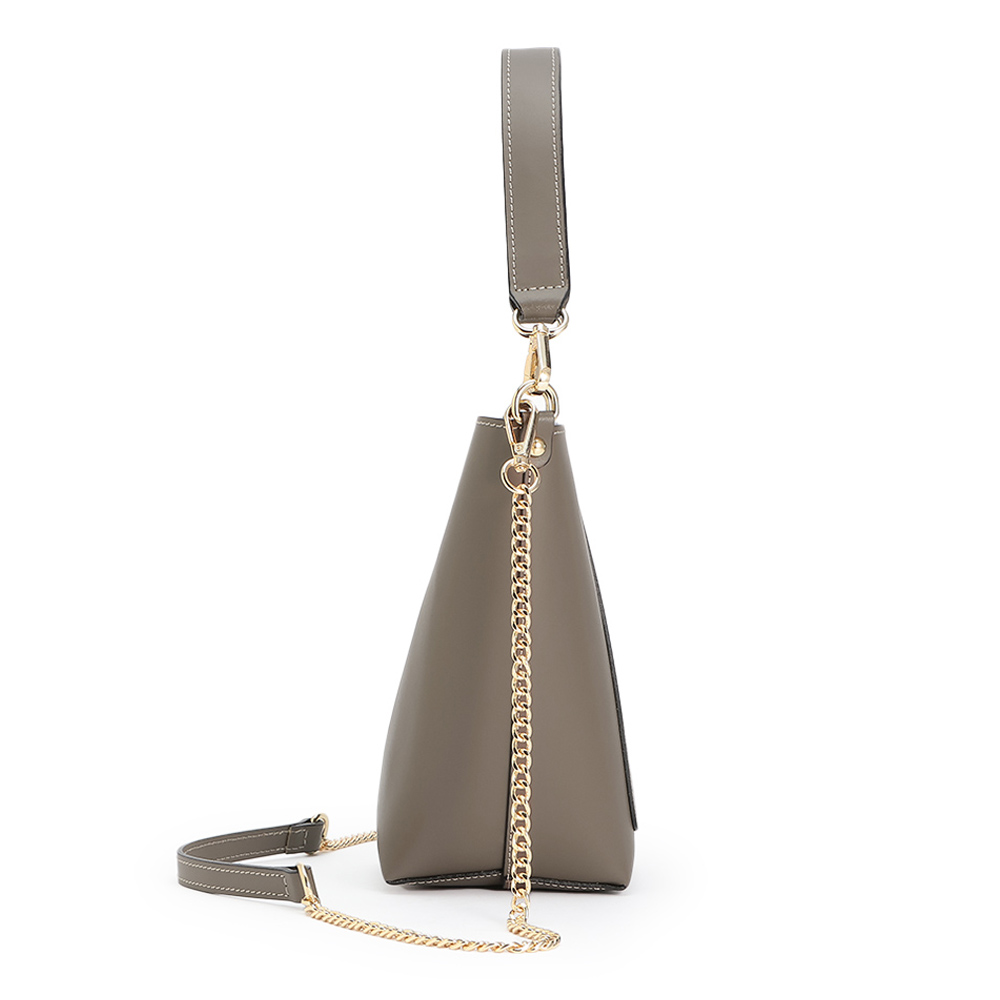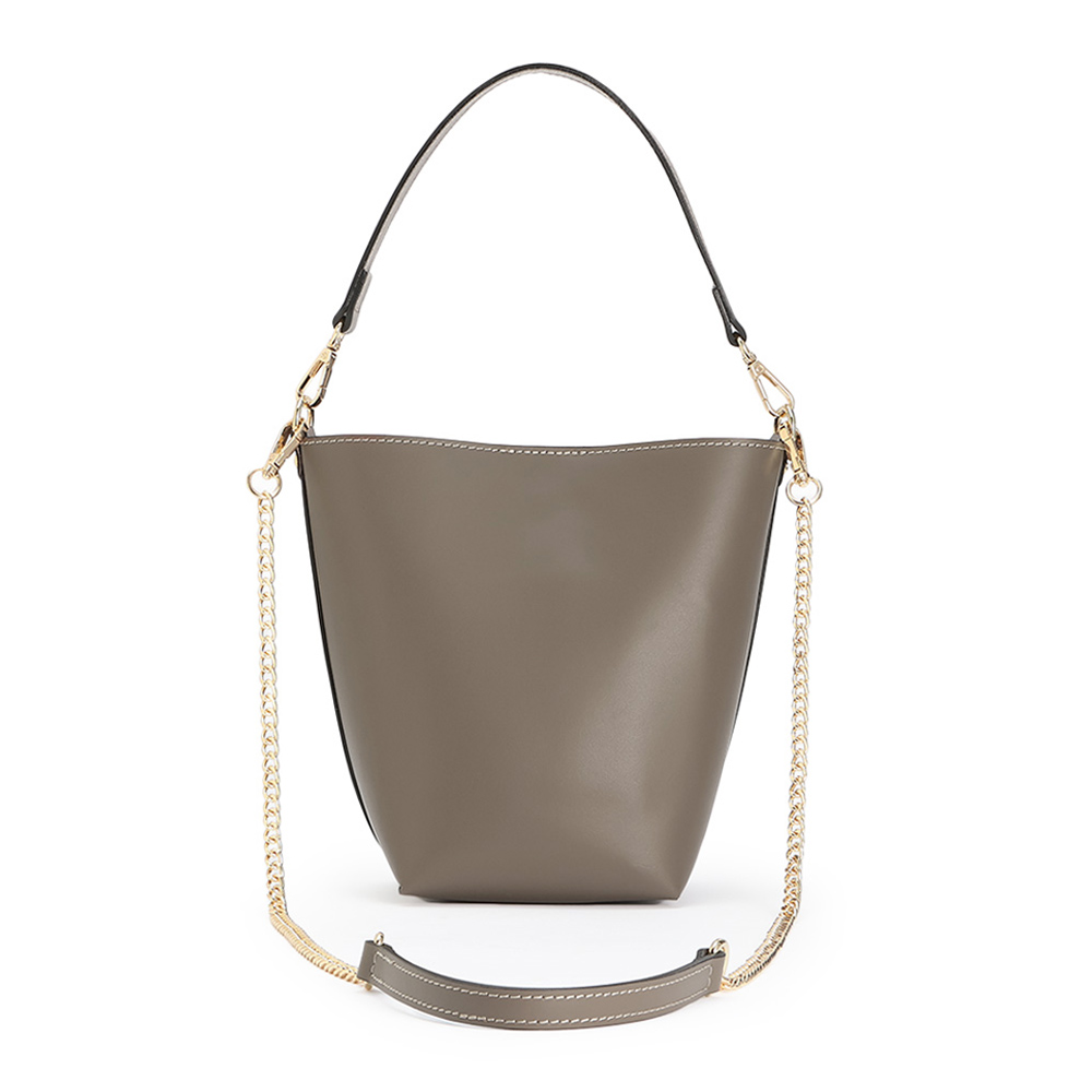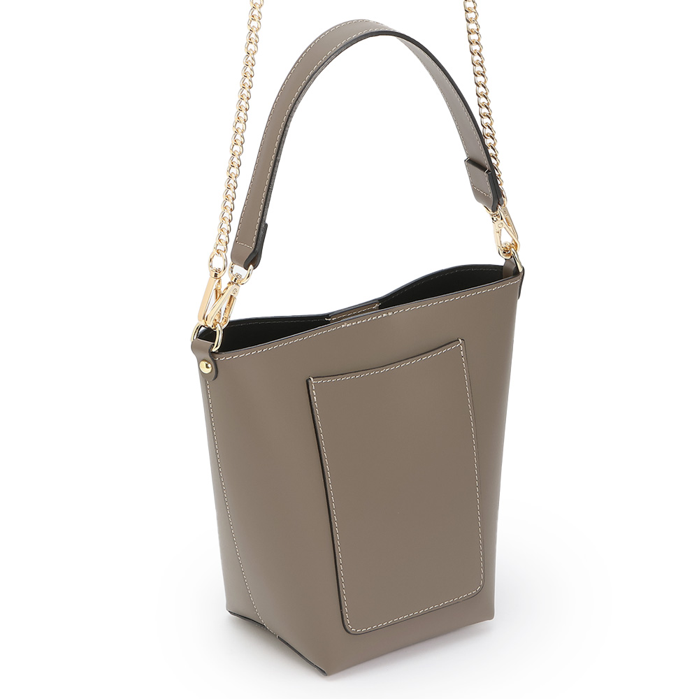 お出かけが楽しくなる BAGチェーンショルダー付きできれいめにアレンジできる2WAY仕様。イタリアンレザーならではの発色のよさと、しなやかさが上品な印象を与えます。コロンとした可愛らしいバケツ型で、開口部が大きく開き荷物の出し入れがしやすいのもポイント。ニュアンスカラーがコーディネートになじみます。