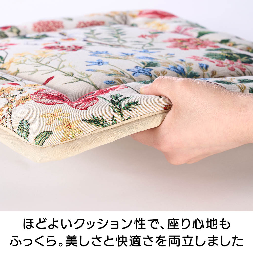 色とりどりの花模様を繊細に織り込んだジャガード織のシートクッションです。プリントでは味わえない高級感と立体感が魅力。いつものソファやベンチに置くだけでエレガントな空間を演出します。ほどよい厚みがあるので座り心地もアップして、気分まで優雅に。いつものソファに置くだけで空間がパッと華やぐ、心躍る美しいジャカード織3人掛けのソファに敷けば、主役級のアクセントに。華やかなデザインが空間をおしゃれに彩り、心踊る優雅なインテリアを手軽に味わえます。用途で選べる3つのサイズをご用意。床に置いて使うのも◎1人用を色違いで揃えてフローリングに直接置いて使うのも素敵。厚みのある生地で耐久性もあるので、お好みのスタイルで心地よくお使いいただけます。ほどよいクッション性で、座り心地もふっくら。美しさと快適さを両立しましたジャガード織ならではの美しさに加え、適度なクッション性で座り心地をアップするメリットも。美しさと快適さを両立した優秀なクッションシートです。目に入るたび、ココロ華やぐ。立体感のある美しいジャガード織繊細な花模様を立体的に織り上げた、美しいジャガード織ならではの織りの風合いと重厚感が空間に彩りを添えます。華やかでありながら、落ち着きのあるシックな色使いと品のある仕上がりが魅力です。