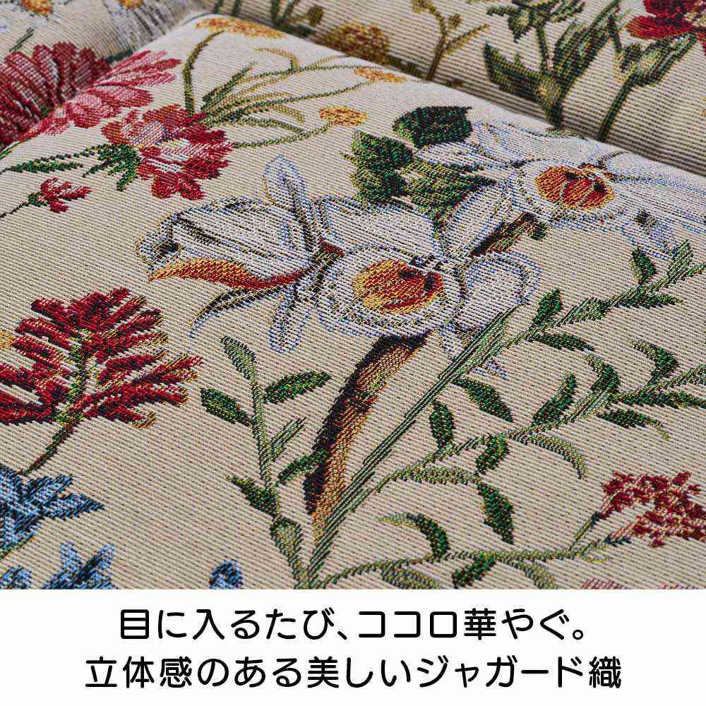 色とりどりの花模様を繊細に織り込んだジャガード織のシートクッションです。プリントでは味わえない高級感と立体感が魅力。いつものソファやベンチに置くだけでエレガントな空間を演出します。ほどよい厚みがあるので座り心地もアップして、気分まで優雅に。いつものソファに置くだけで空間がパッと華やぐ、心躍る美しいジャカード織3人掛けのソファに敷けば、主役級のアクセントに。華やかなデザインが空間をおしゃれに彩り、心踊る優雅なインテリアを手軽に味わえます。用途で選べる3つのサイズをご用意。床に置いて使うのも◎1人用を色違いで揃えてフローリングに直接置いて使うのも素敵。厚みのある生地で耐久性もあるので、お好みのスタイルで心地よくお使いいただけます。ほどよいクッション性で、座り心地もふっくら。美しさと快適さを両立しましたジャガード織ならではの美しさに加え、適度なクッション性で座り心地をアップするメリットも。美しさと快適さを両立した優秀なクッションシートです。目に入るたび、ココロ華やぐ。立体感のある美しいジャガード織繊細な花模様を立体的に織り上げた、美しいジャガード織ならではの織りの風合いと重厚感が空間に彩りを添えます。華やかでありながら、落ち着きのあるシックな色使いと品のある仕上がりが魅力です。