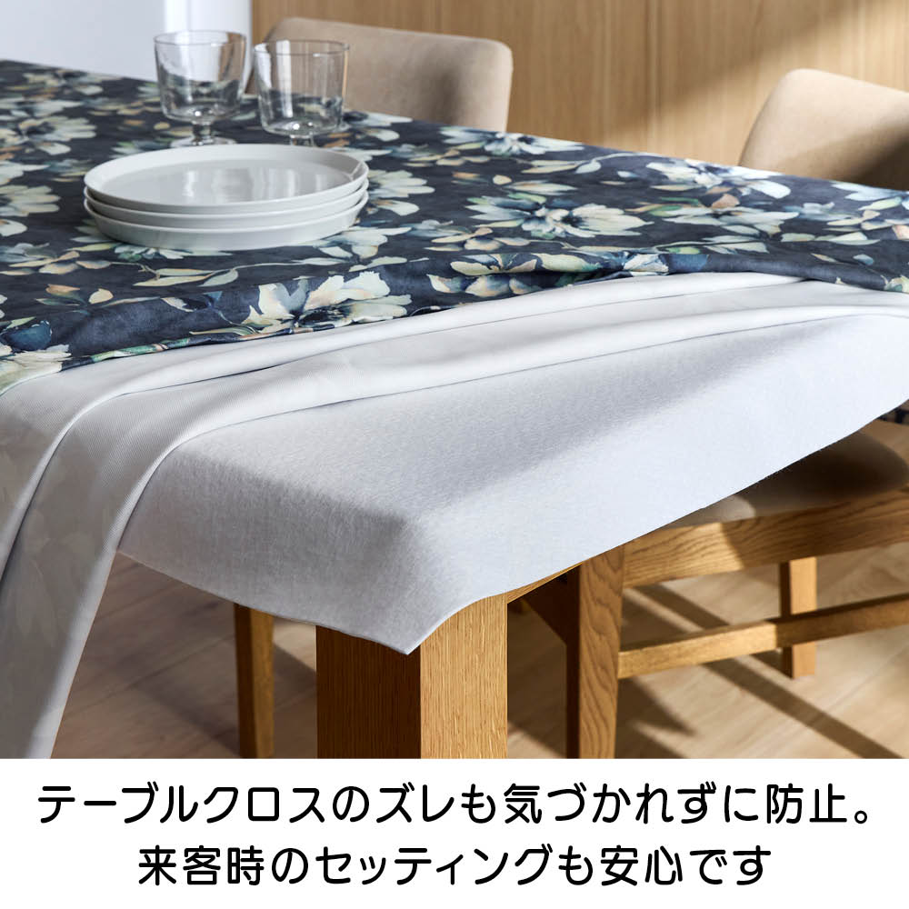 テーブルクロスのズレも気づかれずに防止。来客時のセッティングも安心ですズレてしまうことがあるテーブルクロスも、ファブリックストッパーをクロスとテーブルの間に敷くだけでOK。フェルト素材のため、食器などを置く音も柔らかくなります。