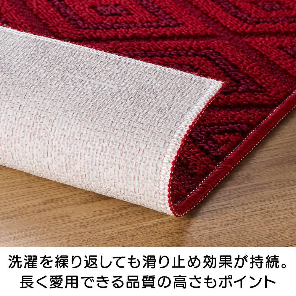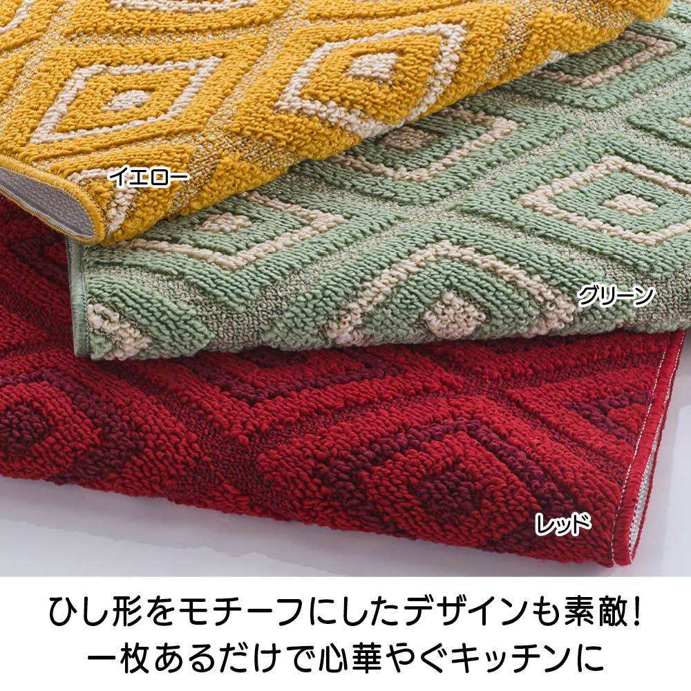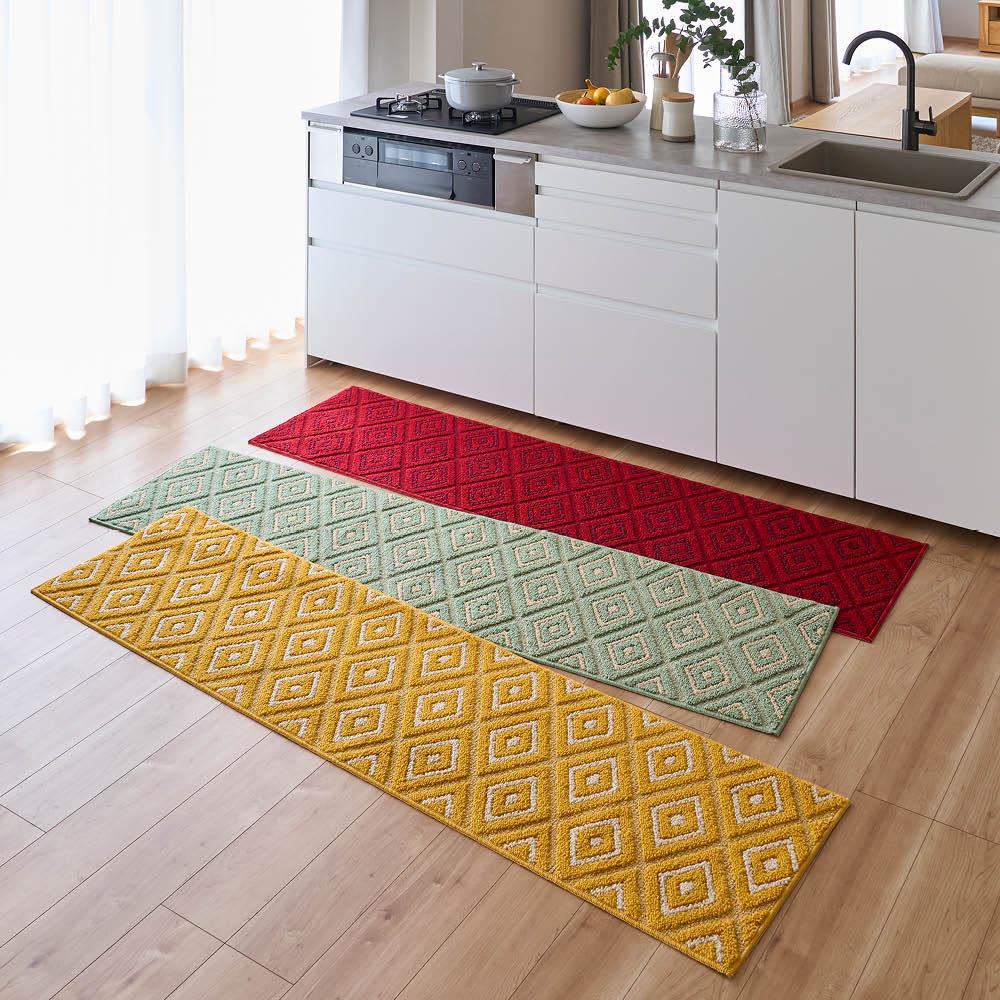 イタリアンカラーがキッチンを華やかに彩るキッチンマットです。特筆すべきはレッド、イエロー、グリーンそれぞれの発色の美しさ。よく見ると光沢糸が繊細にさりげなく織り込まれており、ひと味違うラグジュアリーな質感はさすがイタリア。上質な彩りをお楽しみください。キッチンをもっとときめく空間に!イタリアンカラーのキッチンマットほどよく扱いやすい厚みと空間が華やぐデザイン性が魅力です。丈夫で弾力性のあるポリプロピレン素材で、踏み心地が良く、お手入れしやすいのも◎。裏面の滑り止め機能は、繰り返し洗濯しても効果が持続します。(写真は50×190cm)レッド×パープルの色彩が新鮮!洗練された色使いがキッチンを華やかにセンスアップレッドにパープルを組み合わせたイタリアならではの絶妙な配色が、華やかでありながら、シックで大人の雰囲気を醸し出します。ビタミンカラーに気品をプラス。敷くだけでキッチンがパッと明るい雰囲気にベージュの柄をかけあわせたイエローは、キッチンを爽やかに彩るカラー。モダンで鮮やかな色が、毎日をワクワク楽しい気分に変えてくれそうです。ライトなグリーンにベージュの模様を合わせ、やさしく上品な空間を演出柔らかいトーンのグリーンにベージュの柄を重ね、やさしく洗練された印象に。キッチンに自然と調和し、センスの光る配色です。洗濯を繰り返しても滑り止め効果が持続。長く愛用できる品質の高さもポイント裏面の滑り止めは洗っても効果が落ちにくく、へたりにくい点も魅力です。長く、気持ちよく使えるキッチンマットです。ひし形をモチーフにしたデザインも素敵!一枚あるだけで心華やぐキッチンにすべての柄に光沢糸を繊細に縫い込み、奥行き感と華やかさを両立しました。凹凸感のあるひし形モチーフのデザインが、おしゃれで洗練されたアクセントになっています。