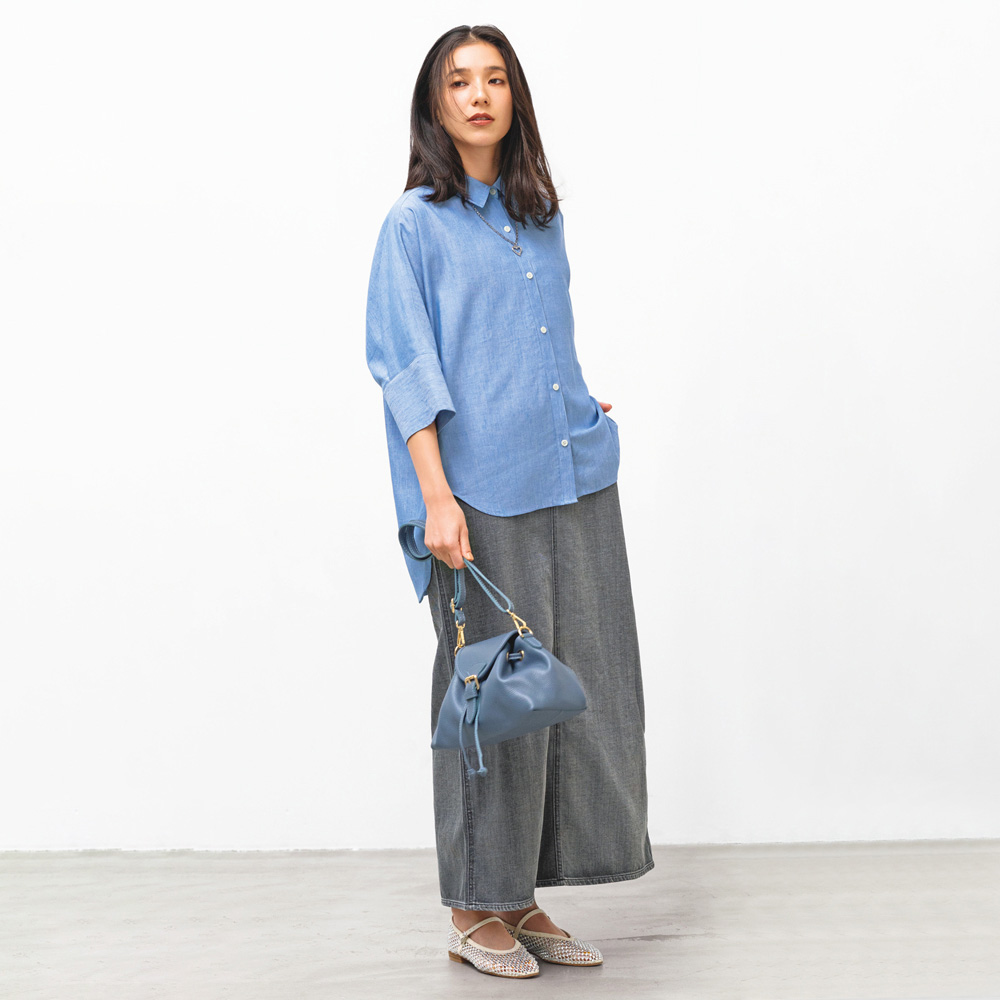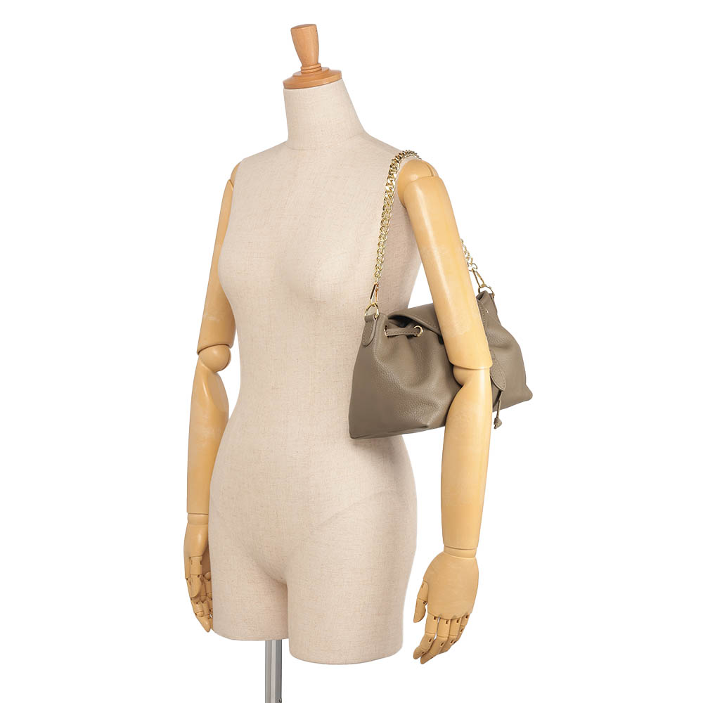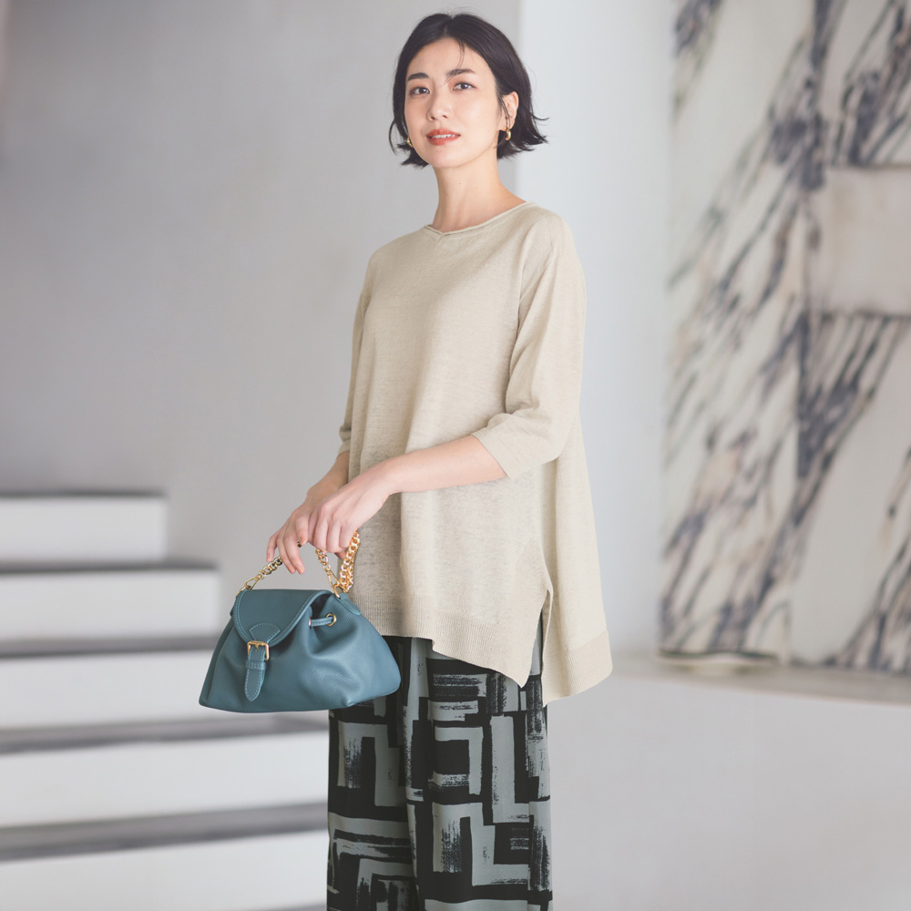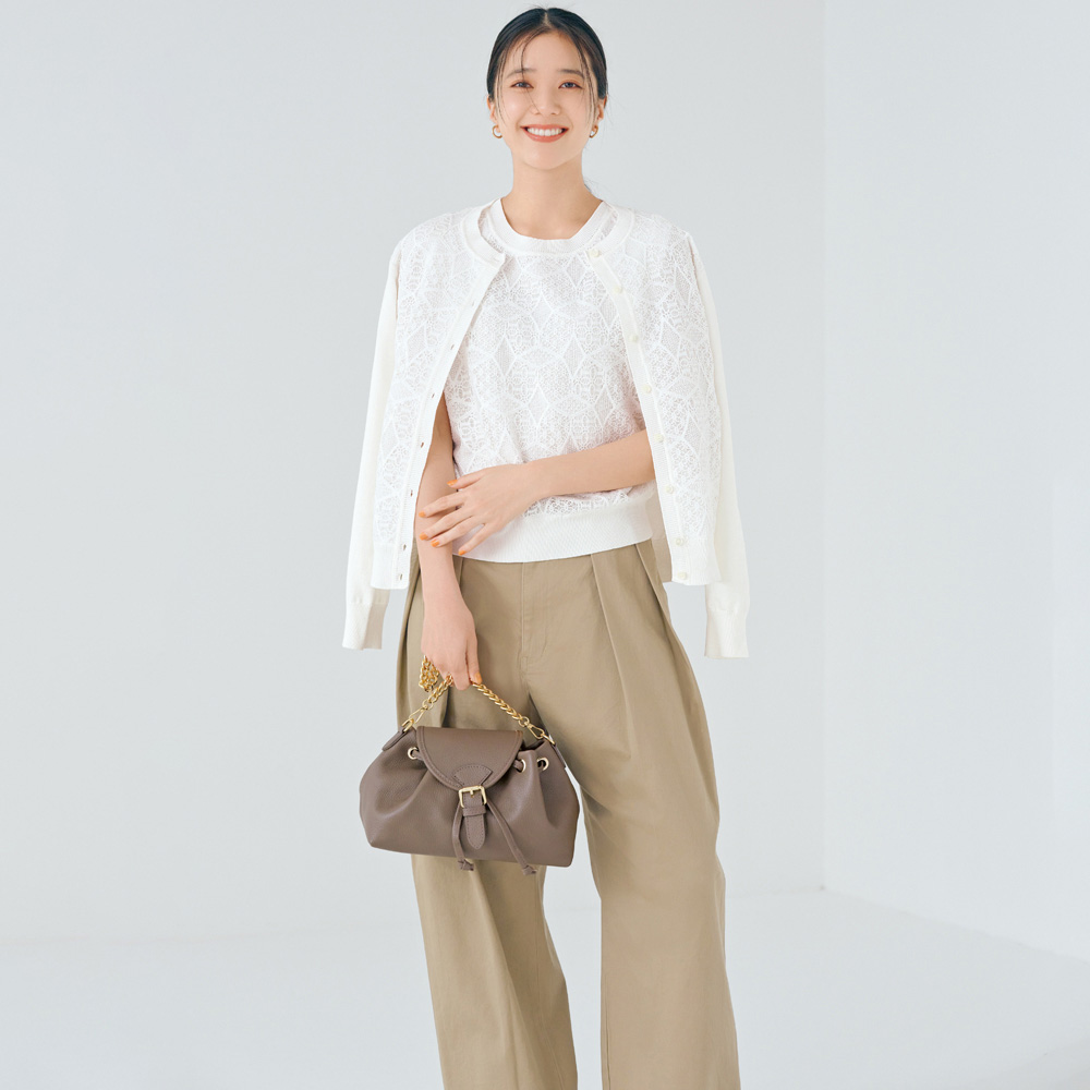 夏のコーディネートを一気にアップデートする、バッグをご紹介。取り入れるだけで季節感と鮮度が高まります。巾着+かぶせマグネットホック式開閉の牛革バッグ。小ぶりながらマチがたっぷりある台形シルエットです。持ち手のチェーンは取り外しができ、牛革のショルダーストラップとつけ替えることも可能。気分やシーンによってコーディネートの幅を広げてくれます。くすみ系のカラーもおしゃれ。