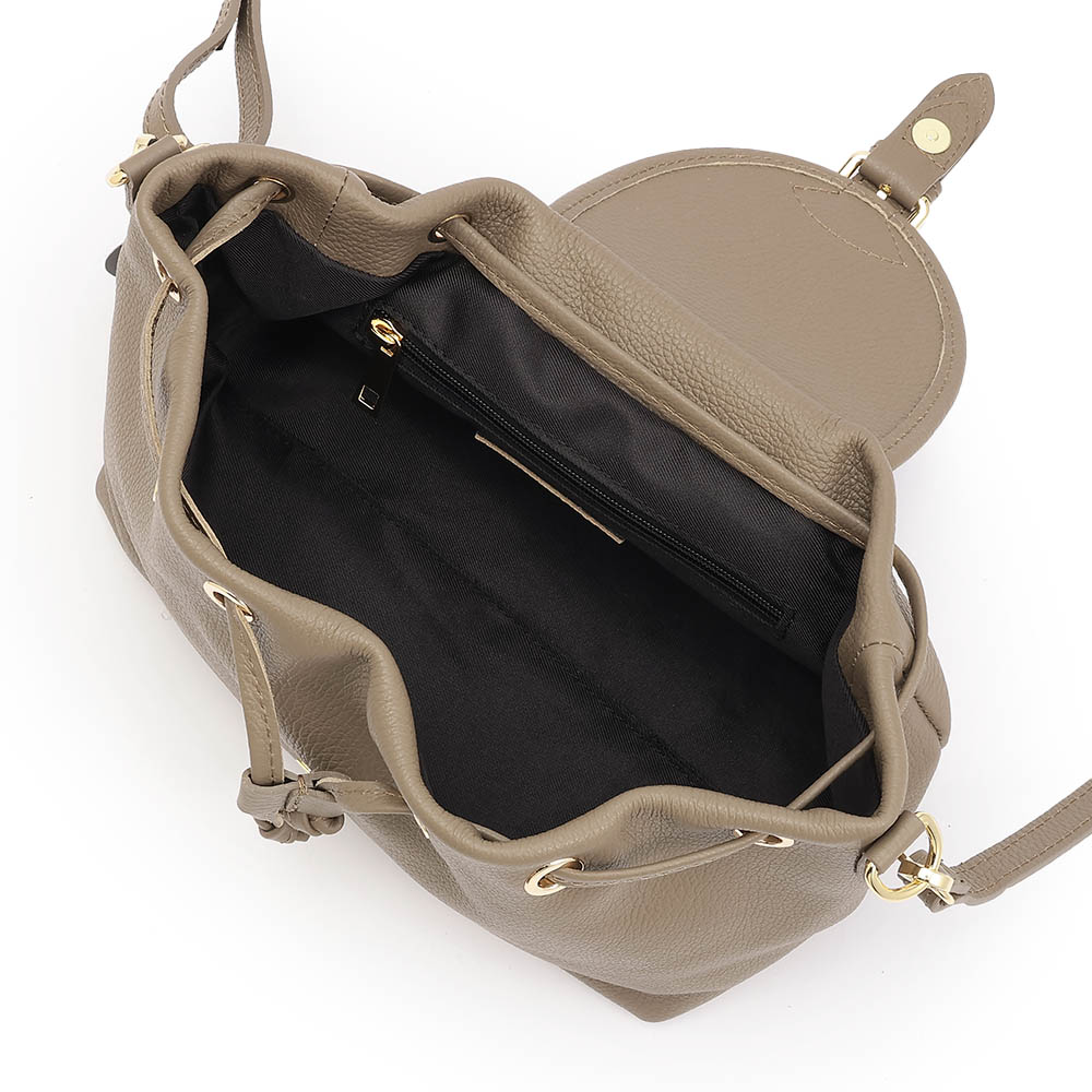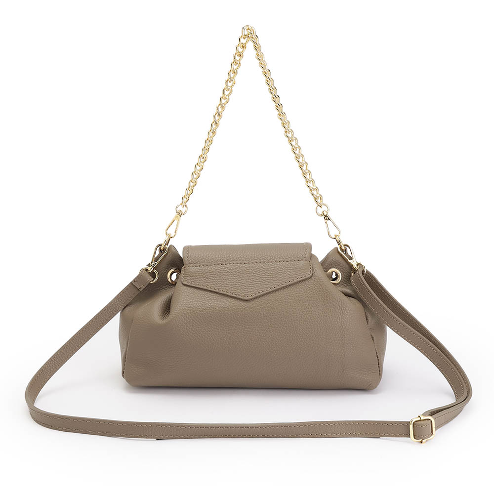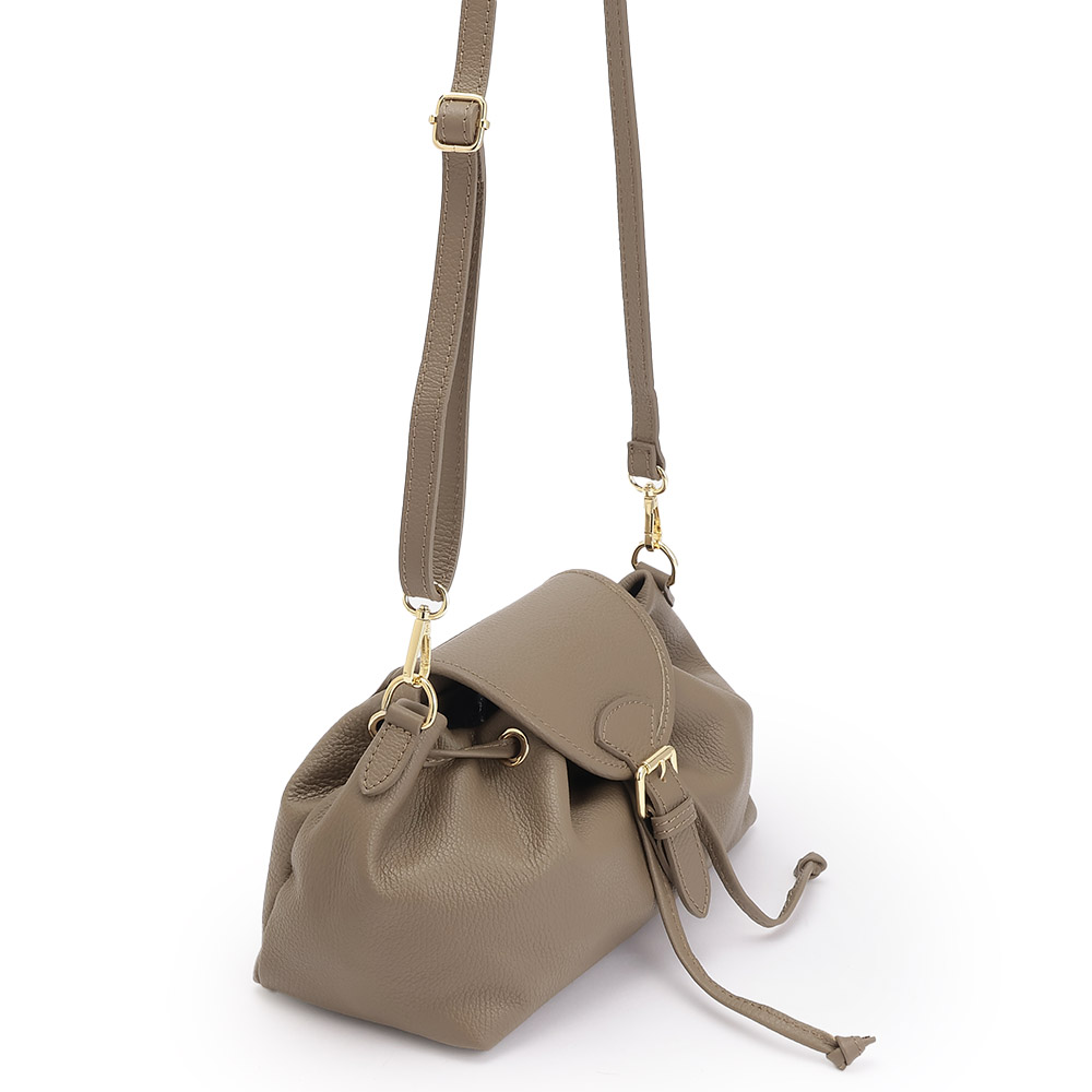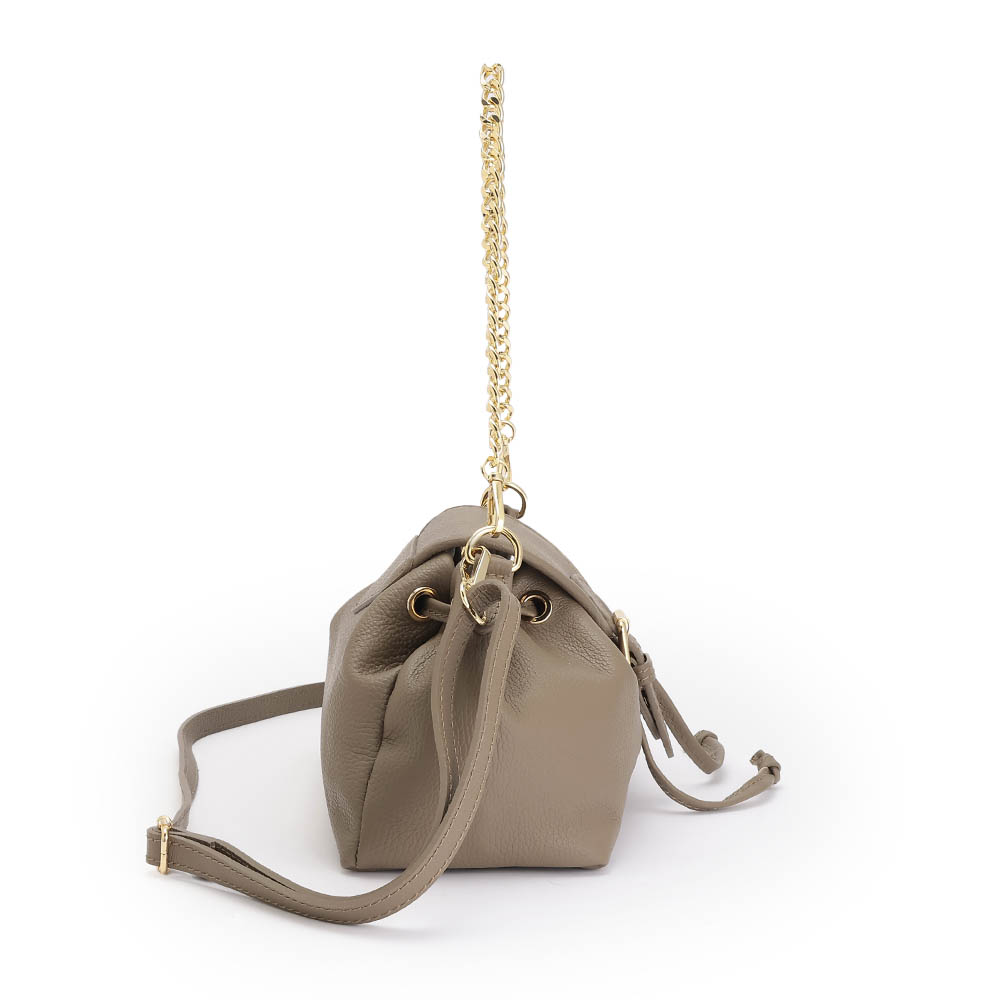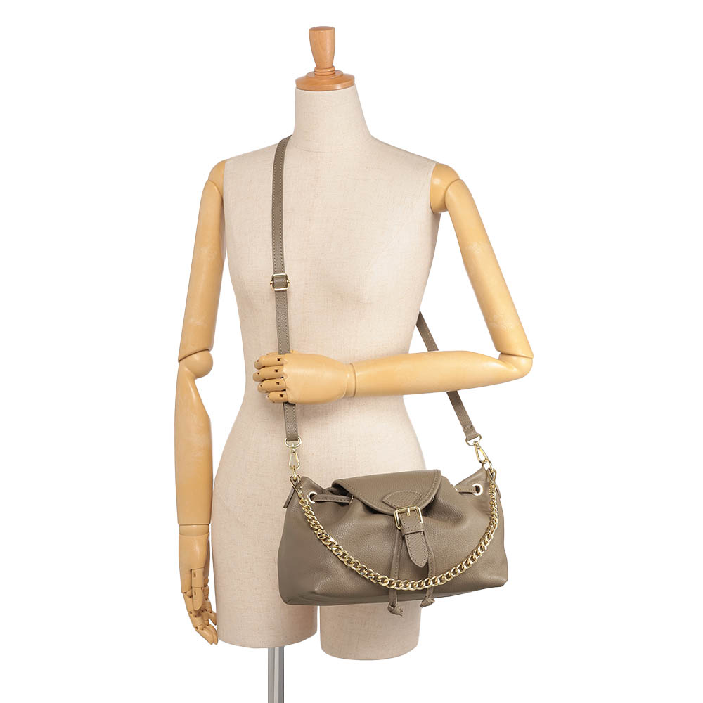 夏のコーディネートを一気にアップデートする、バッグをご紹介。取り入れるだけで季節感と鮮度が高まります。巾着+かぶせマグネットホック式開閉の牛革バッグ。小ぶりながらマチがたっぷりある台形シルエットです。持ち手のチェーンは取り外しができ、牛革のショルダーストラップとつけ替えることも可能。気分やシーンによってコーディネートの幅を広げてくれます。くすみ系のカラーもおしゃれ。