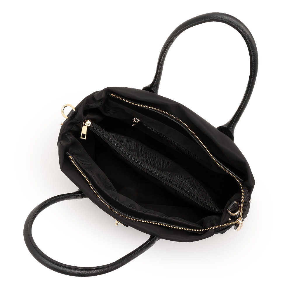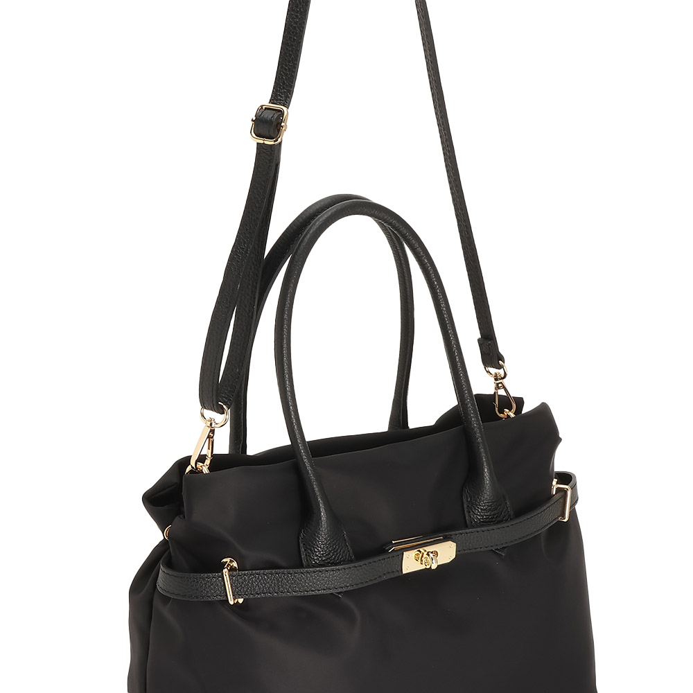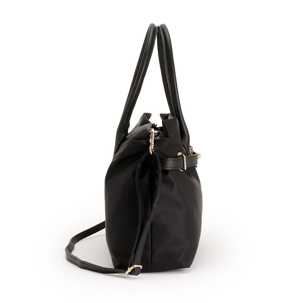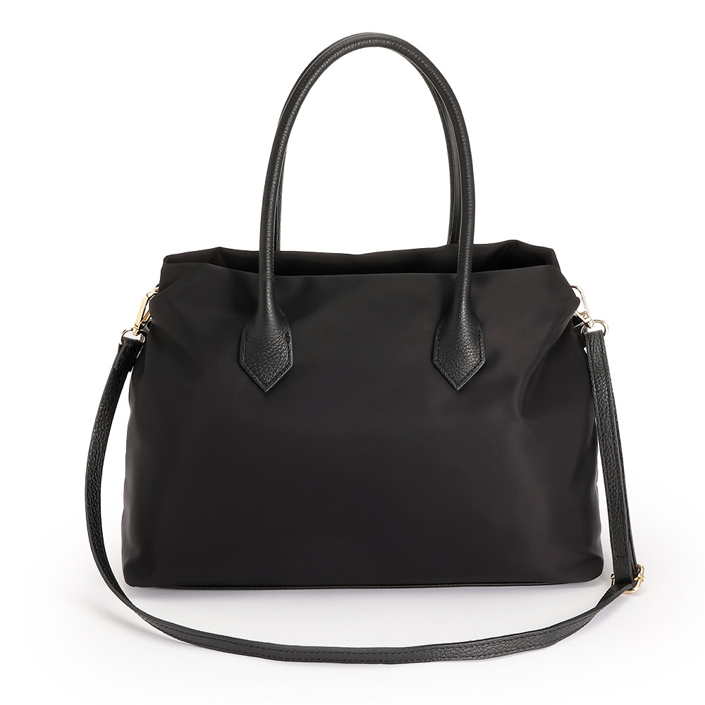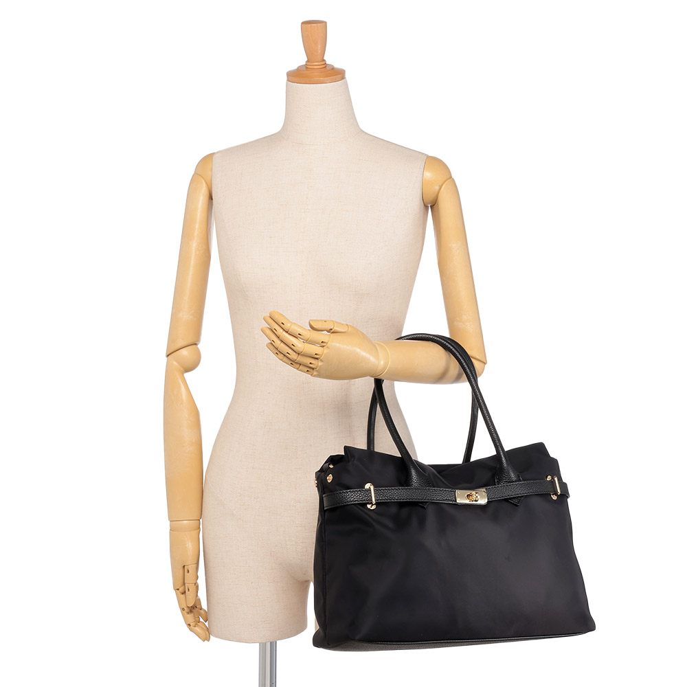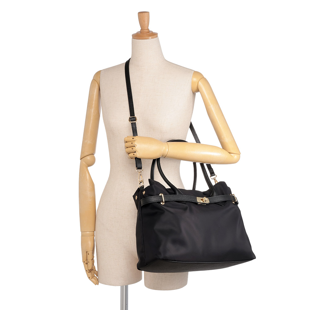 夏のコーディネートを一気にアップデートする、バッグをご紹介。取り入れるだけで季節感と鮮度が高まります。牛革とナイロン素材のコンビバッグ。持ち運びしやすい軽量感が魅力で、牛革のベルトデザイン&ショルダーストラップが高級感たっぷり。金具も華やかなゴールドカラーを使用しています。ファスナー式で大きく開き、ポケットが多いため収納力◎。ファイルなども入るサイズ感でお仕事用にもおすすめです。