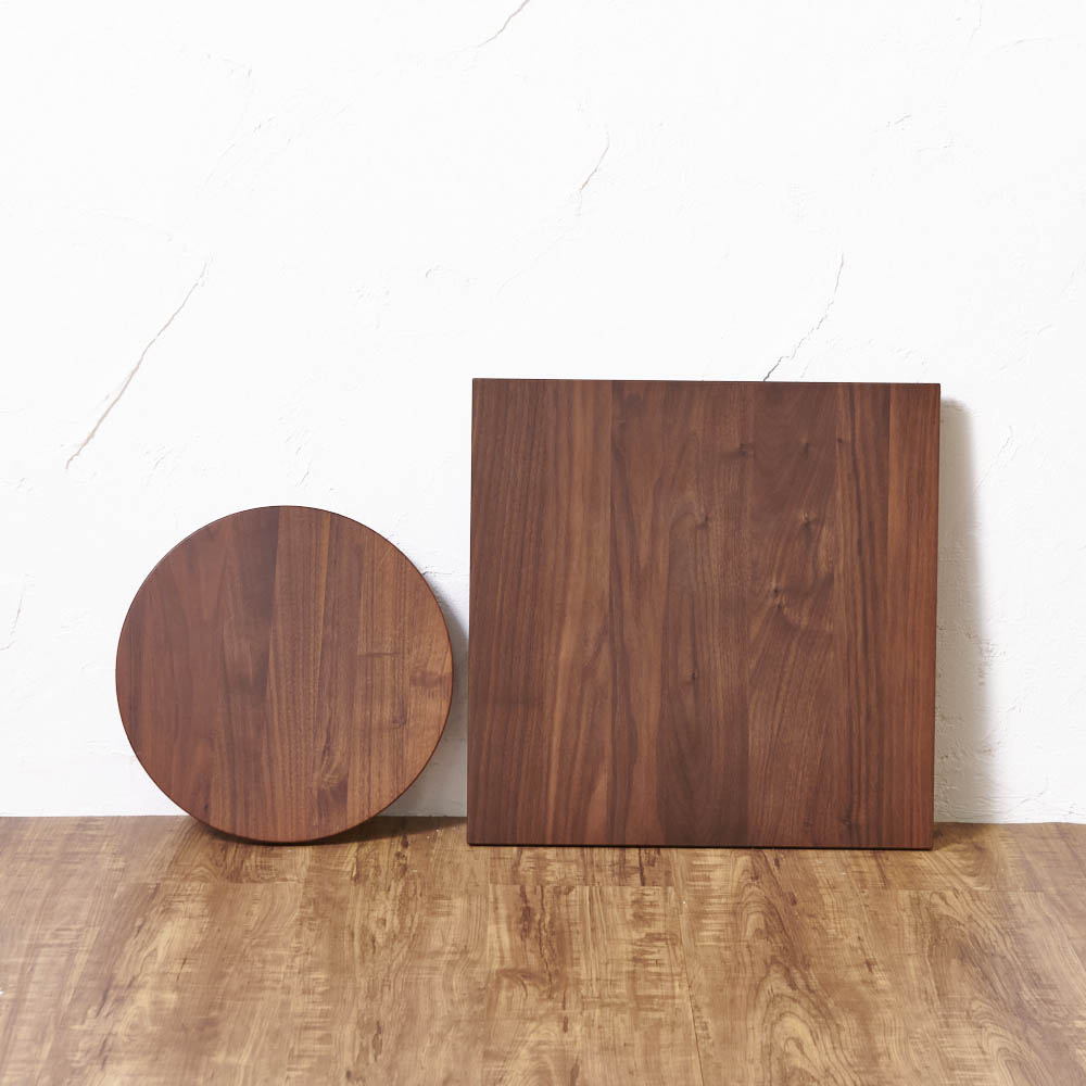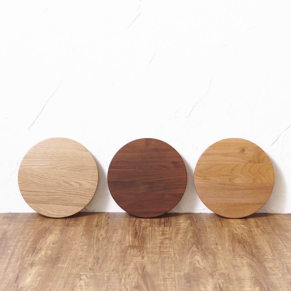 サイズは、丸型24cm、29cm、角型40cmの3サイズ、樹種はホワイトオーク、ウォルナット、アルダーの3種をご用意しています。