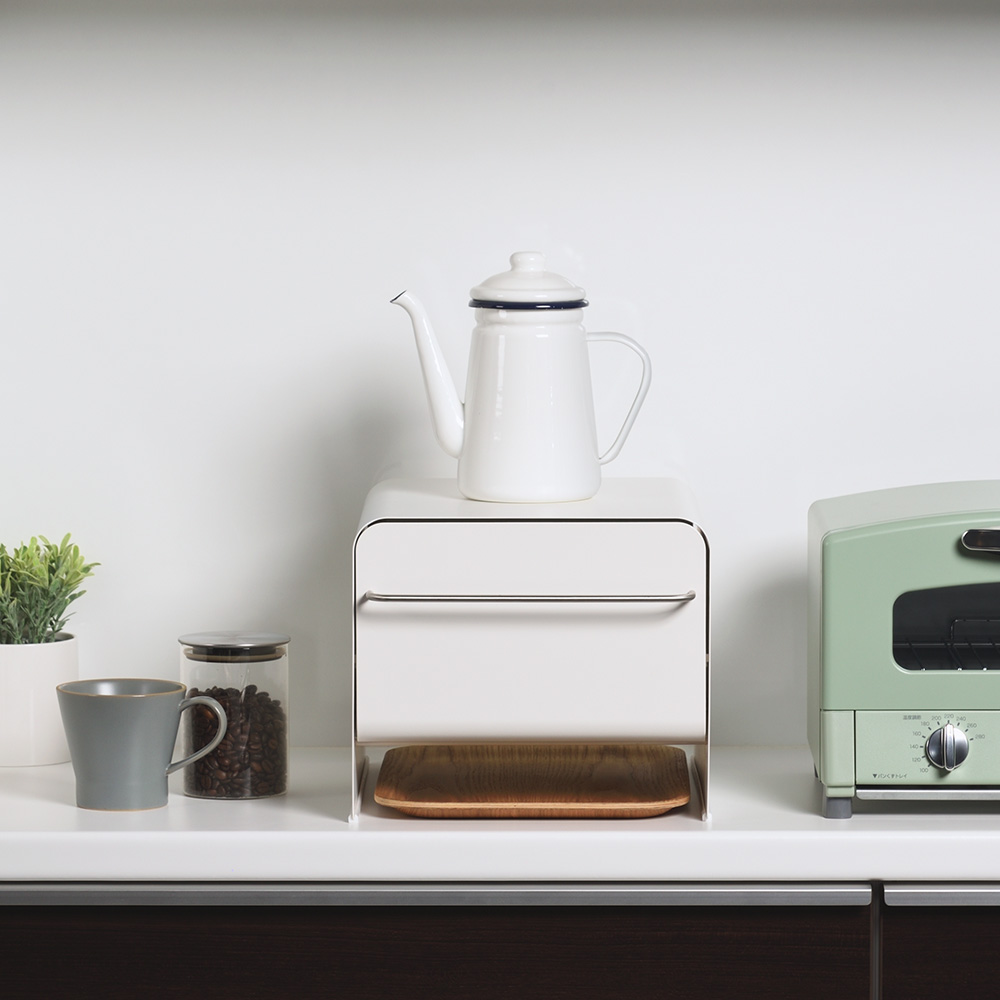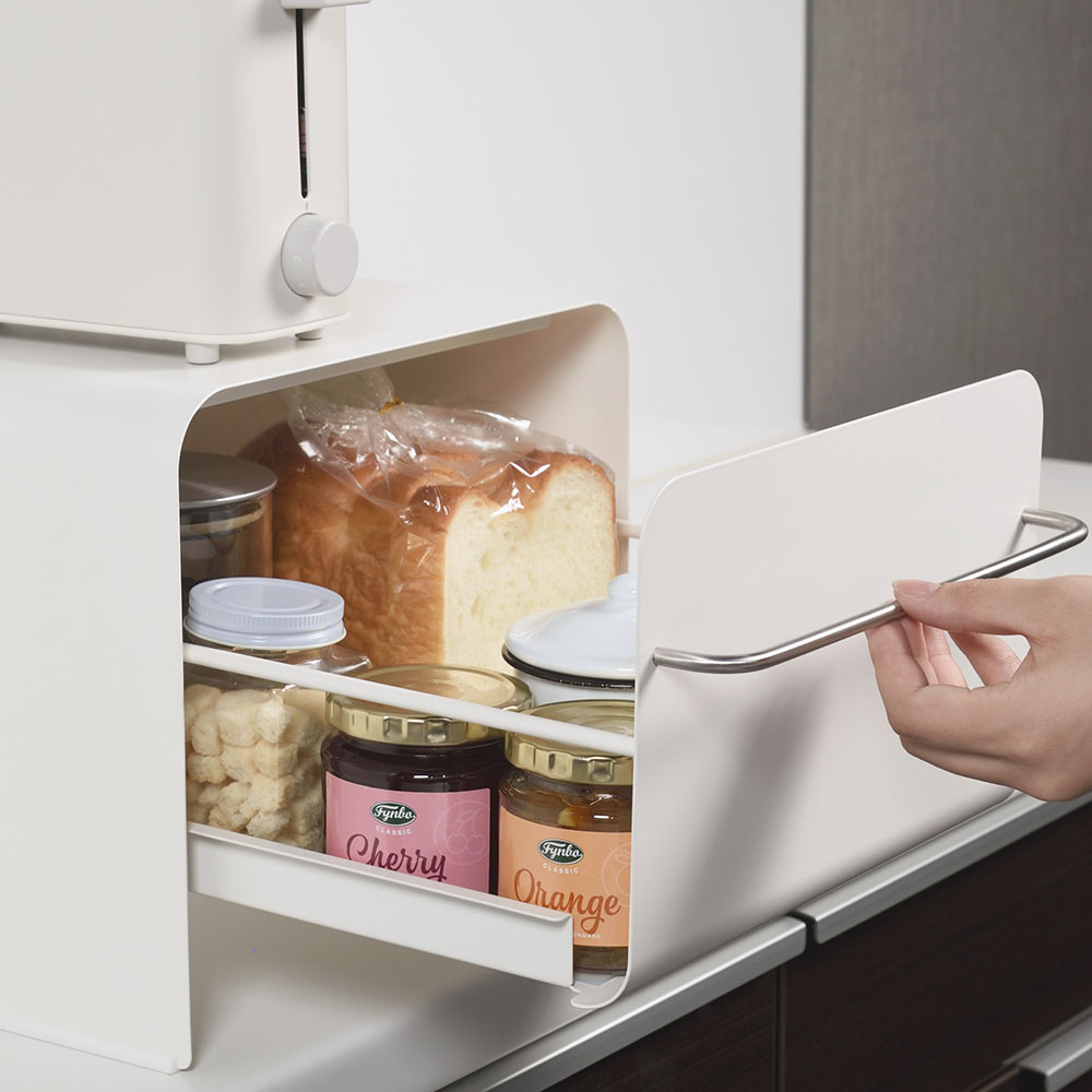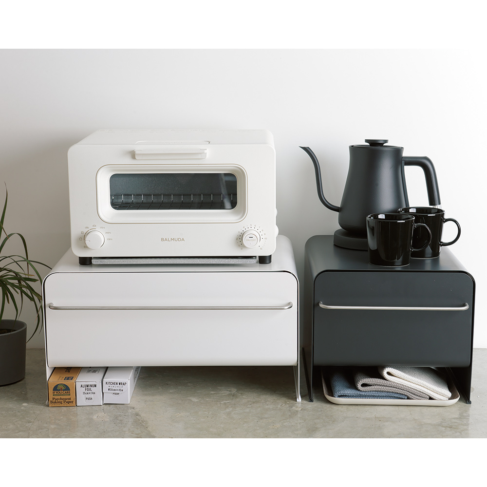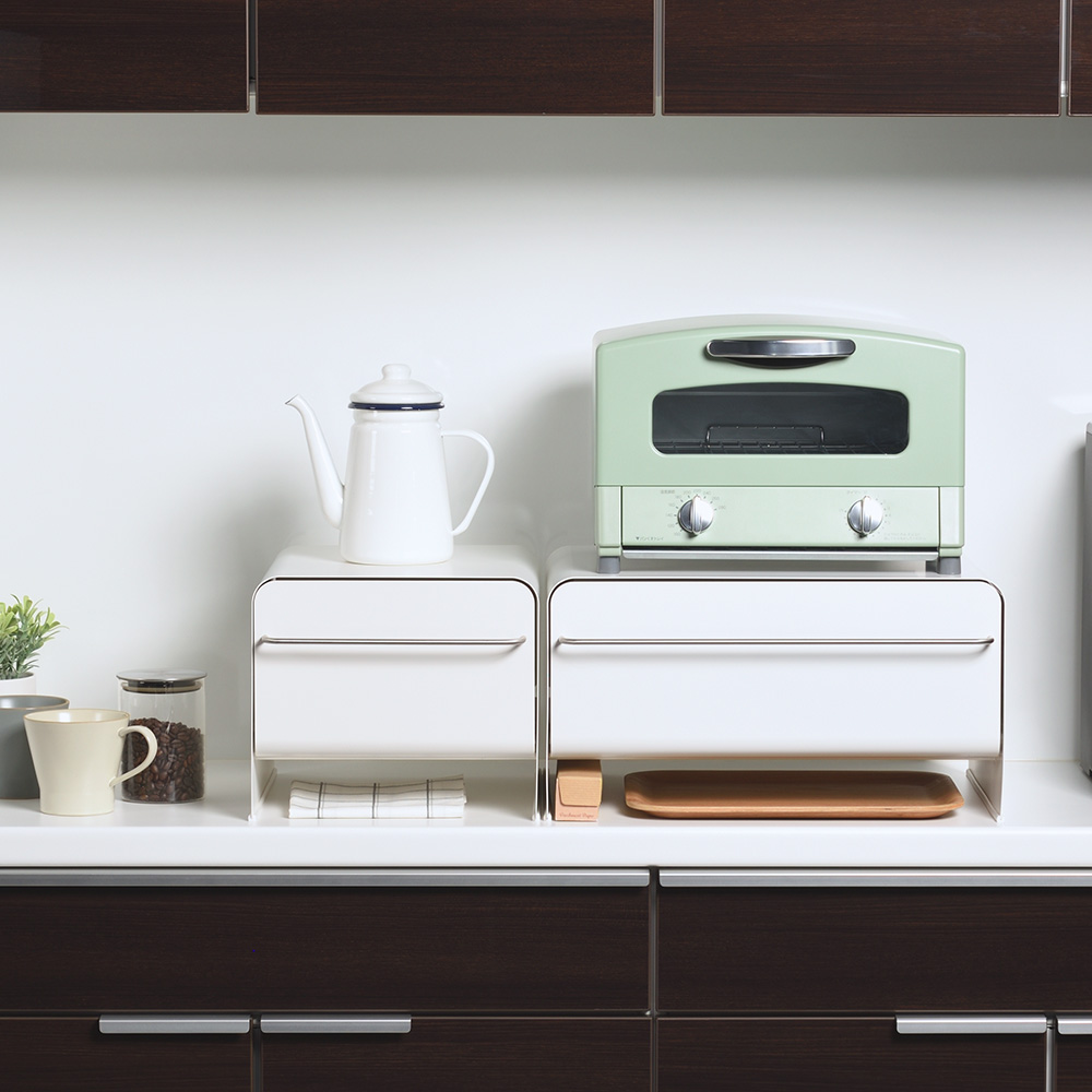 スーッと引出せて奥のものもサッと取り出せる!たっぷり入る引き出しでキッチンのおしゃれ片付け大成功。ありそうでなかった引き出しタイプの収納。ローラー付きの引き出しは開閉がとてもスムーズで容量もたっぷり。食パンもすっぽり収まります。天板耐荷重は5kgで頑丈なのでトースターや家電を置くのにもぴったりです。ラップやトレー、フキンの収納にも底上げ構造なので、置き場に困るトレーやラップが綺麗に入ります。ハンドルはフキンをかけるのにぴったり。たくさん入れてもスムーズな引出し引出の両サイドにローラー付きなので、たくさん入れても開閉スムーズ!引出だと奥のものも取り出しやすくて便利です!