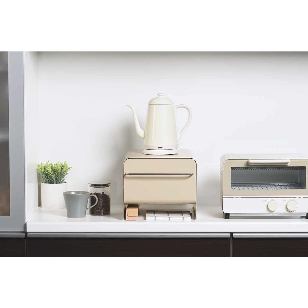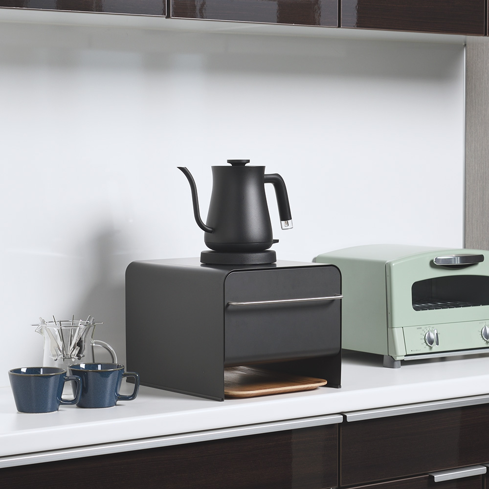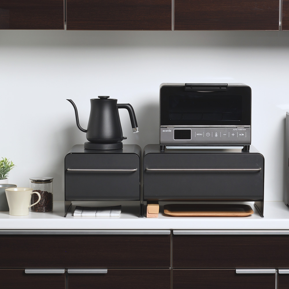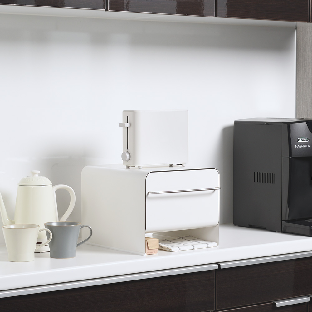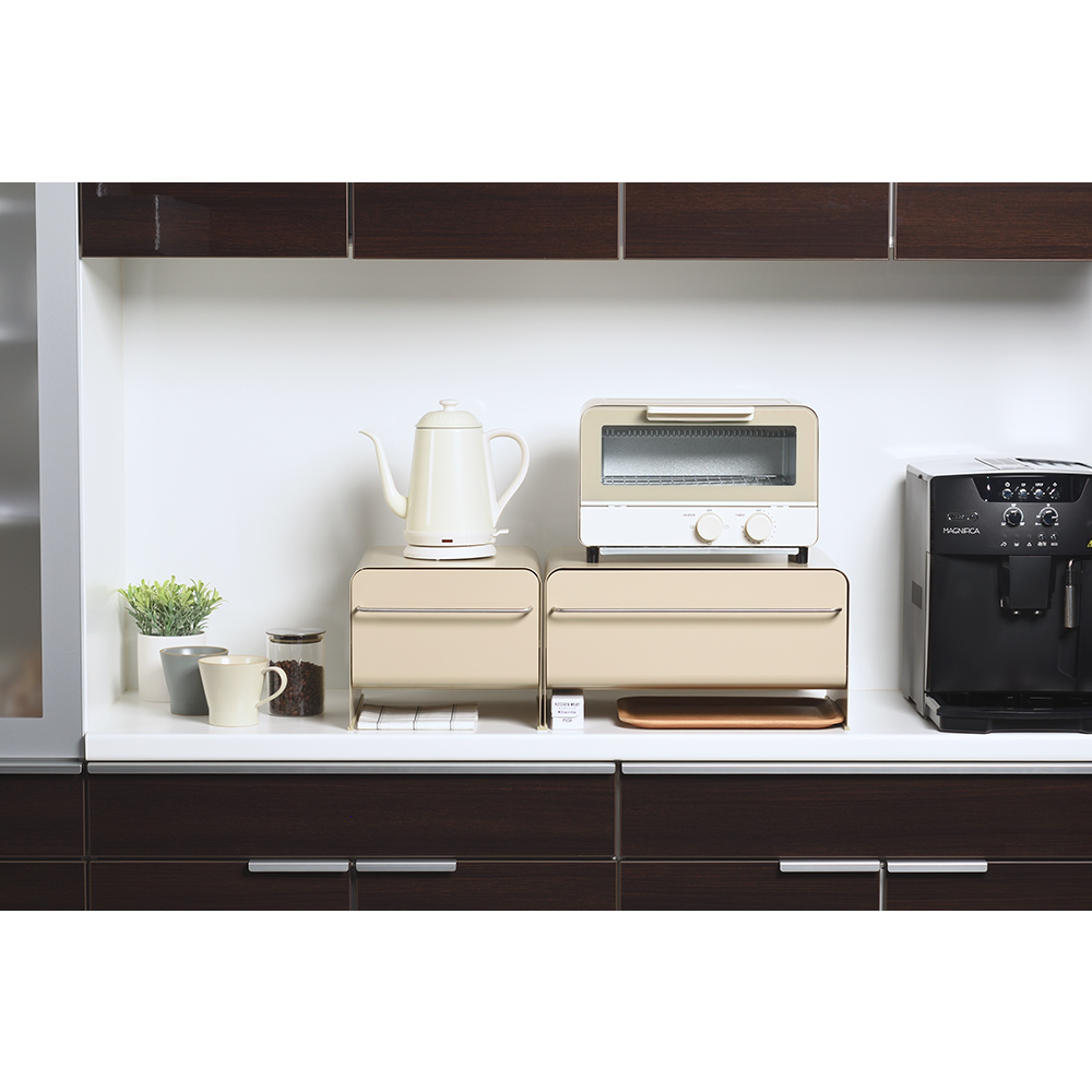 スーッと引出せて奥のものもサッと取り出せる!たっぷり入る引き出しでキッチンのおしゃれ片付け大成功。ありそうでなかった引き出しタイプの収納。ローラー付きの引き出しは開閉がとてもスムーズで容量もたっぷり。食パンもすっぽり収まります。天板耐荷重は5kgで頑丈なのでトースターや家電を置くのにもぴったりです。ラップやトレー、フキンの収納にも底上げ構造なので、置き場に困るトレーやラップが綺麗に入ります。ハンドルはフキンをかけるのにぴったり。たくさん入れてもスムーズな引出し引出の両サイドにローラー付きなので、たくさん入れても開閉スムーズ!引出だと奥のものも取り出しやすくて便利です!