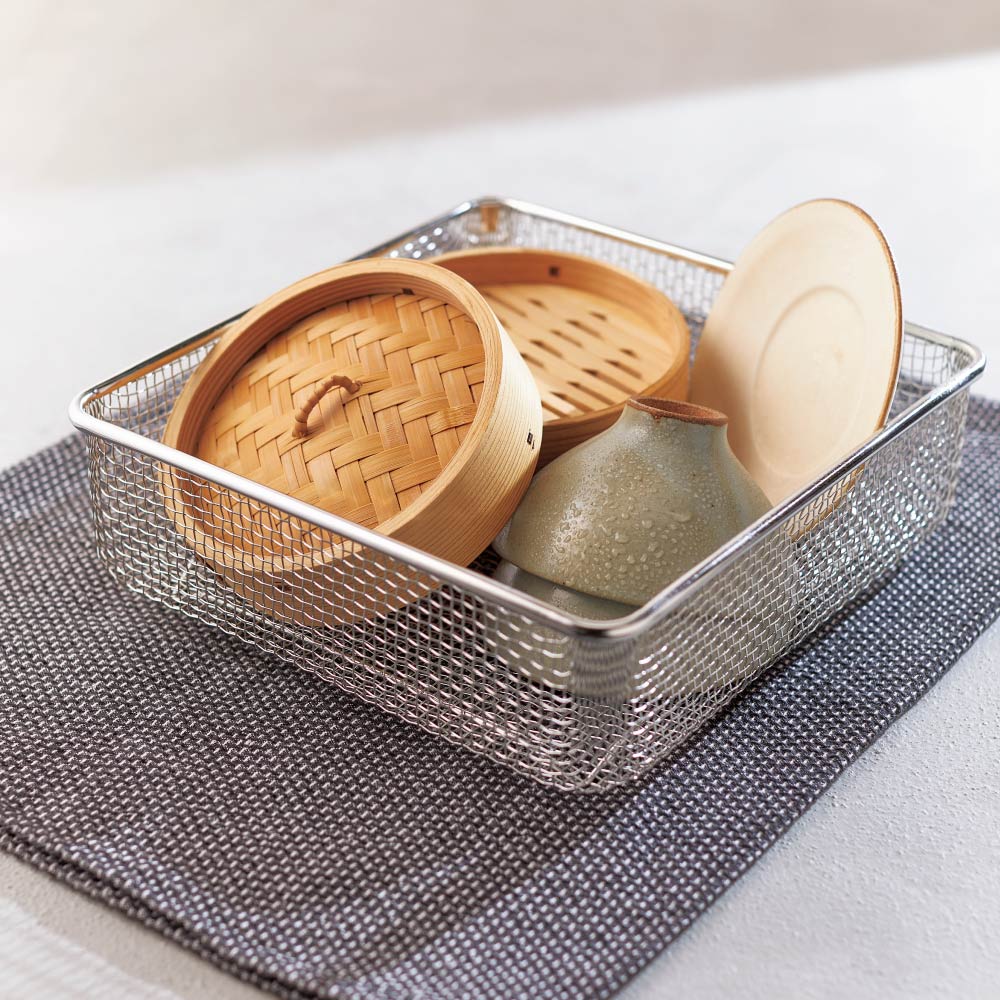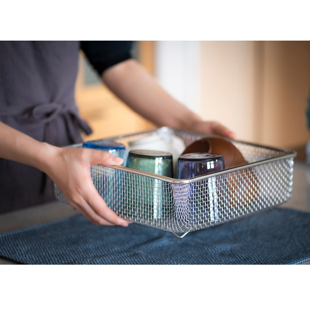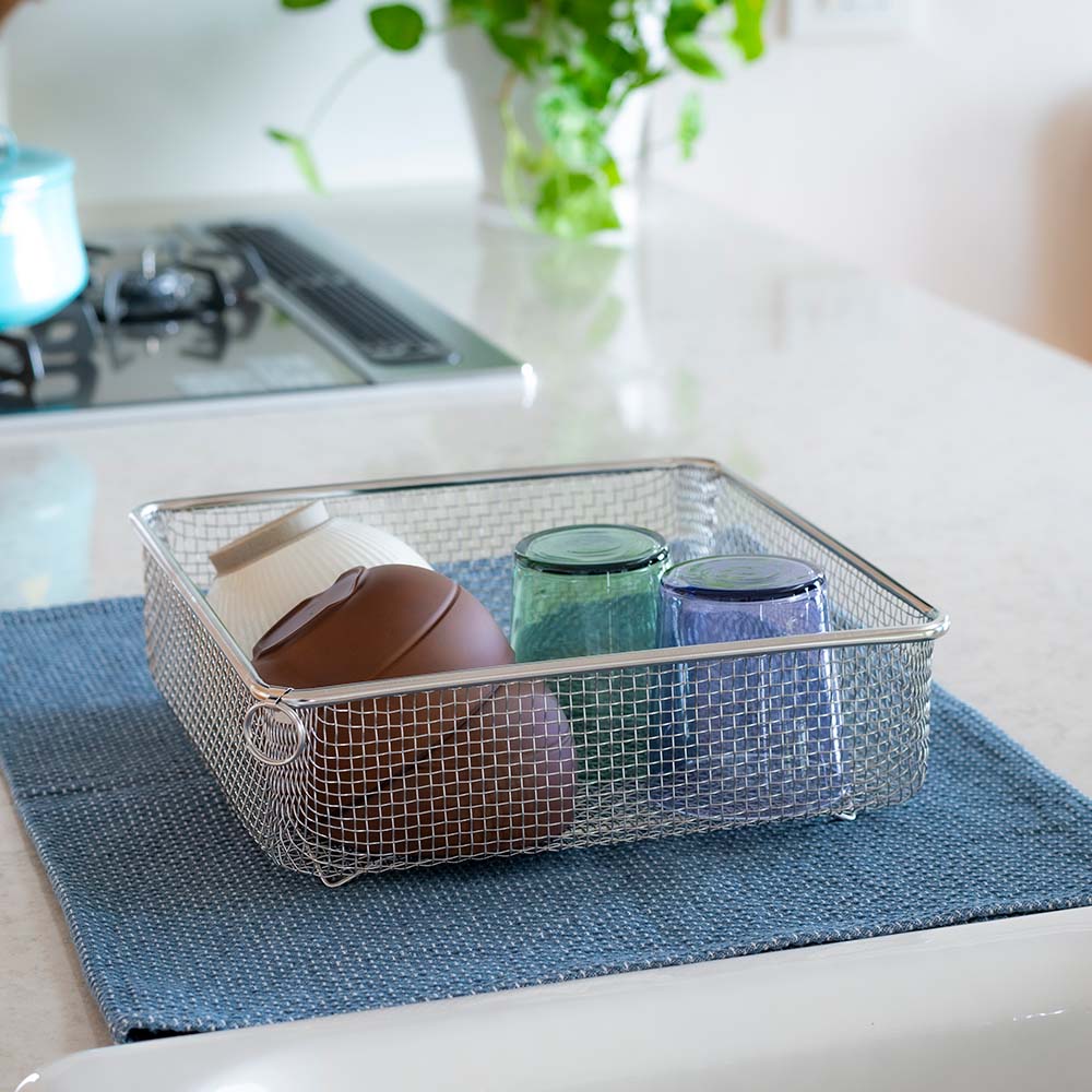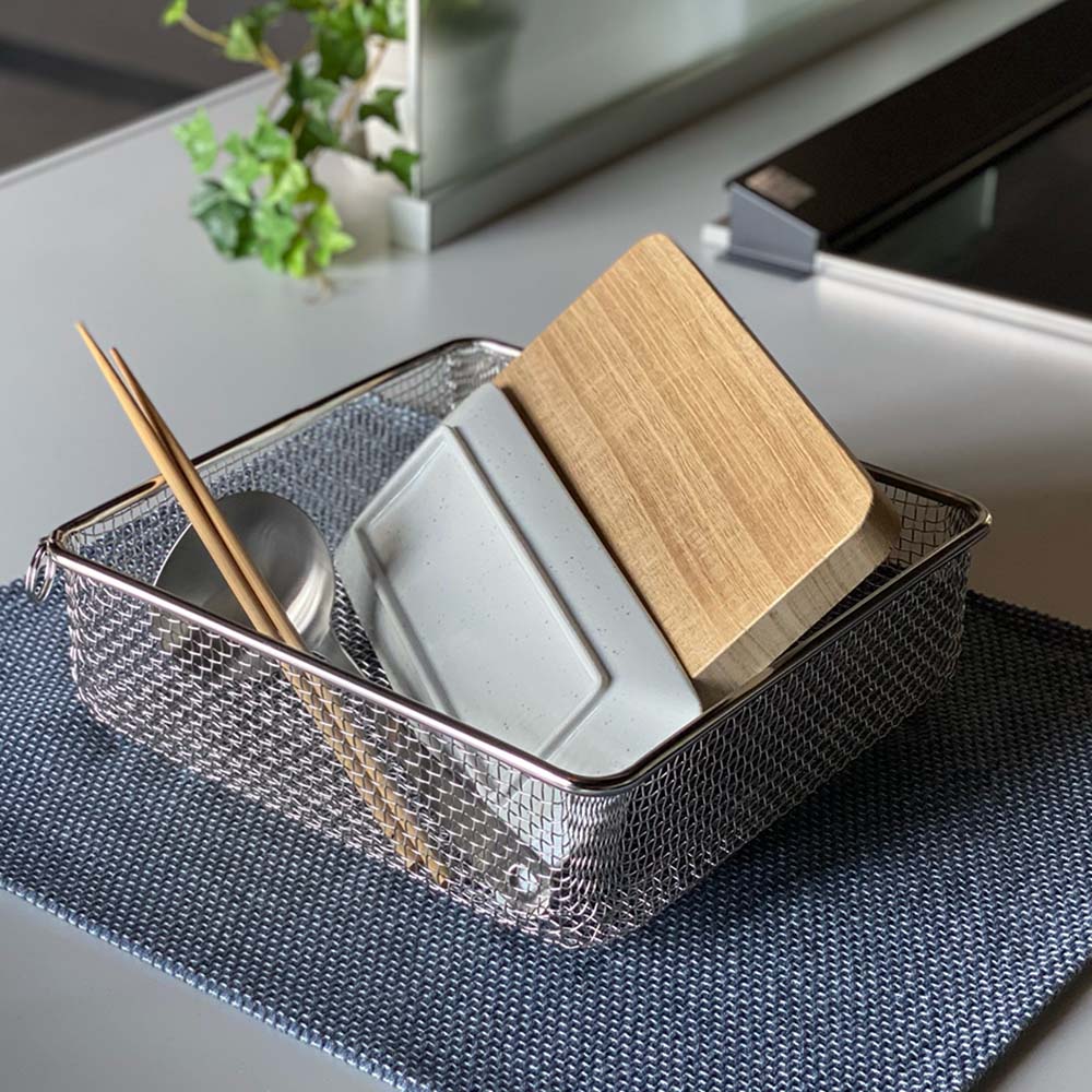 片付け時間さえ楽しくなる、こだわりキッチンアイテム3選軽くて移動が簡単。大きな水切りを置きたくない方へ片付けラクラク!省スペース設計の食器水切り「もう大きな水切りカゴは不要」と感じている方へ。忙しい日々にも対応できる、コンパクトで使いやすい水切りカゴは、洗い物が少ない日や食洗機を利用する時にぴったりです。使わない時は収納できるため、キッチンが広々と使えます。衛生的で耐久性も高い|素材は18-8ステンレスサビに強い18-8ステンレスを使用しているので、水回りでも安心。丈夫で長持ち、食器と同じように食洗機で丸洗いも可能です。すっきり水が切れます。脚付き設計なので、下に敷いたタオルに食器が触れず、乾きも早く衛生的。また絶秒な網目で水切れもグッド!引っかけて収納可能リングがあるので、引っ掛けて収納できます。これで作業台は広々です。ザルとしても使えます底がフラットなのでザルとしても使えます。ほうれん草などの青菜を茹でるときに切らずに長いまま荒熱取りをしたり、たっぷりの枝豆も食材が重ならないのすっきり湯切り&荒熱取りができます。キッチン台にすっきりフィット|シーンに合わせて選べる浅型・深型・スクエアタイプのバリエーションで、鍋やフライパン、ザルの一時置きにも便利です。リング付きでフックに吊るすことも可能。毎日の調理から後片付けまで、あなたの暮らしに寄り添うシンプル&高機能なキッチンアイテムです。