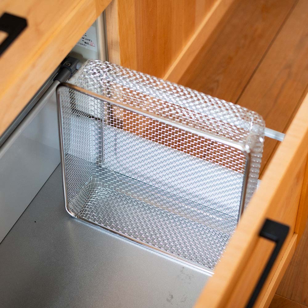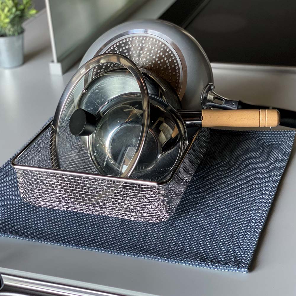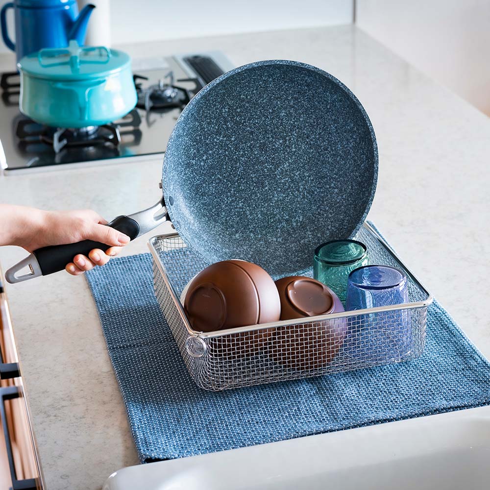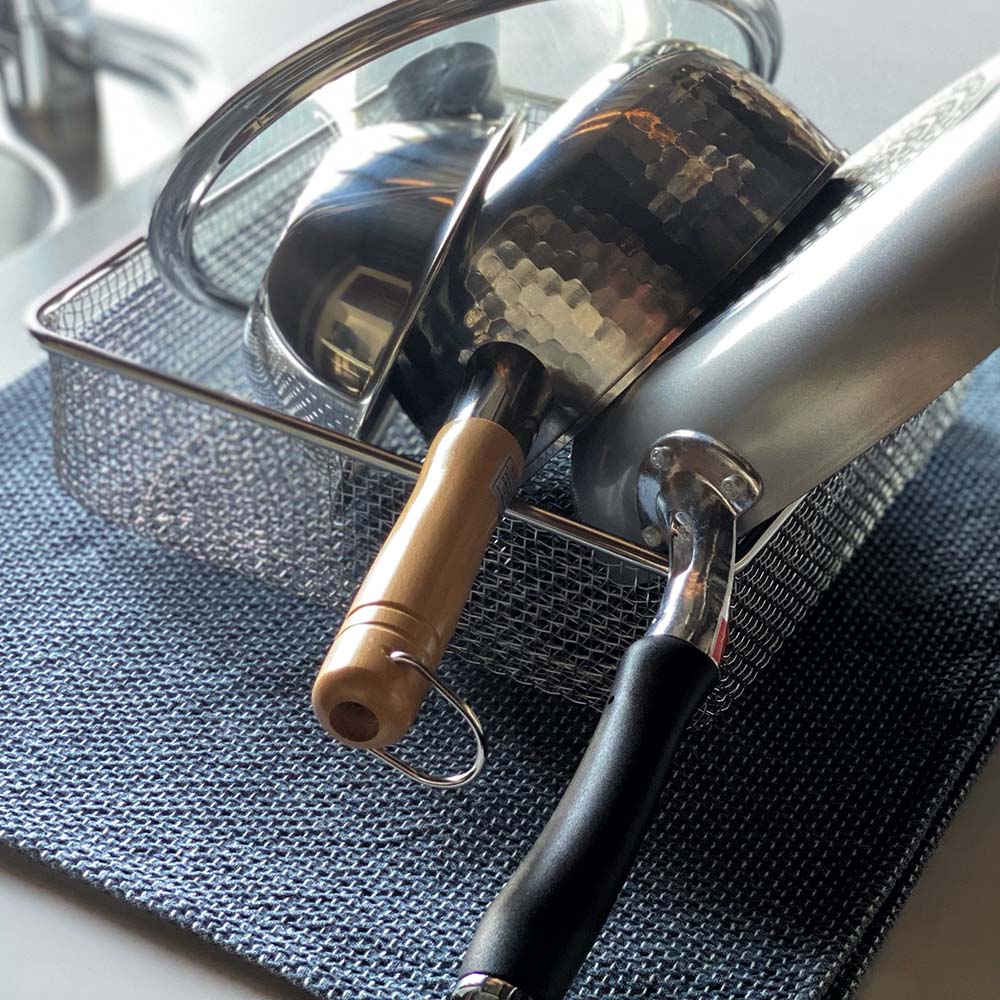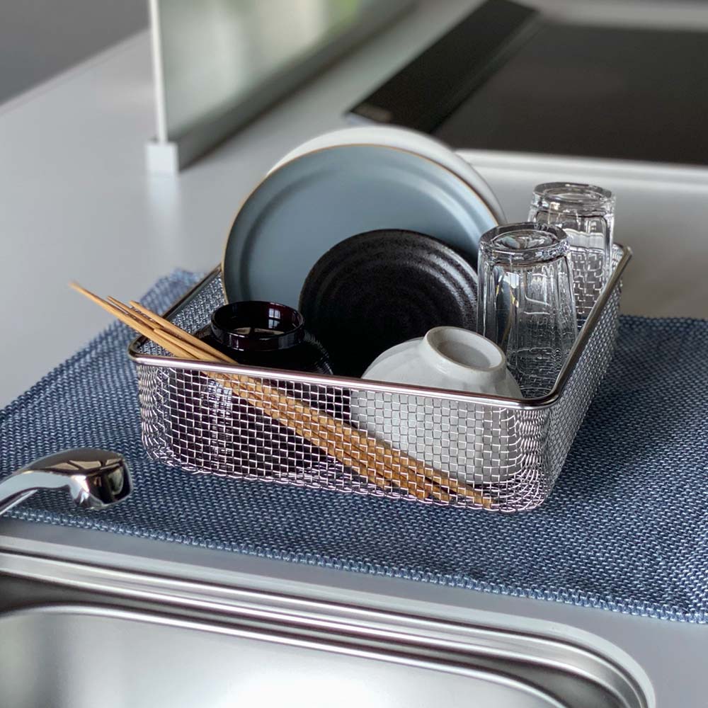 片付け時間さえ楽しくなる、こだわりキッチンアイテム3選軽くて移動が簡単。大きな水切りを置きたくない方へ片付けラクラク!省スペース設計の食器水切り「もう大きな水切りカゴは不要」と感じている方へ。忙しい日々にも対応できる、コンパクトで使いやすい水切りカゴは、洗い物が少ない日や食洗機を利用する時にぴったりです。使わない時は収納できるため、キッチンが広々と使えます。衛生的で耐久性も高い|素材は18-8ステンレスサビに強い18-8ステンレスを使用しているので、水回りでも安心。丈夫で長持ち、食器と同じように食洗機で丸洗いも可能です。すっきり水が切れます。脚付き設計なので、下に敷いたタオルに食器が触れず、乾きも早く衛生的。また絶秒な網目で水切れもグッド!引っかけて収納可能リングがあるので、引っ掛けて収納できます。これで作業台は広々です。ザルとしても使えます底がフラットなのでザルとしても使えます。ほうれん草などの青菜を茹でるときに切らずに長いまま荒熱取りをしたり、たっぷりの枝豆も食材が重ならないのすっきり湯切り&荒熱取りができます。キッチン台にすっきりフィット|シーンに合わせて選べる浅型・深型・スクエアタイプのバリエーションで、鍋やフライパン、ザルの一時置きにも便利です。リング付きでフックに吊るすことも可能。毎日の調理から後片付けまで、あなたの暮らしに寄り添うシンプル&高機能なキッチンアイテムです。