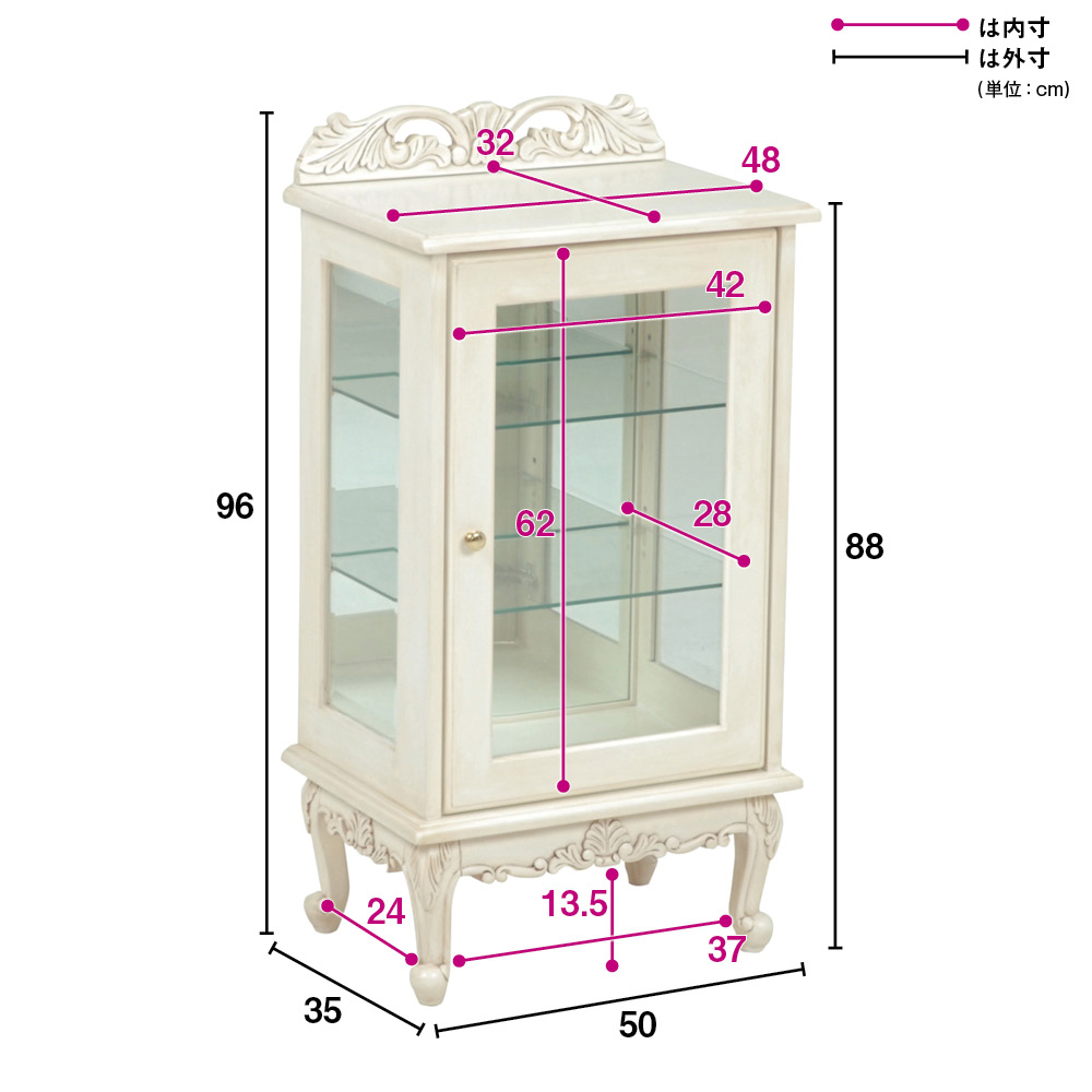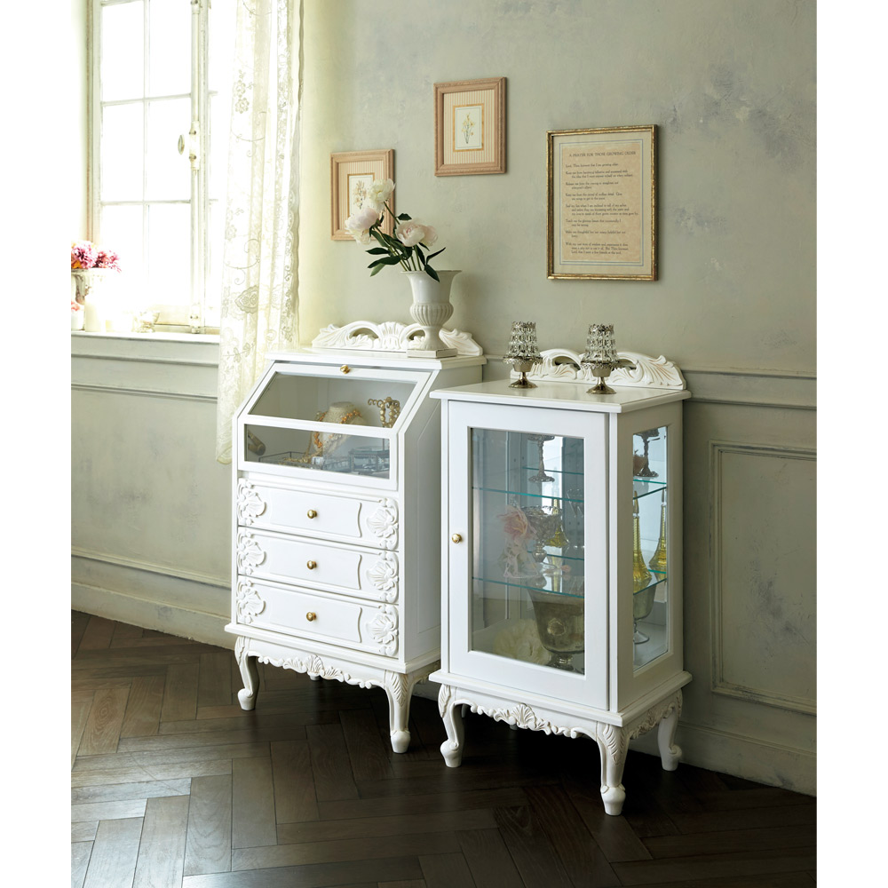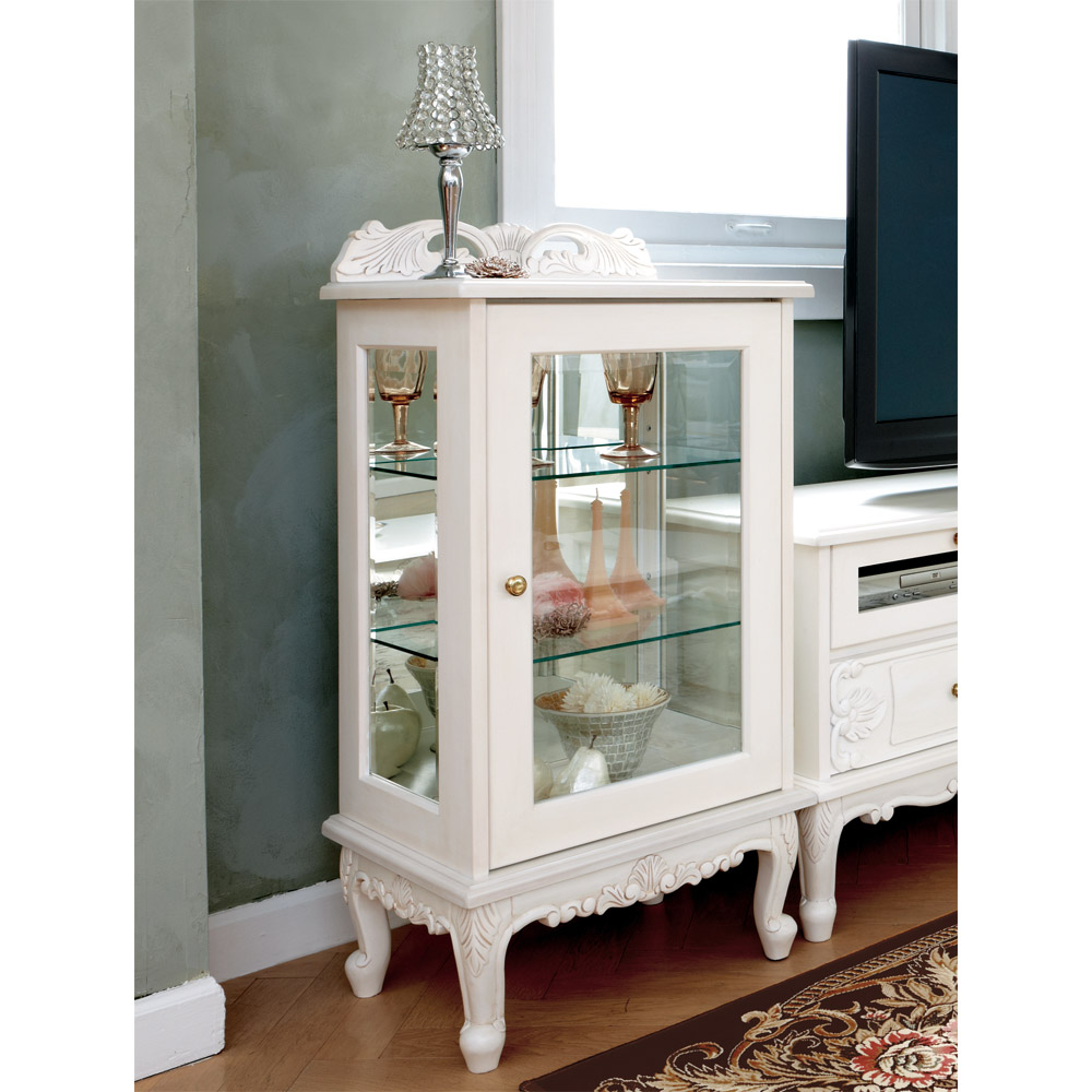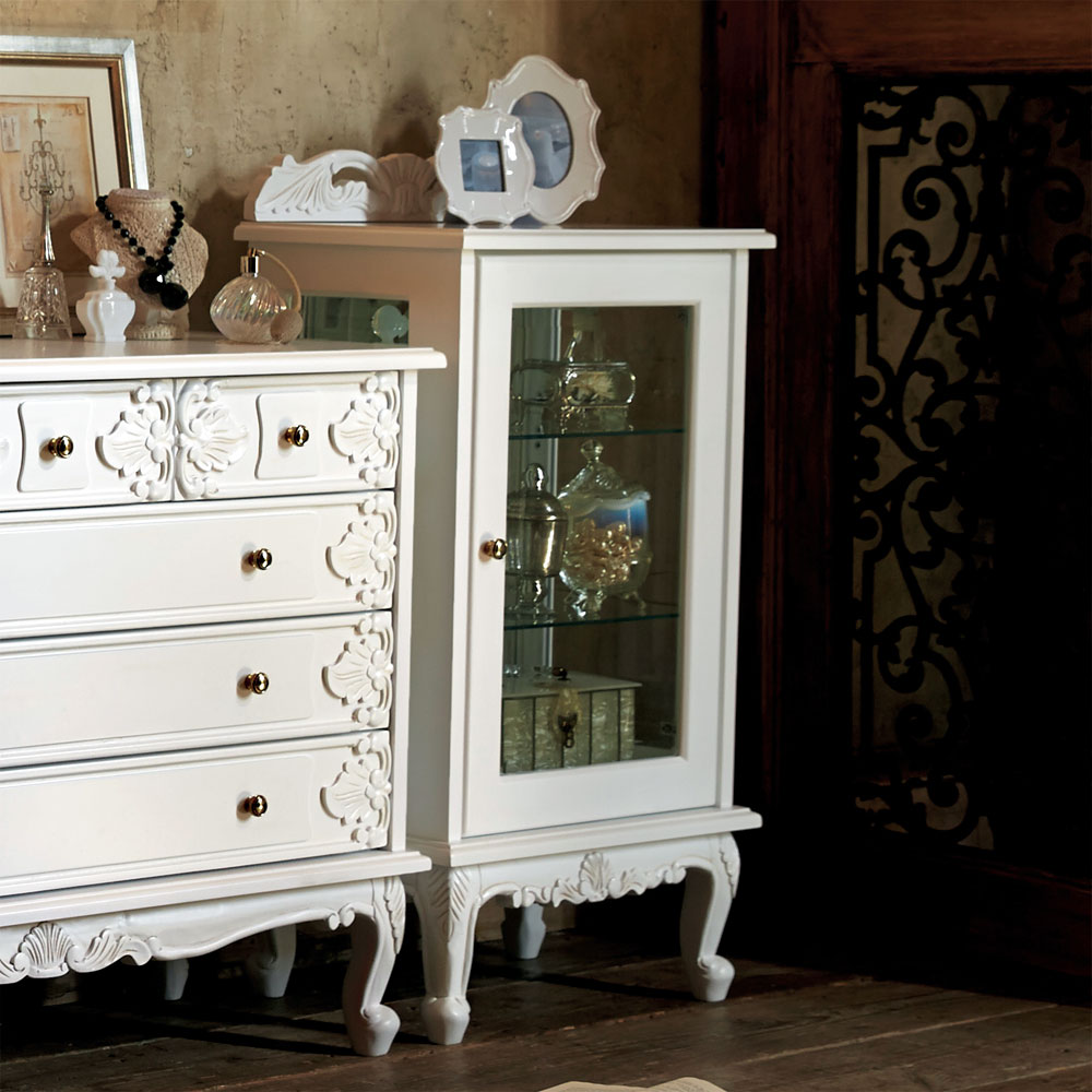 天然木の飾り彫り加工がゴージャスなクラシックガラスキャビネット。レースのように繊細な装飾部分は、ひとつひとつ職人による手作業で丁寧に仕上げています。長年愛用したようなアンティーク加工を施しており、レトロで美しい佇まいでお部屋に趣を添えます。お気に入りのコレクションやアクセサリーを美しく収納して、お洒落なキュリオケースとしてもおすすめ。女性らしく、華やかで優しい印象のコレクションケースです。〜憧れのフランスのお部屋のような上質で洗練されたクラシックインテリアをご自宅で〜◆長年使いこまれたような味わいが出るよう、傷や汚れを職人の手作業の塗装で再現したアンティーク調テイスト。◆オシャレで優美なインテリア空間を演出いたします。◆脚部に施された植物などをモチーフにした彫刻は、職人の手作業で丁寧に手彫りをしています。◆シャビーシックなインテリアやナチュラルフレンチカントリー風のお部屋コーディネートにもおすすめです。◆脚部は人気の猫脚(カプリオール・レッグ)を採用。女性らしいフォルムが魅力です。〜お気に入りをディスプレイする、特別な空間を〜◆ガラスの扉を使用することでお気に入りの食器や雑貨を美しく飾り、ホコリや汚れからも大切に守ってくれます。◆アクセサリーやインテリアを一層輝かせるガラス棚を採用しています。◆ガラスの棚板は、収納物の大きさに合わせて3段階に高さ変更ができます。◆ディスプレイ収納や、コレクション収納としてもオススメです。〜商品担当者のコメント〜猫脚の丸みや、美しいモチーフの装飾が女性らしい印象の白家具シリーズです。華やかなデザインのみでなく、収納家具としての機能性も充実しており、まるで海外のホテルのような憧れ空間を叶えられます。自分へのご褒美やお部屋の模様替えにもおすすめの、クラシックデザイン家具です。※アンティーク風仕上げの性質上、塗装の濃淡・かすれ等の風合いが1点ずつ異なります。特に手彫り部分は職人の手作業で、部分的に長年使用したような汚れ、キズを再現しています。天然素材ならではの風合いをお楽しみください。〜アンティーク家具の特集はこちら〜アンティーク家具の世界