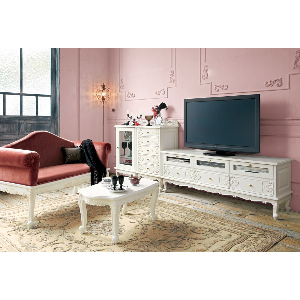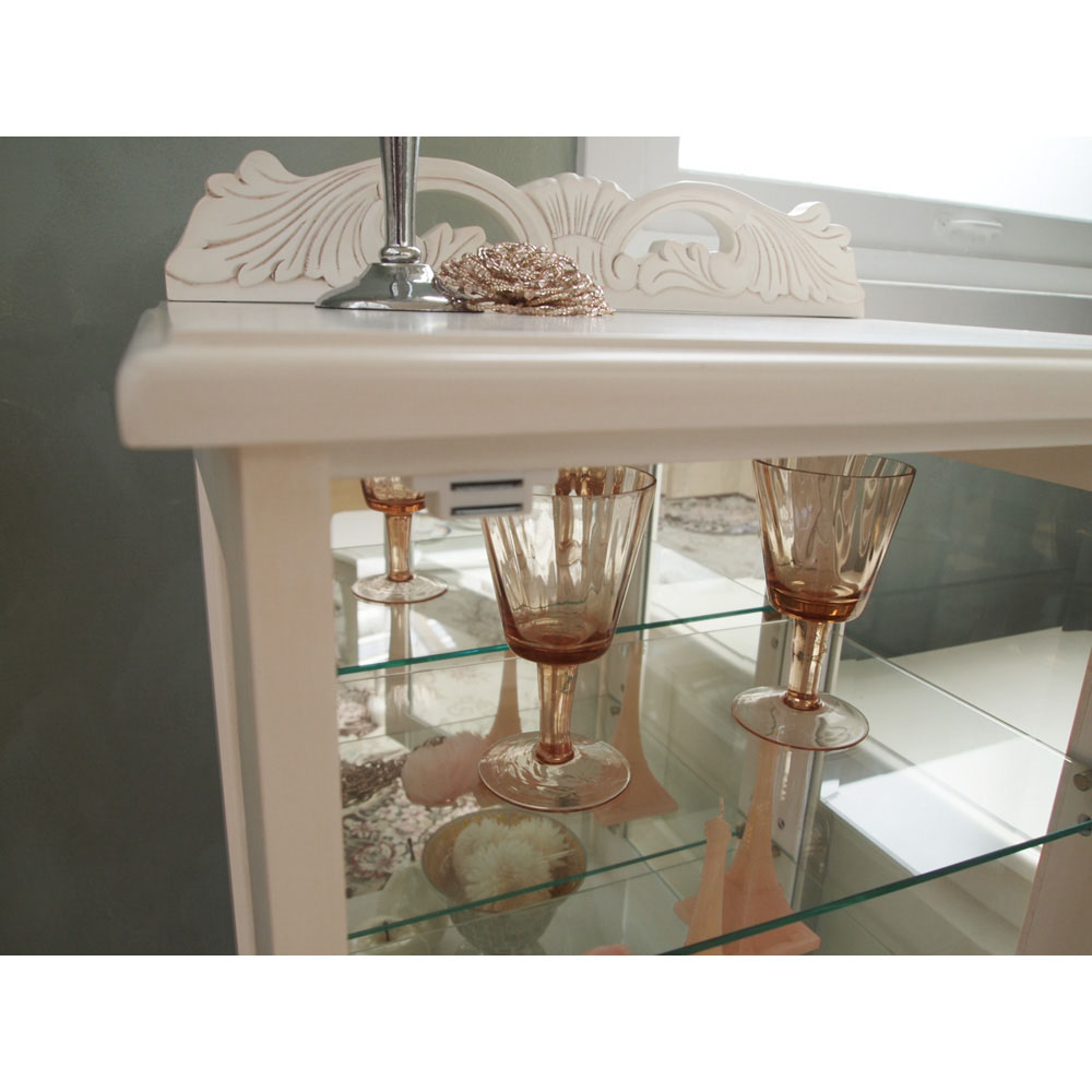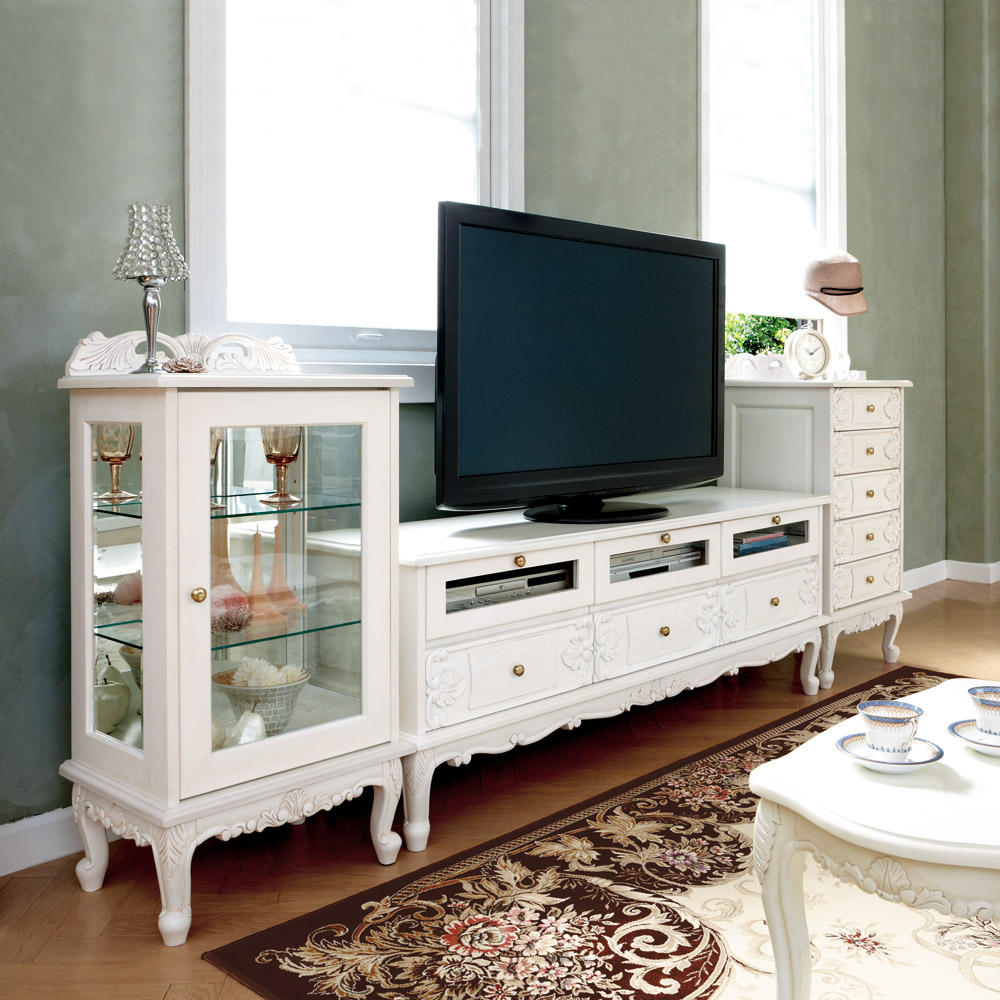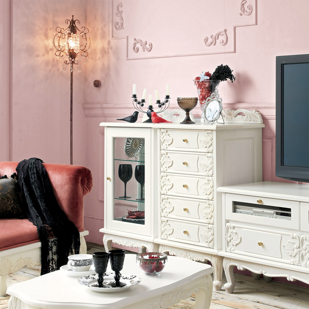 天然木の飾り彫り加工がゴージャスなクラシックガラスキャビネット。レースのように繊細な装飾部分は、ひとつひとつ職人による手作業で丁寧に仕上げています。長年愛用したようなアンティーク加工を施しており、レトロで美しい佇まいでお部屋に趣を添えます。お気に入りのコレクションやアクセサリーを美しく収納して、お洒落なキュリオケースとしてもおすすめ。女性らしく、華やかで優しい印象のコレクションケースです。〜憧れのフランスのお部屋のような上質で洗練されたクラシックインテリアをご自宅で〜◆長年使いこまれたような味わいが出るよう、傷や汚れを職人の手作業の塗装で再現したアンティーク調テイスト。◆オシャレで優美なインテリア空間を演出いたします。◆脚部に施された植物などをモチーフにした彫刻は、職人の手作業で丁寧に手彫りをしています。◆シャビーシックなインテリアやナチュラルフレンチカントリー風のお部屋コーディネートにもおすすめです。◆脚部は人気の猫脚(カプリオール・レッグ)を採用。女性らしいフォルムが魅力です。〜お気に入りをディスプレイする、特別な空間を〜◆ガラスの扉を使用することでお気に入りの食器や雑貨を美しく飾り、ホコリや汚れからも大切に守ってくれます。◆アクセサリーやインテリアを一層輝かせるガラス棚を採用しています。◆ガラスの棚板は、収納物の大きさに合わせて3段階に高さ変更ができます。◆ディスプレイ収納や、コレクション収納としてもオススメです。〜商品担当者のコメント〜猫脚の丸みや、美しいモチーフの装飾が女性らしい印象の白家具シリーズです。華やかなデザインのみでなく、収納家具としての機能性も充実しており、まるで海外のホテルのような憧れ空間を叶えられます。自分へのご褒美やお部屋の模様替えにもおすすめの、クラシックデザイン家具です。※アンティーク風仕上げの性質上、塗装の濃淡・かすれ等の風合いが1点ずつ異なります。特に手彫り部分は職人の手作業で、部分的に長年使用したような汚れ、キズを再現しています。天然素材ならではの風合いをお楽しみください。〜アンティーク家具の特集はこちら〜アンティーク家具の世界