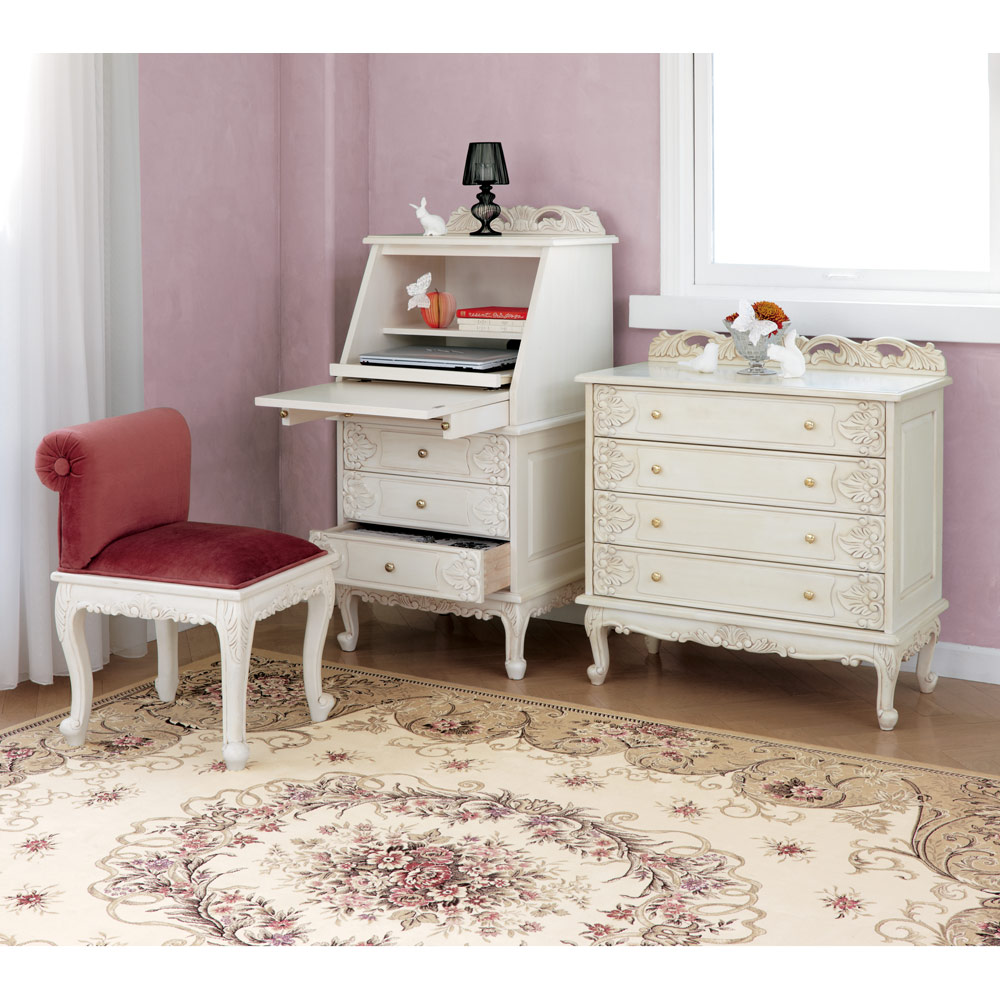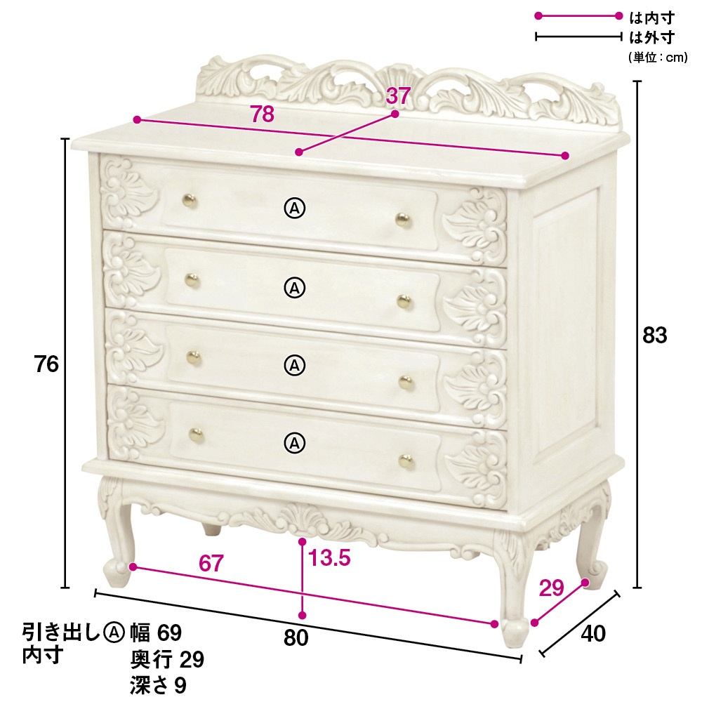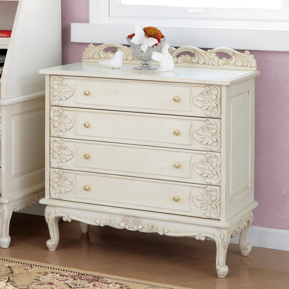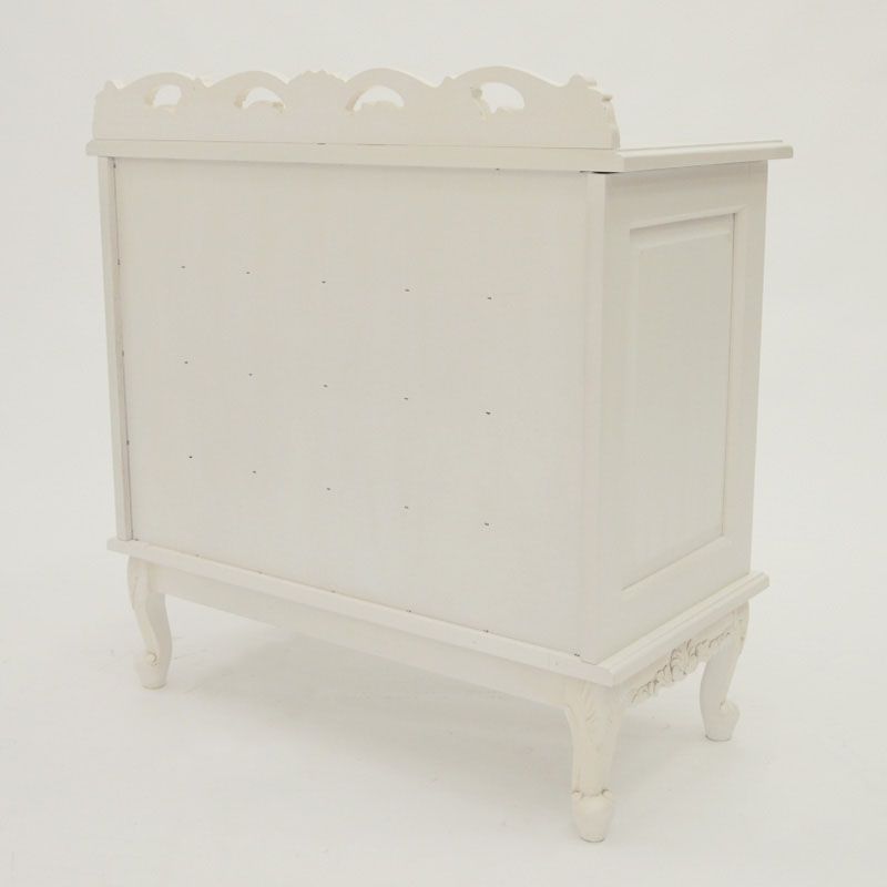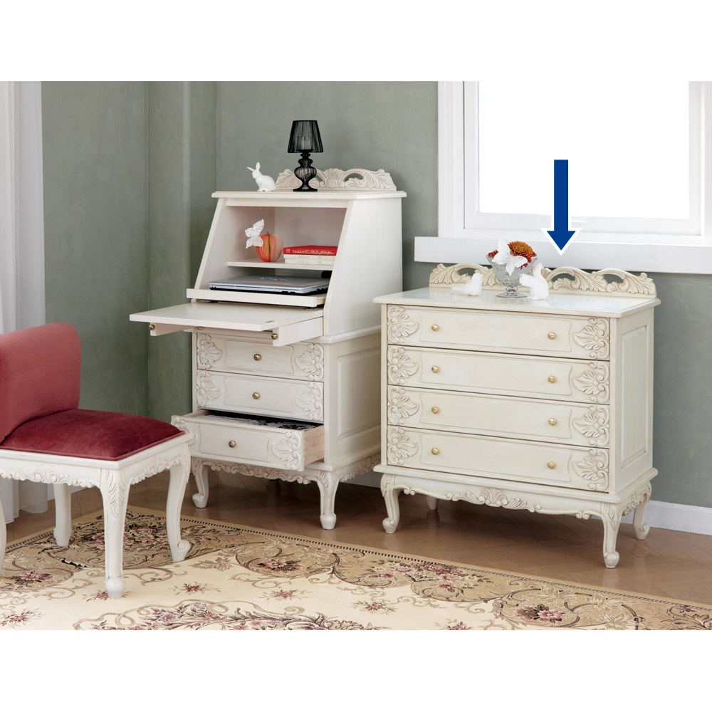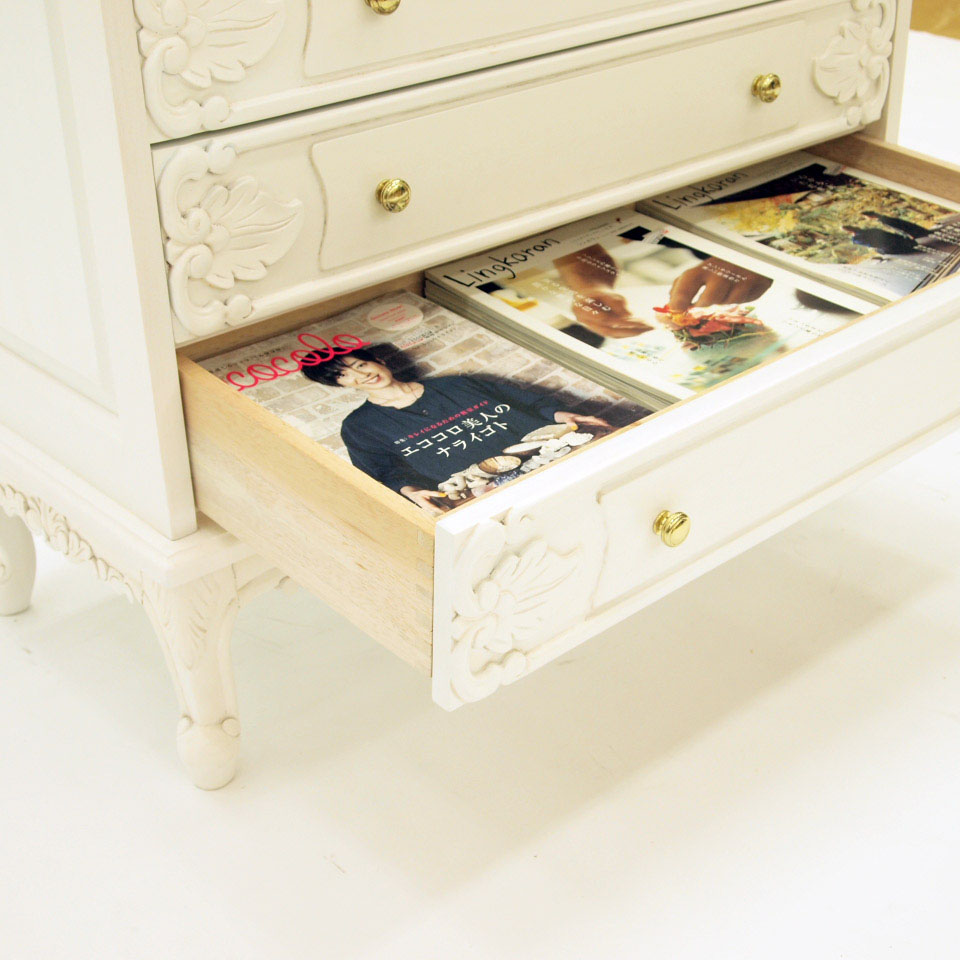 洗練された上品さと高級感を演出する、天然木の飾り彫り加工がゴージャスなクラシックチェスト。レースのように繊細な装飾部分は、ひとつひとつ職人による手作業で丁寧に仕上げています。長年愛用したようなアンティーク加工を施しており、レトロで美しい佇まいでお部屋に趣を添えます。衣類収納やリビング収納にピッタリのローチェストで、書斎や寝室、パーソナルルームのインテリアとしてもおすすめ。女性らしく、華やかで優しい印象の収納家具です。〜憧れのフランスのお部屋のような上質で洗練されたクラシックインテリアをご自宅で〜◆長年使いこまれたような味わいが出るよう、傷や汚れを職人の手作業の塗装で再現したアンティーク調ローチェスト。◆オシャレで優美なインテリア空間を演出いたします。◆脚部に施された植物などをモチーフにした彫刻は、職人の手作業で丁寧に手彫りをしています。◆シャビーシックなインテリアやナチュラルフレンチカントリー風のお部屋コーディネートにもおすすめです。◆脚部は人気の猫脚(カプリオール・レッグ)を採用。女性らしいフォルムが魅力です。〜お気に入りを収納する、特別な空間を〜◆使い勝手の良い引き出し収納なので、お気に入りの洋服や雑貨をホコリや汚れからも大切に守ってくれます。◆チェストの天板にはアクセサリーやコスメなどを飾って、ディスプレイ収納にもおすすめです。◆引出しには各段に装飾が施されているので、お部屋のインテリアとして女性らしさを演出します。〜商品担当者のコメント〜猫脚の丸みや、美しいモチーフの装飾が女性らしい印象の白家具シリーズです。華やかなデザインのみでなく、収納家具としての機能性も充実しており、まるで海外のホテルのような憧れ空間を叶えられます。自分へのご褒美やお部屋の模様替えにもオススメの、クラシックデザイン家具です。※アンティーク風仕上げの性質上、塗装の濃淡・かすれ等の風合いが1点ずつ異なります。特に手彫り部分は職人の手作業で、部分的に長年使用したような汚れ、キズを再現しています。天然素材ならではの風合いをお楽しみください。〜アンティーク家具の特集はこちら〜アンティーク家具の世界