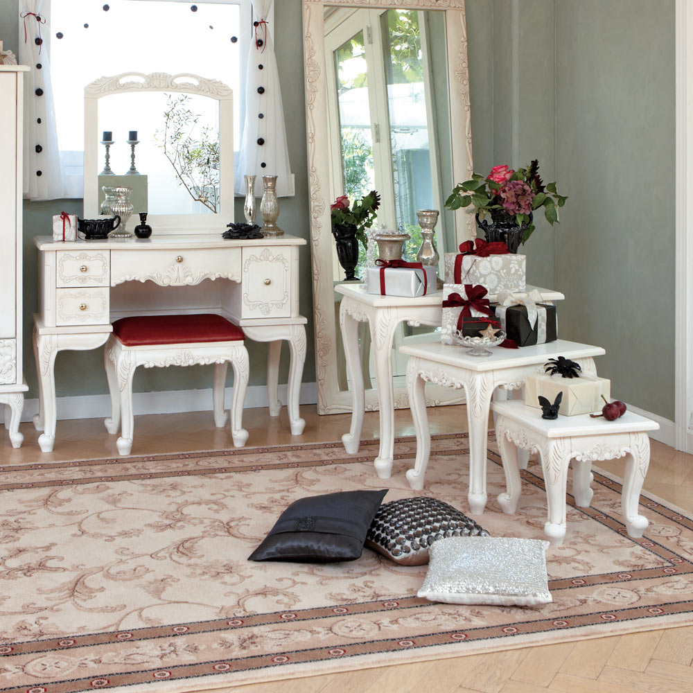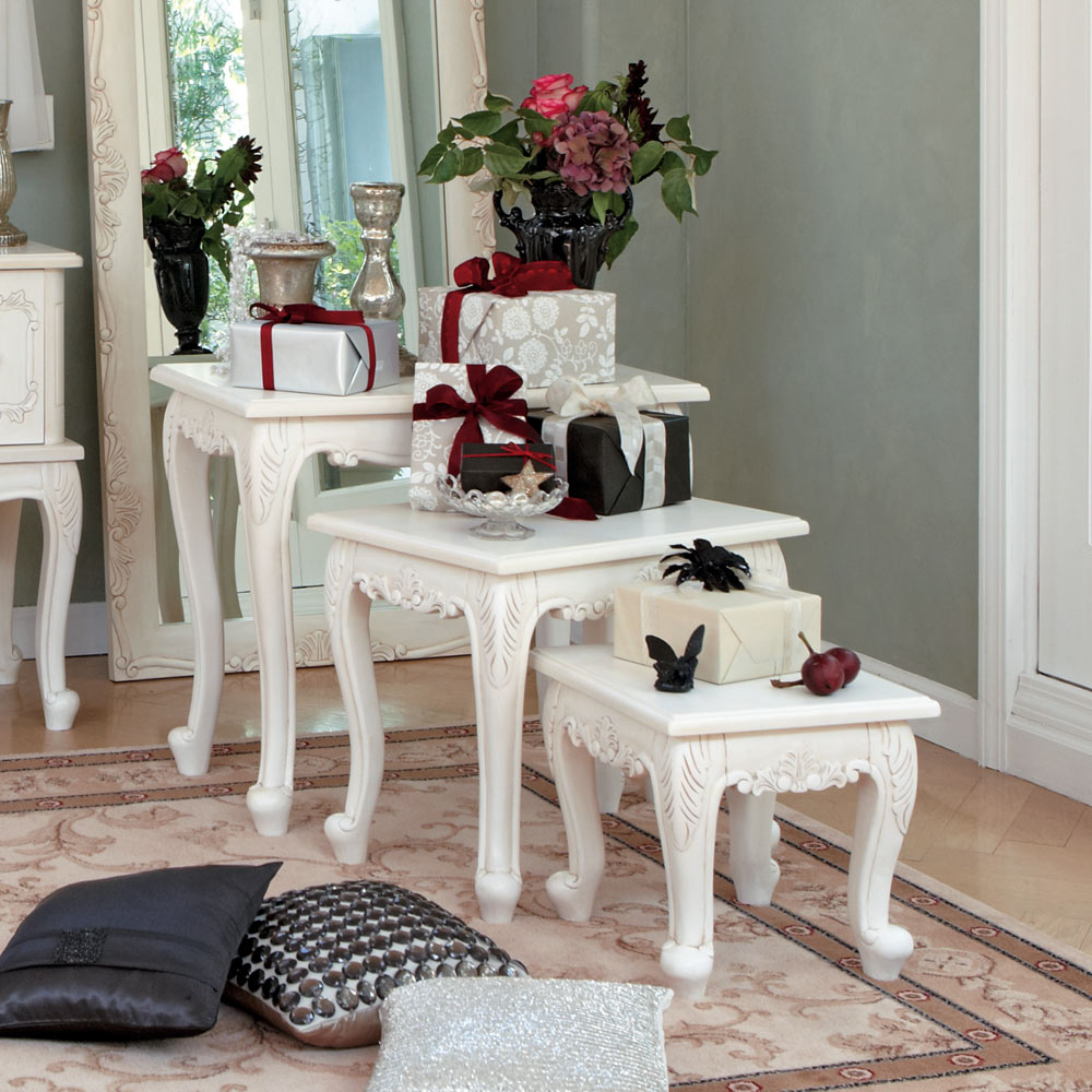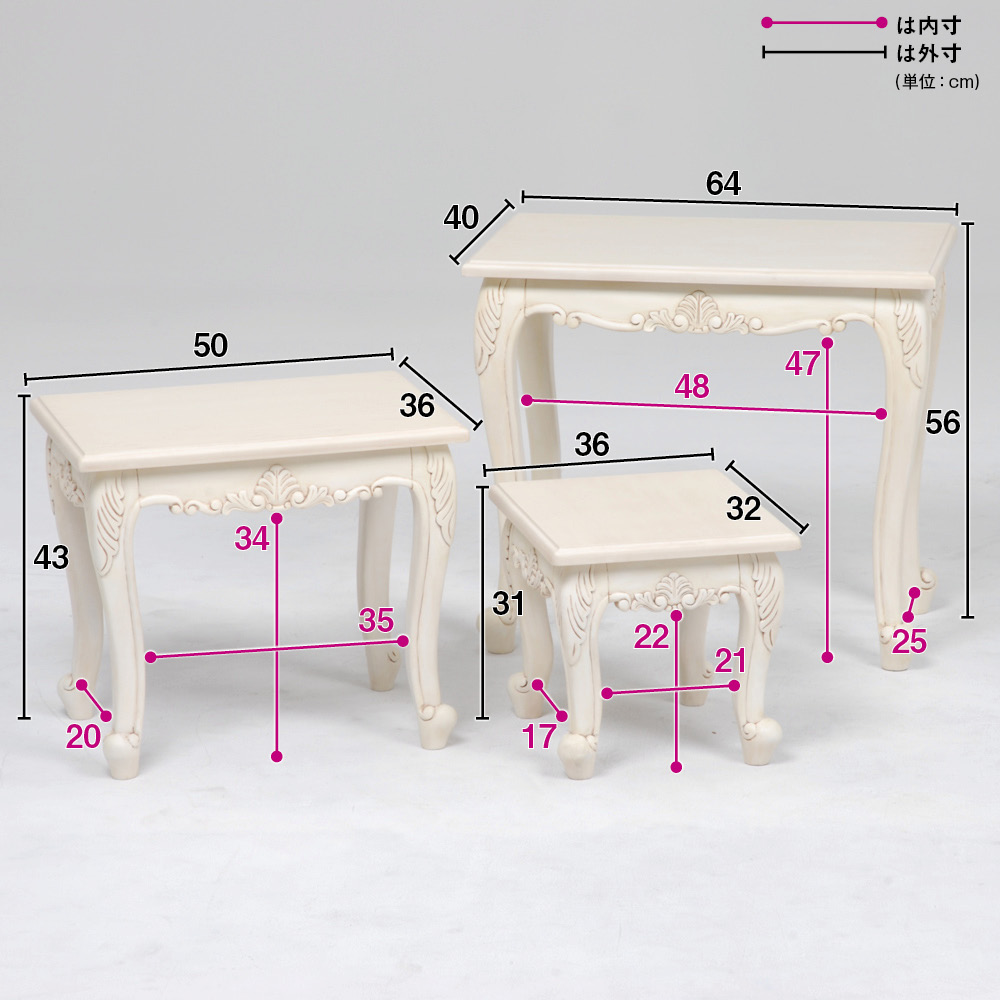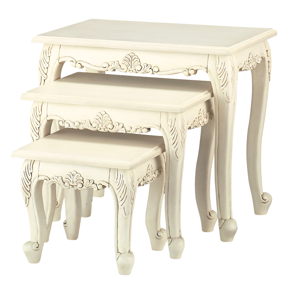 ナイトテーブルとして、サイドテーブルとして、花台として、用途多彩な3点デスクセット。手作業で部分的に長年使用したようなアンティークな風合いを再現してした。天然木の彫り加工がゴージャスな白家具です。〜憧れのフランスのお部屋のような上質で洗練されたクラシックインテリアをご自宅で〜◆長年使いこまれたような味わいが出るよう、傷や汚れを職人の手作業の塗装で再現したアンティーク調テイスト。おしゃれなインテリア空間を演出いたします。◆脚部に施された植物などをモチーフにした彫刻は、職人の手作業で丁寧に手彫りをしています。◆シャビーフレンチ風やナチュラルフレンチカントリー風のお部屋コーディネートにもおすすめです。◆脚部は人気の猫脚(カプリオール・レッグ)を採用。○植物などをモチーフにした手彫りレリーフがアクセント。手彫りならではの素朴な風合いと、アンティーク風の味わい深さのある仕上がりです。○脚部もしっかりとした雰囲気のある猫脚(カプリオール・レッグ)を採用。人気のホワイト家具シリーズ。〜商品担当者のコメント〜猫脚の丸みや、美しいモチーフの装飾が女性らしい印象の白家具シリーズです。華やかなデザインで、まるで海外のホテルのような憧れ空間を叶えられます。自分へのご褒美やお部屋の模様替えにもオススメの、クラシックデザイン家具です。※アンティーク風仕上げの性質上、塗装の濃淡・かすれ等の風合いが1点ずつ異なります。特に手彫り部分は職人の手作業で、部分的に長年使用したような汚れ、キズを再現しています。天然素材ならではの風合いをお楽しみください。〜アンティーク家具の特集はこちら〜アンティーク家具の世界