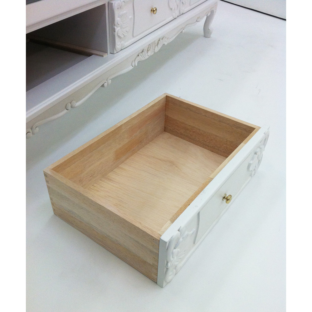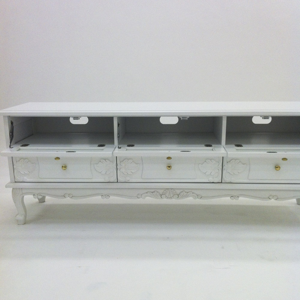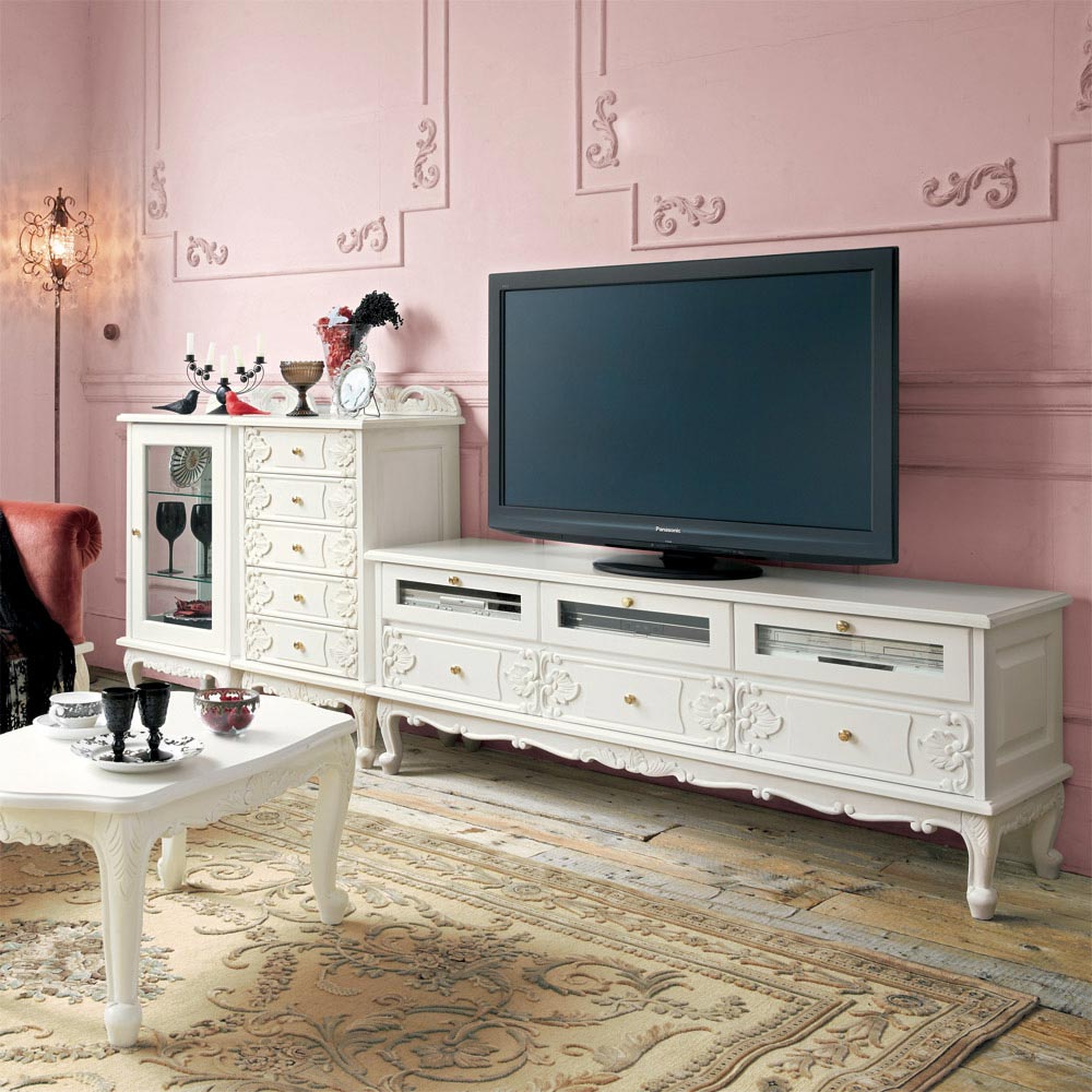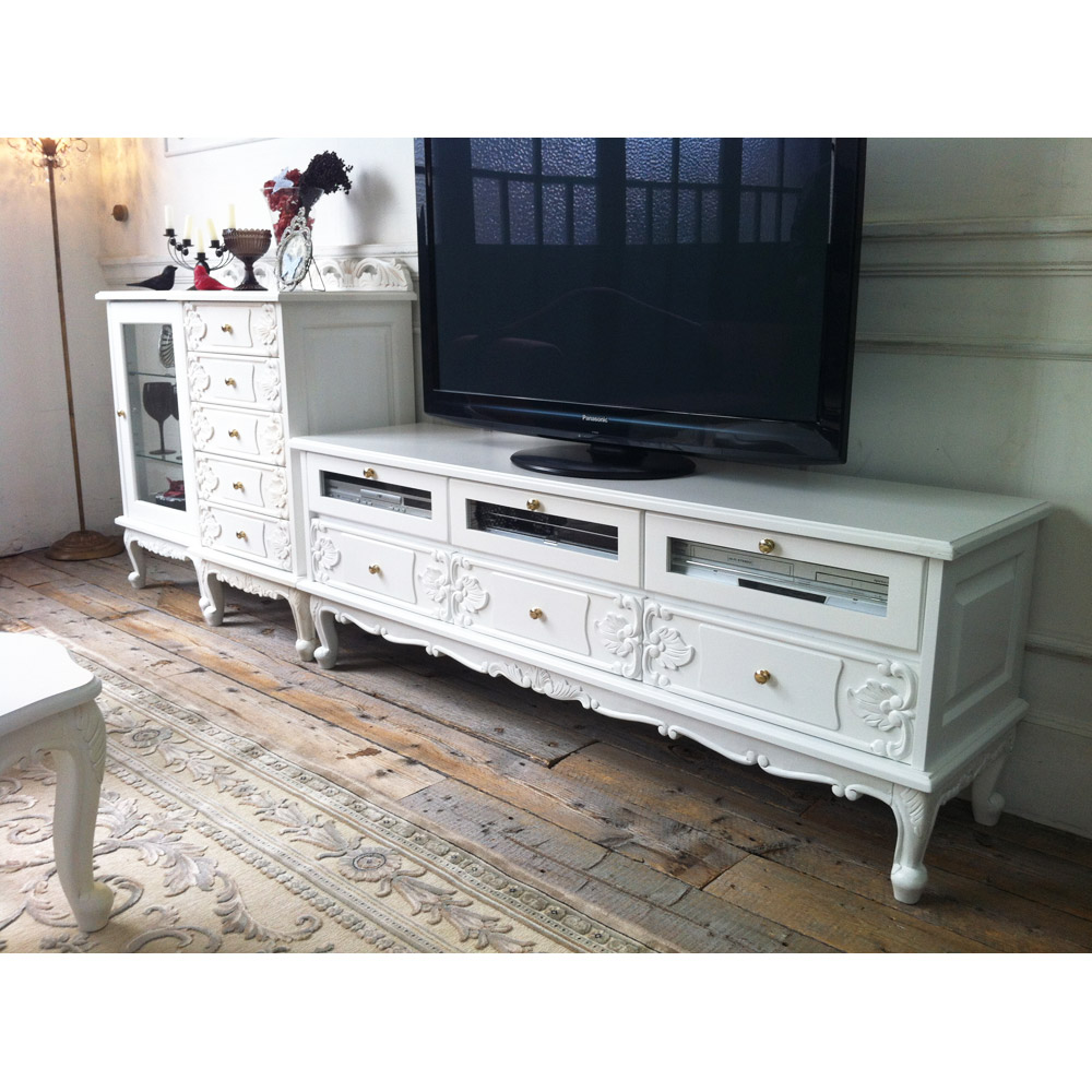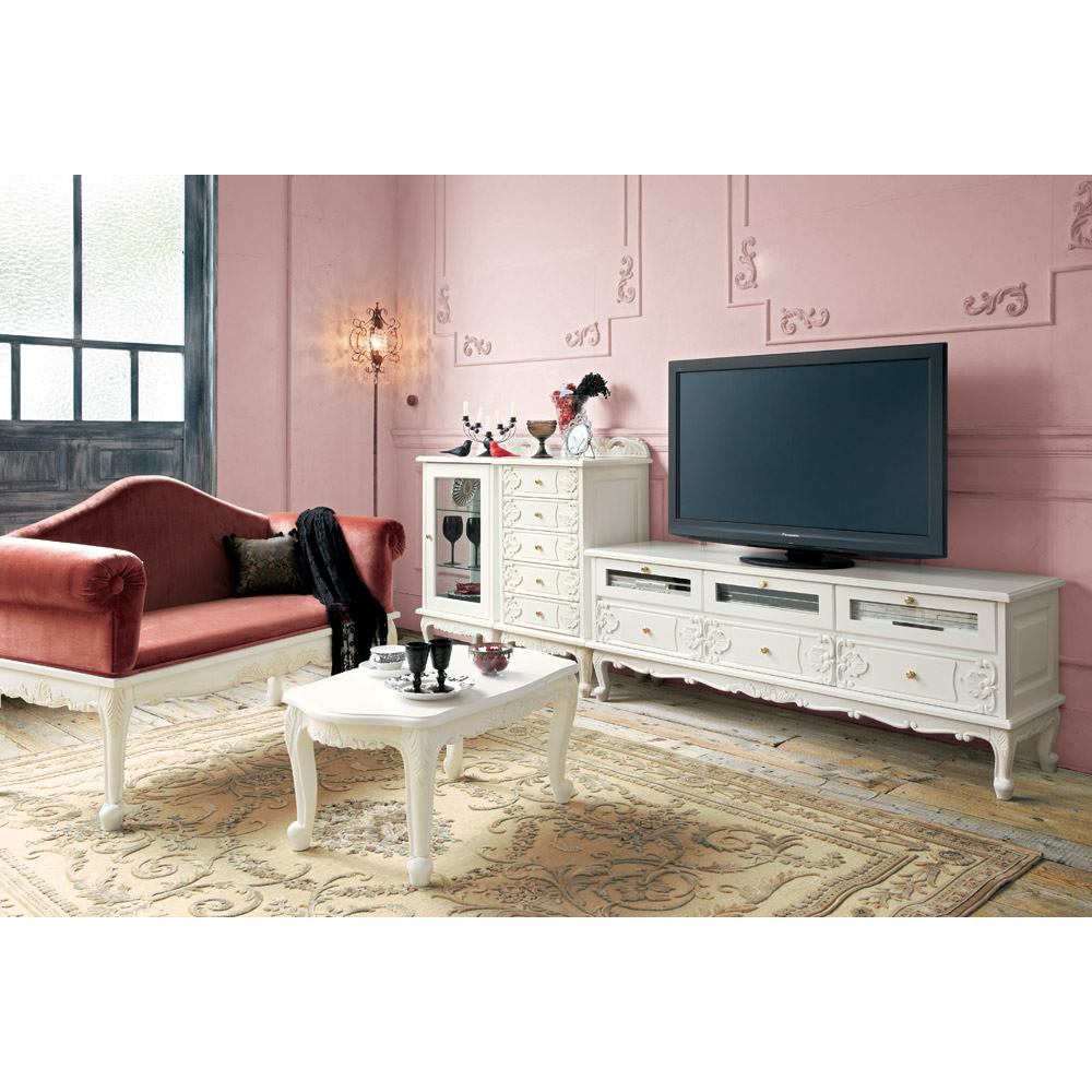 天然木の彫り加工がゴージャスな白家具シリーズのテレビボード。手作業で部分的に長年使用したようなアンティークな風合いを再現。デッキ収納、大容量引き出しなどテレビ収納家具として使いやすいアイデアが満載。〜憧れのフランスのお部屋のような上質で洗練されたクラシックインテリアをご自宅で〜◆長年使いこまれたような味わいが出るよう、傷や汚れを職人の手作業の塗装で再現したアンティーク調テイスト。おしゃれなインテリア空間を演出いたします。◆脚部に施された植物などをモチーフにした彫刻は、職人の手作業で丁寧に手彫りをしています。◆シャビーフレンチ風やナチュラルフレンチカントリー風のお部屋コーディネートにもおすすめです。◆脚部は人気の猫脚(カプリオール・レッグ)を採用。〜リビング収納としても使いやすい機能性〜◆大型テレビを天板に載せて頂けるように、天板耐荷重は約40kg仕様。◆小物を収納しやすい引き出し3杯付き。◆背面も塗装仕上げです。◆届いたその日にご使用いただける完成品です。〜商品担当者のコメント〜猫脚の丸みや、美しいモチーフの装飾が女性らしい印象の白家具シリーズです。華やかなデザインで、まるで海外のホテルのような憧れ空間を叶えられます。自分へのご褒美やお部屋の模様替えにもオススメの、クラシックデザイン家具です。※アンティーク風仕上げの性質上、塗装の濃淡・かすれ等の風合いが1点ずつ異なります。特に手彫り部分は職人の手作業で、部分的に長年使用したような汚れ、キズを再現しています。天然素材ならではの風合いをお楽しみください。〜アンティーク家具の特集はこちら〜アンティーク家具の世界