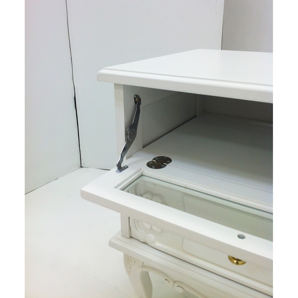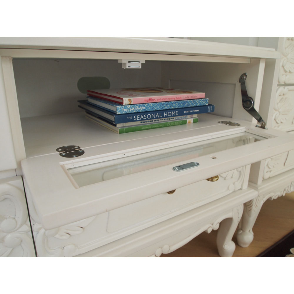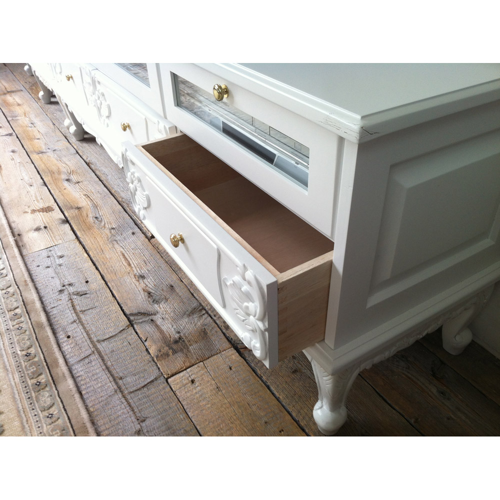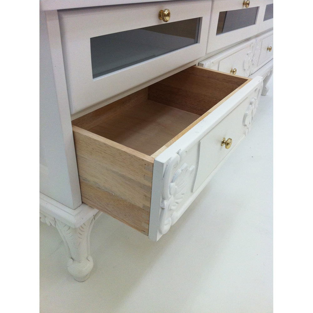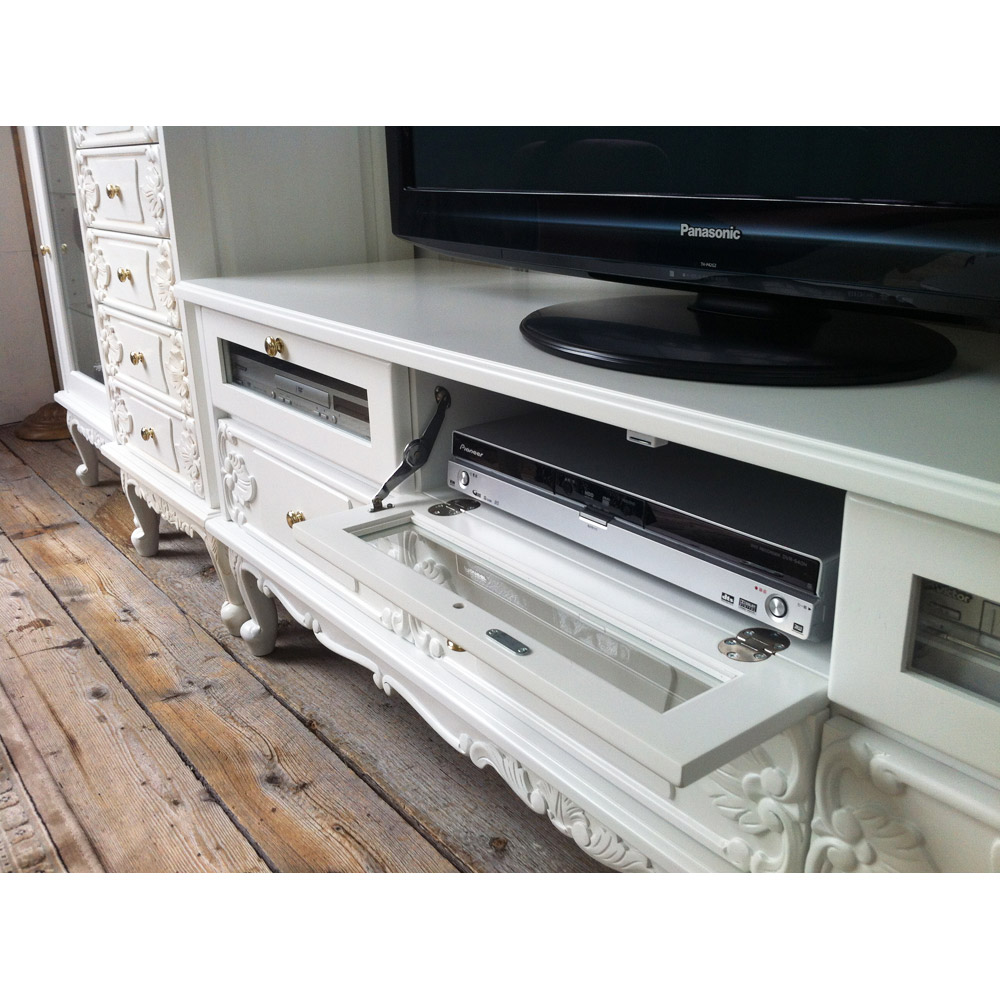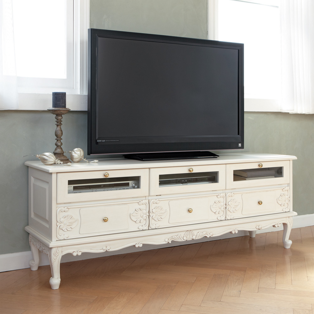 天然木の彫り加工がゴージャスな白家具シリーズのテレビボード。手作業で部分的に長年使用したようなアンティークな風合いを再現。デッキ収納、大容量引き出しなどテレビ収納家具として使いやすいアイデアが満載。〜憧れのフランスのお部屋のような上質で洗練されたクラシックインテリアをご自宅で〜◆長年使いこまれたような味わいが出るよう、傷や汚れを職人の手作業の塗装で再現したアンティーク調テイスト。おしゃれなインテリア空間を演出いたします。◆脚部に施された植物などをモチーフにした彫刻は、職人の手作業で丁寧に手彫りをしています。◆シャビーフレンチ風やナチュラルフレンチカントリー風のお部屋コーディネートにもおすすめです。◆脚部は人気の猫脚(カプリオール・レッグ)を採用。〜リビング収納としても使いやすい機能性〜◆大型テレビを天板に載せて頂けるように、天板耐荷重は約40kg仕様。◆小物を収納しやすい引き出し3杯付き。◆背面も塗装仕上げです。◆届いたその日にご使用いただける完成品です。〜商品担当者のコメント〜猫脚の丸みや、美しいモチーフの装飾が女性らしい印象の白家具シリーズです。華やかなデザインで、まるで海外のホテルのような憧れ空間を叶えられます。自分へのご褒美やお部屋の模様替えにもオススメの、クラシックデザイン家具です。※アンティーク風仕上げの性質上、塗装の濃淡・かすれ等の風合いが1点ずつ異なります。特に手彫り部分は職人の手作業で、部分的に長年使用したような汚れ、キズを再現しています。天然素材ならではの風合いをお楽しみください。〜アンティーク家具の特集はこちら〜アンティーク家具の世界