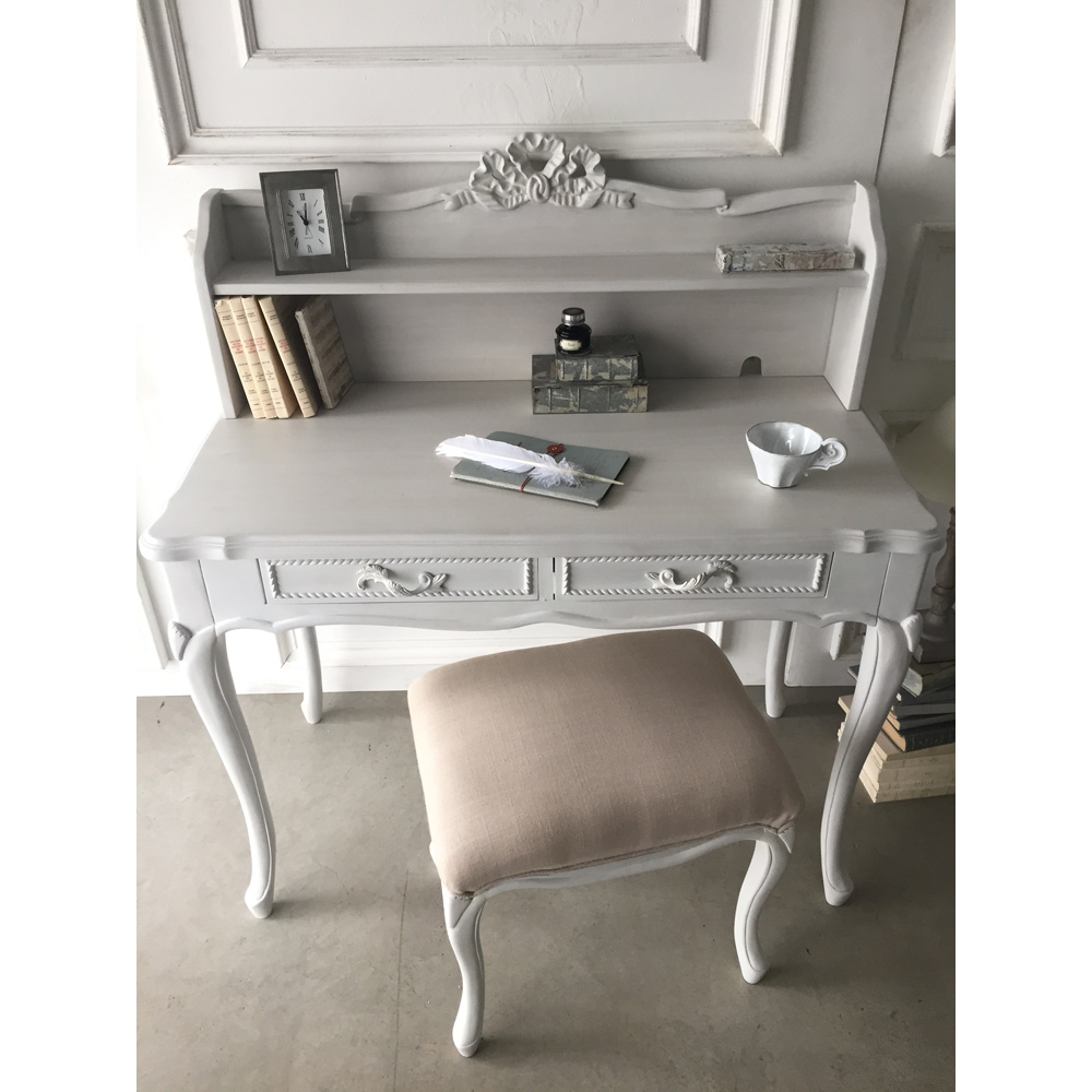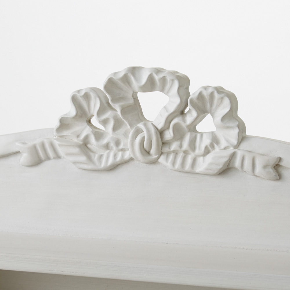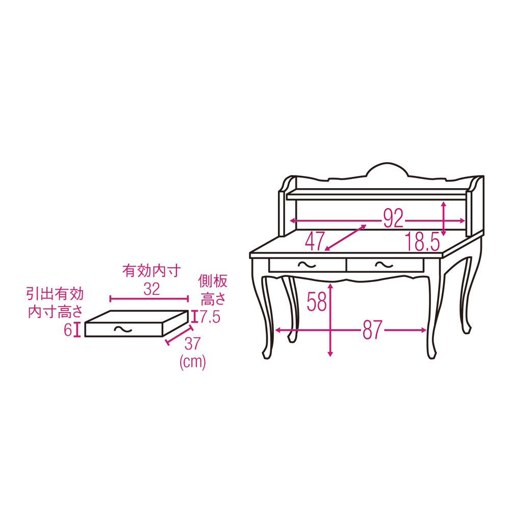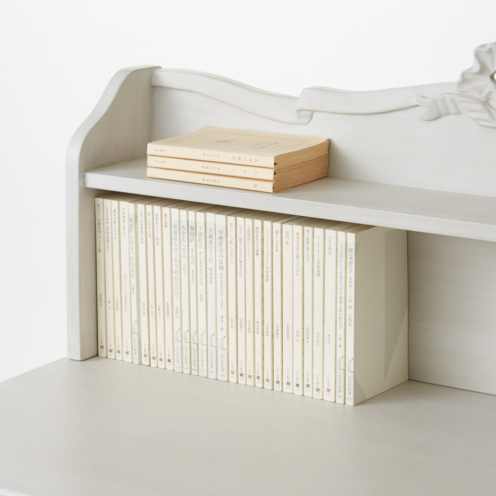 クラシックでいて柔和なグレイッシュホワイト色に、さり気なく愛らしいリーフやリボンの装飾。好きなものを選び抜く大人の女性にふさわしい、パリのアパルトマンのような一室に演出します。豪華で女性らしいフォルムと、控えめながら流麗な装飾が美しいシャビーシックなデスクで、優美で特別な読書・ワークタイムをお楽しみください。〜大人の女性のためのシャビーシックなフレンチ空間〜◆落ち着きのあるグレーがかったホワイト色で、上品な美しさをたたえるワークデスク。◆長年使いこまれたような味わいが出るよう、表情豊かなアンティーク加工に仕上げました。◆ボリュームのある柔らかなリボンのモチーフで、品の良いかわいらしさを演出する机です。◆丸みのあるねこ脚の曲線美と、なめらかな植物モチーフの取っ手で、さりげないエレガントさが魅力です。◆映画に出てくる海外インテリアのようなおしゃれなインテリア空間を、ご自宅でお手軽にお楽しみいただけます。◆アンティーククラシック風やナチュラルフレンチカントリー風のお部屋コーディネートにもおすすめです。〜読書も仕事もエレガントに〜◆二段の飾り棚付で、文庫本やお気に入りの雑貨を手に取りやすい場所に収納することができます。◆左右にコード配線用の穴が開いているので、ノートパソコンやデスクトップPCも便利に使用できます。◆奥行たっぷりの2杯の引き出しは、A4サイズがゆったり入る大きさです。〜商品担当者のコメント〜お洒落でクラシックなフォルムとポイント使いの優美なリボンモチーフで、憧れの空間が叶う大人の白家具シリーズです。グレー味のかかった落ち着いた白色なので、お部屋のインテリアになじみながら、上品に存在感を放ちます。自分へのご褒美やお部屋の模様替えにもオススメの心ときめくクラシック家具で、毎日の「自分時間」をより贅沢にお楽しみいただけたら幸いです。※手作業によるアンティーク風仕上げおよび天然素材の性質上、塗装の濃淡・かすれ等の風合いは1点ずつ異なります。商品全体、特に手彫り部分は職人の手作業で、部分的に長年使用したような汚れ、キズなどを再現しています。味わい深く趣のある風合いをお楽しみください。