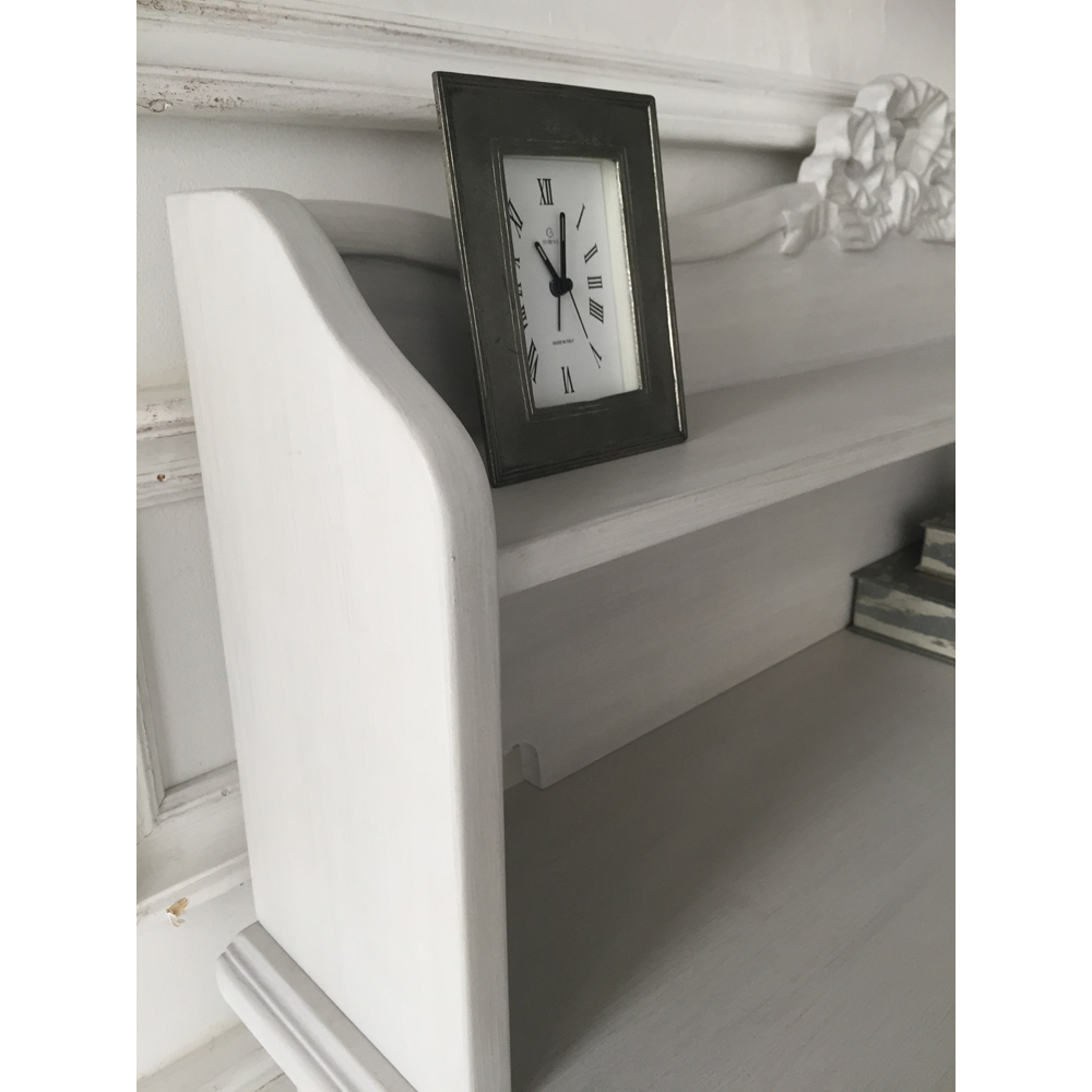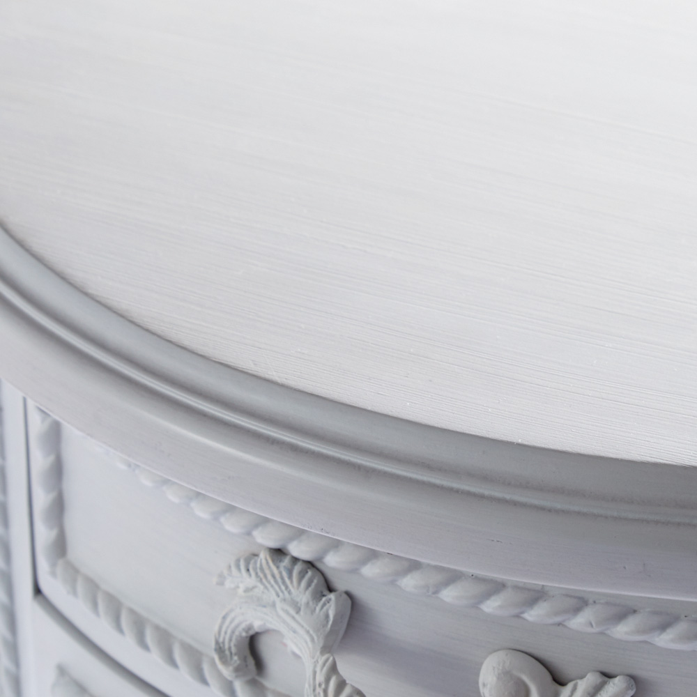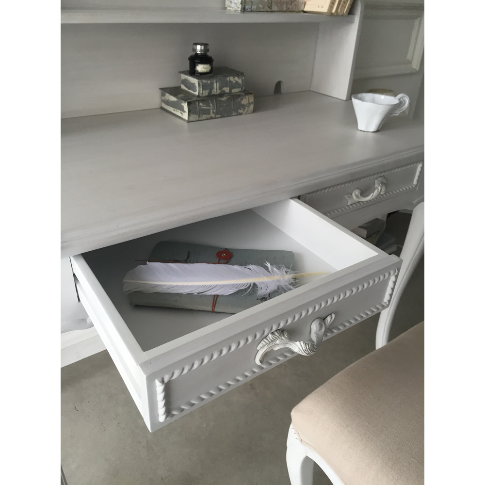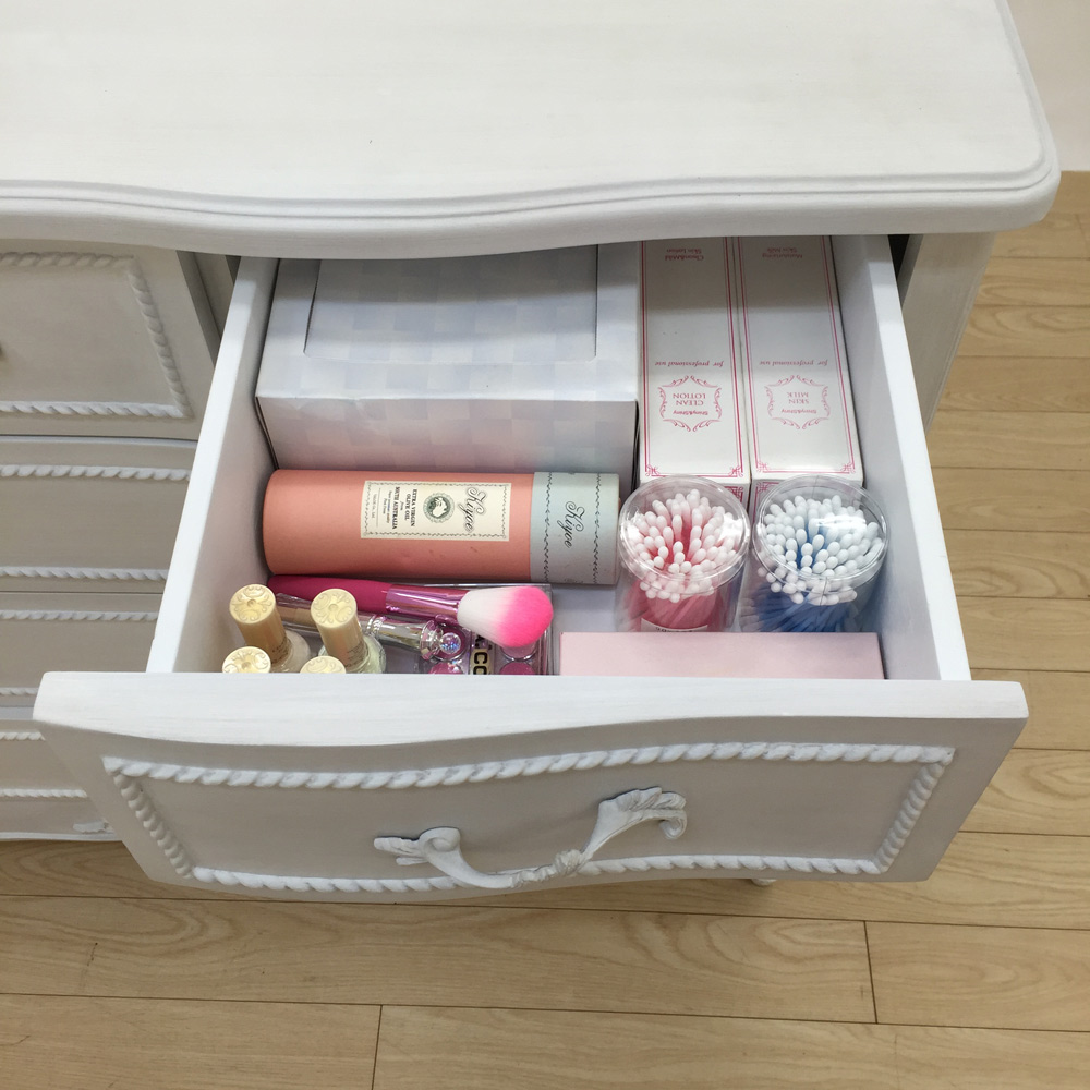 クラシックでいて柔和なグレイッシュホワイト色に、さり気なく愛らしいリーフやリボンの装飾。好きなものを選び抜く大人の女性にふさわしい、パリのアパルトマンのような一室に演出します。豪華で女性らしいフォルムと、控えめながら流麗な装飾が美しいシャビーシックなデスクで、優美で特別な読書・ワークタイムをお楽しみください。〜大人の女性のためのシャビーシックなフレンチ空間〜◆落ち着きのあるグレーがかったホワイト色で、上品な美しさをたたえるワークデスク。◆長年使いこまれたような味わいが出るよう、表情豊かなアンティーク加工に仕上げました。◆ボリュームのある柔らかなリボンのモチーフで、品の良いかわいらしさを演出する机です。◆丸みのあるねこ脚の曲線美と、なめらかな植物モチーフの取っ手で、さりげないエレガントさが魅力です。◆映画に出てくる海外インテリアのようなおしゃれなインテリア空間を、ご自宅でお手軽にお楽しみいただけます。◆アンティーククラシック風やナチュラルフレンチカントリー風のお部屋コーディネートにもおすすめです。〜読書も仕事もエレガントに〜◆二段の飾り棚付で、文庫本やお気に入りの雑貨を手に取りやすい場所に収納することができます。◆左右にコード配線用の穴が開いているので、ノートパソコンやデスクトップPCも便利に使用できます。◆奥行たっぷりの2杯の引き出しは、A4サイズがゆったり入る大きさです。〜商品担当者のコメント〜お洒落でクラシックなフォルムとポイント使いの優美なリボンモチーフで、憧れの空間が叶う大人の白家具シリーズです。グレー味のかかった落ち着いた白色なので、お部屋のインテリアになじみながら、上品に存在感を放ちます。自分へのご褒美やお部屋の模様替えにもオススメの心ときめくクラシック家具で、毎日の「自分時間」をより贅沢にお楽しみいただけたら幸いです。※手作業によるアンティーク風仕上げおよび天然素材の性質上、塗装の濃淡・かすれ等の風合いは1点ずつ異なります。商品全体、特に手彫り部分は職人の手作業で、部分的に長年使用したような汚れ、キズなどを再現しています。味わい深く趣のある風合いをお楽しみください。