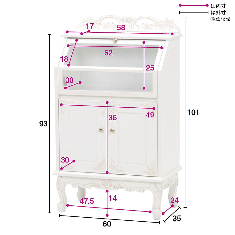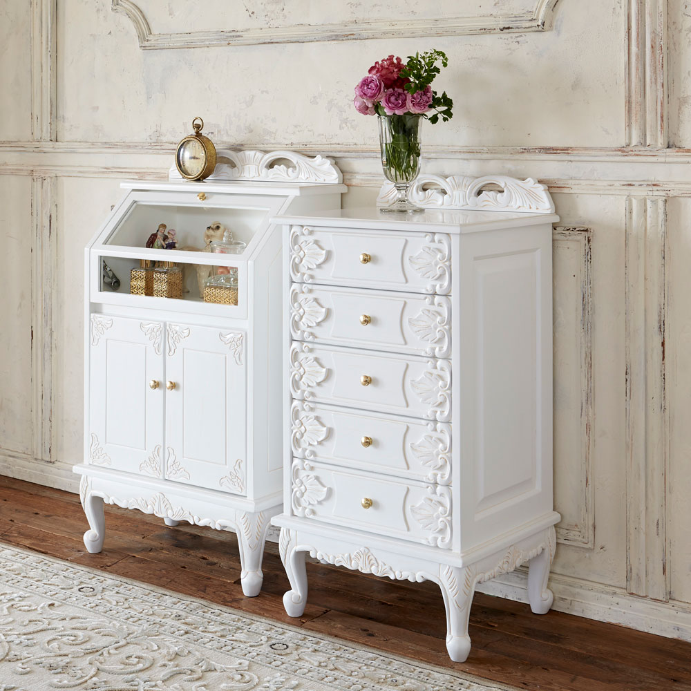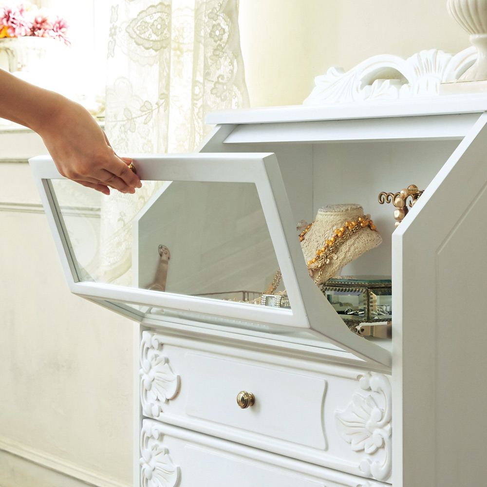 洗練された上品さと高級感を演出する、天然木の飾り彫り加工がゴージャスなクラシックキャビネット。レースのように繊細な装飾部分は、ひとつひとつ職人による手作業で丁寧に仕上げています。長年愛用したようなアンティーク加工を施しており、レトロで美しい佇まいでお部屋に趣を添えます。リビング収納やコスメ収納、お気に入りのコレクションやアクセサリーを美しく収納する、お洒落なキュリオケースとしてもおすすめ。女性らしく、華やかで優しい印象のコレクション収納チェストです。〜お気に入りをディスプレイする、特別な空間を〜◆ガラスの扉を使用することでお気に入りの食器や雑貨を美しく飾り、ホコリや汚れからも大切に守ってくれます。◆アクセサリーやインテリアを一層輝かせるガラス扉を採用しています。◆ディスプレイ収納や、コレクション収納としてもオススメです。〜憧れのフランスのお部屋のような上質で洗練されたクラシックインテリアをご自宅で〜職人技が息づく優雅な造形美 近年、海外のセレブリティたちに注目され、日本でも有名人が愛用したことで注目されるクラシカル調の家具。なかでも、ホワイトカラーに時を重ねたような趣を醸し出すアンティーク加工は、人気の高いレトロな仕上げです。職人が1点1点手作業で仕上げた精巧な彫刻は、ため息の出るような美しさ。うっとりとする優雅さを、その造形美を眺めるたびにお楽しみいただけます。〜心を満たす気品のディテール〜くるんと愛らしい猫脚、繊細な彫刻、ラグジュアリーなベロア調の座面…。クラシック調家具の魅力はディテールにも宿ります。それは、歴史とともに受け継がれてきた芸術を物語るような風格を魅せ、お部屋の家具にひとつ加えるだけでも確かな存在感を約束してくれます。そして、忙しく過ぎ去っていく現代に「生活を細部まで慈しむ」豊かさを与えてくれることでしょう。エレガントな佇まいは、まるで洋書のワンシーンのよう。職人技による美しいレリーフ、愛らしい猫脚に心ときめきます。〜商品担当者のコメント〜猫脚の丸みや、美しいモチーフの装飾が女性らしい印象の白家具シリーズです。華やかなデザインのみでなく、収納家具としての機能性も充実しており、まるで海外のホテルのような憧れ空間を叶えられます。自分へのご褒美やお部屋の模様替えにもオススメの、クラシックデザイン家具です。※アンティーク風仕上げの性質上、塗装の濃淡・かすれ等の風合いが1点ずつ異なります。特に手彫り部分は職人の手作業で、部分的に長年使用したような汚れ、キズを再現しています。天然素材ならではの風合いをお楽しみください。〜アンティーク家具の特集はこちら〜アンティーク家具の世界