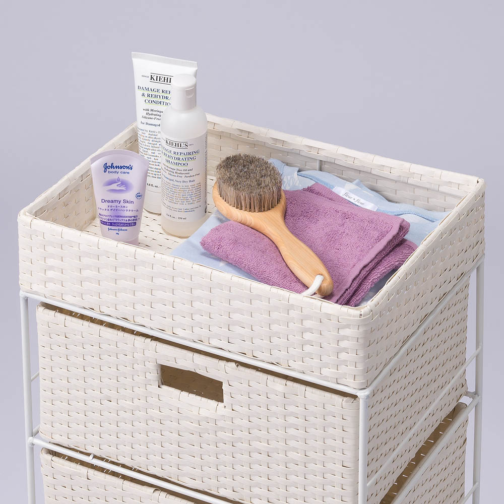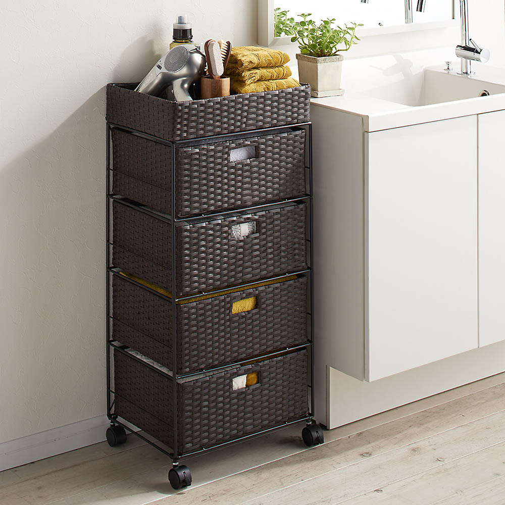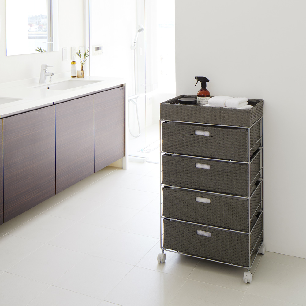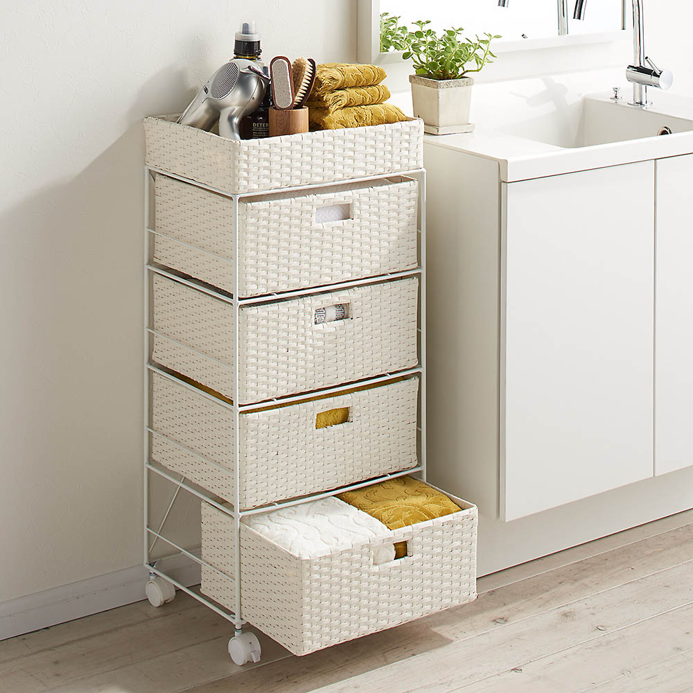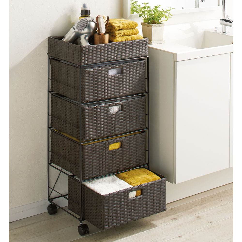 ラタンの質感で洗面所を上品に、衣類もボトルもリゾートライクに収納できます。ちょっとしたスペースの収納もおしゃれにこだわって、お客様に見せたくなるようなおもてなしの空間を演出します。。〜水回りでも安心の樹脂製ラック〜●ラタン調のバスケットは樹脂製なので、水や汚れに強く、お手入れも簡単です。●ストッパー付きキャスターで移動も配置もラクラク。毎日の掃除もはかどります。〜上品な佇まいで生活感を隠す〜●柔らかな色合いのラタン調バスケット引き出しで、ボトルや普段使いのリネンをスッキリと目隠しできます。●最上段のバスケットはオープンなので、使用頻度の高いものや、お客様用のハンドタオルやアメニティグッズを置くのにも便利。●バスケット(内寸奥行27、高さ15cm)は全段入れ替え可能です。●まるでホテルやエステサロンようなリラックス空間に。ゲストも使う洗面所も素敵に演出できます。〜お好みで選べる3色〜清潔感のあるホワイト、シックなダークブラウン、モダンな印象のグレーから選べます。