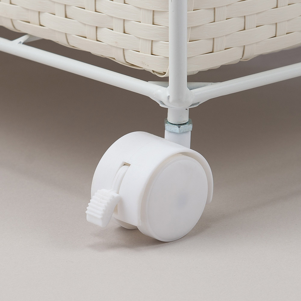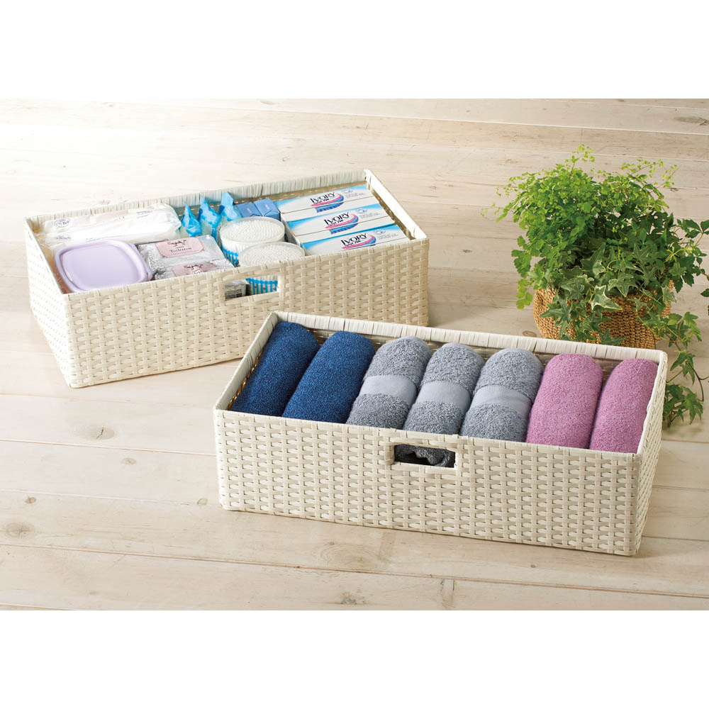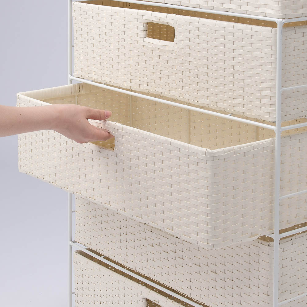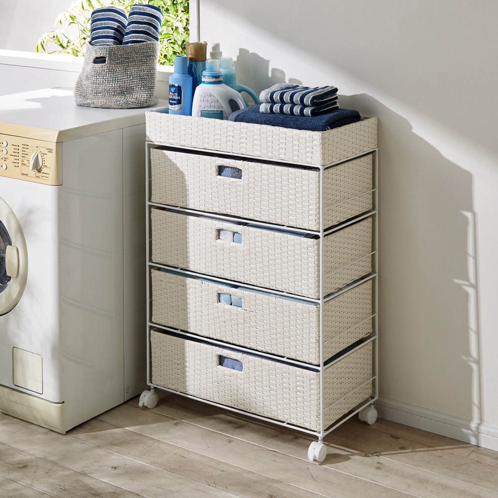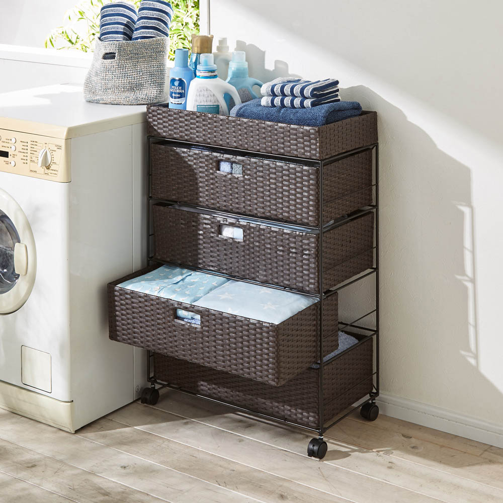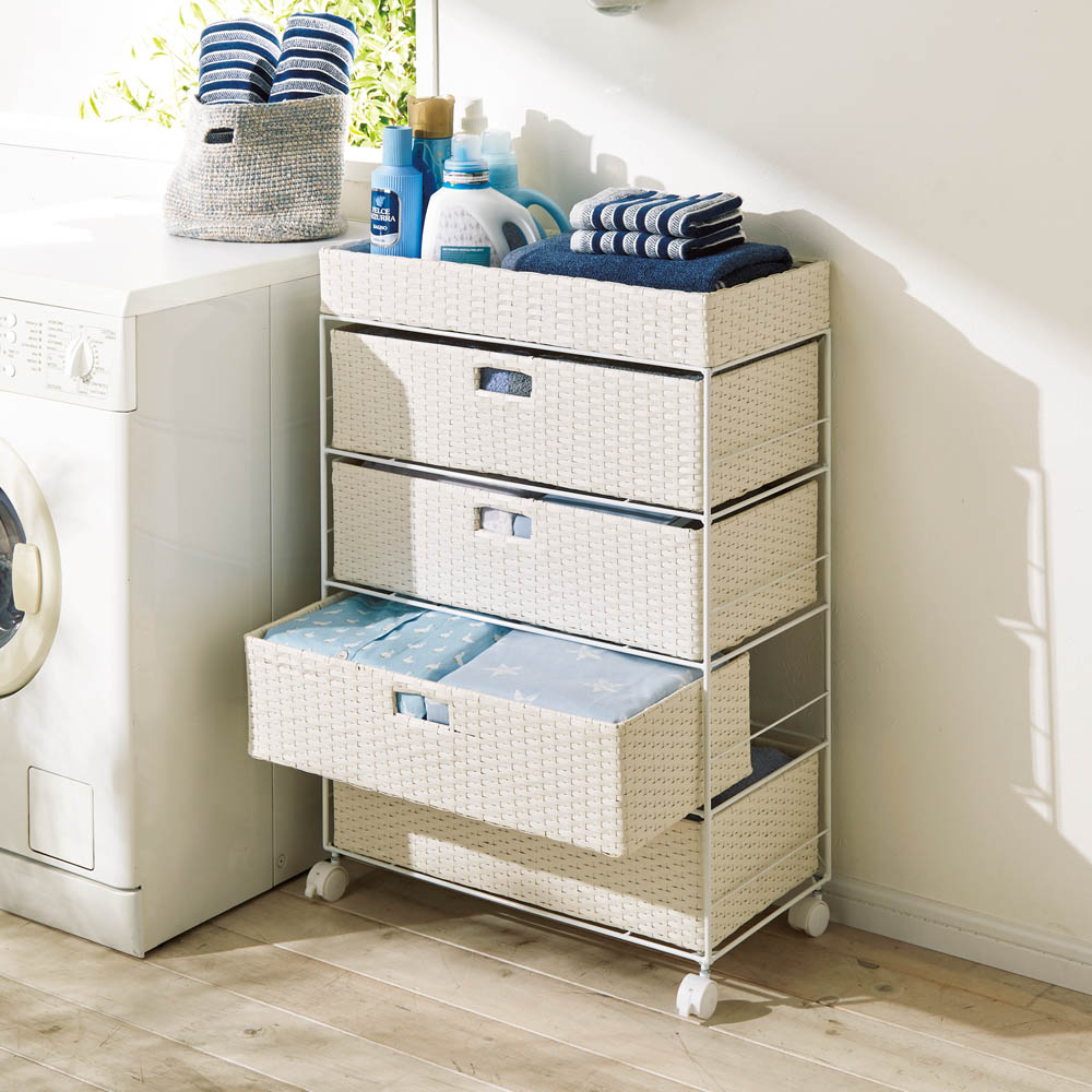 ラタンの質感で洗面所を上品に、衣類もボトルもリゾートライクに収納できます。ちょっとしたスペースの収納もおしゃれにこだわって、お客様に見せたくなるようなおもてなしの空間を演出します。〜水回りでも安心の樹脂製ラック〜●ラタン調のバスケットは樹脂製なので、水や汚れに強く、お手入れも簡単です。●ストッパー付きキャスターで移動も配置もラクラク。毎日の掃除もはかどります。〜上品な佇まいで生活感を隠す〜●柔らかな色合いのラタン調バスケット引き出しで、ボトルや普段使いのリネンをスッキリと目隠しできます。●最上段のバスケットはオープンなので、使用頻度の高いものや、お客様用のハンドタオルやアメニティグッズを置くのにも便利。●バスケット(内寸奥行27、高さ15cm)は全段入れ替え可能です。●まるでホテルやエステサロンようなリラックス空間に。ゲストも使う洗面所も素敵に演出できます。〜お好みで選べる3色〜清潔感のあるホワイト、シックなダークブラウン、モダンな印象のグレーから選べます。