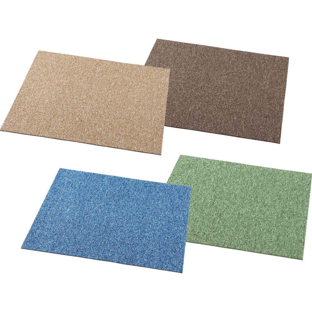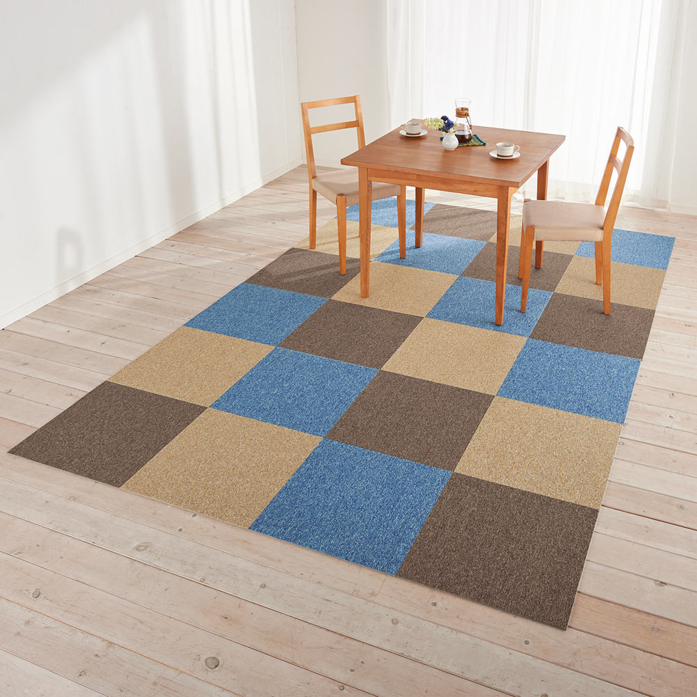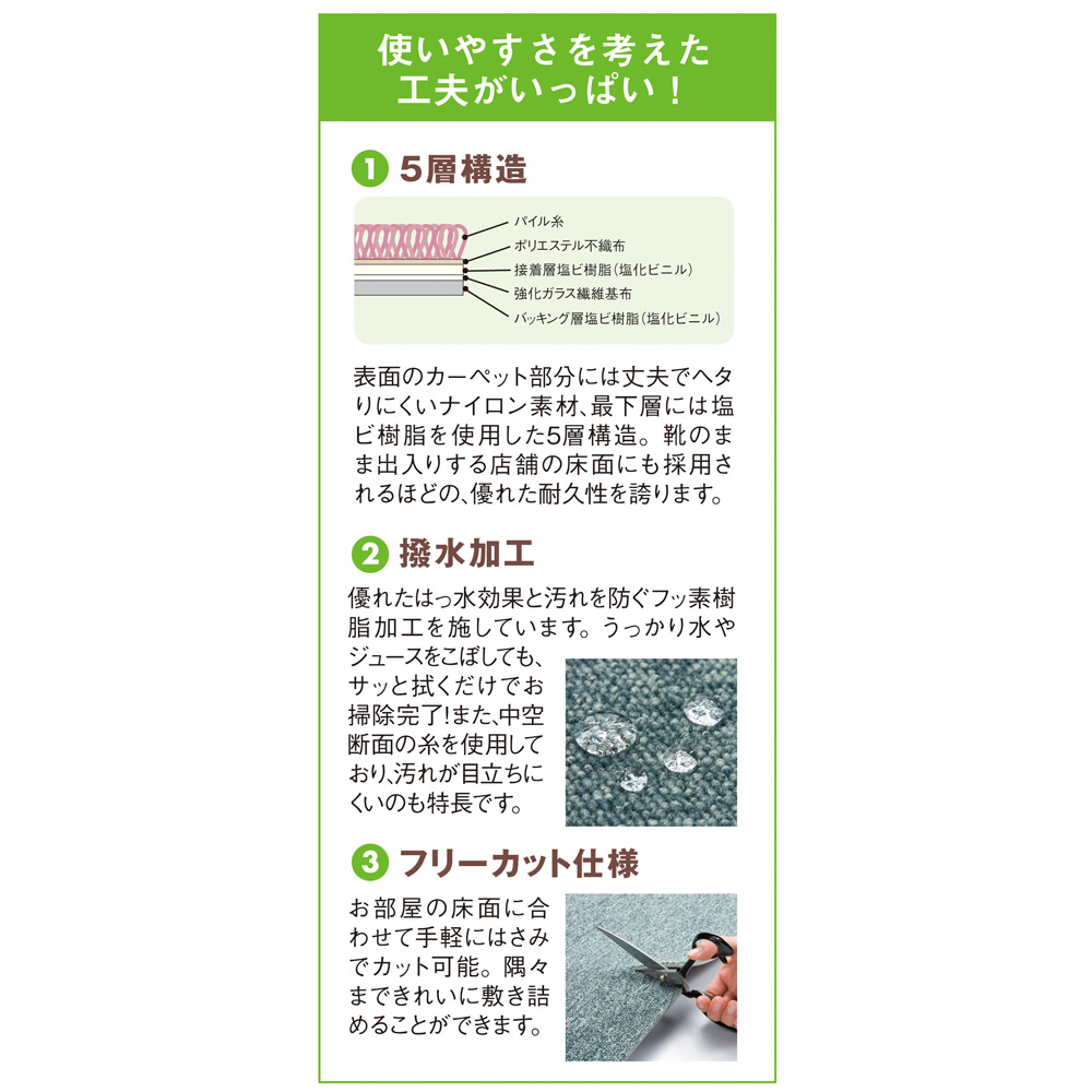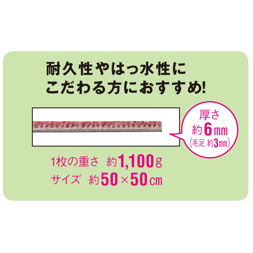 業務用として使われている、耐久性に優れたずっしり厚手の大判タイプタイルマット。はっ水性に優れ、汚れたら一枚ずつ外して手洗いもできます。犬の滑り止めマットにもおすすめ。ペットの滑り止めマットにおすすめ!犬や猫が室内で転ばず歩きやすい部屋にするために、フローリングにはマットを敷くのがおすすめです。ペットの体の負担を減らすだけでなく、フローリングの汚れを防ぐ効果も!【組み合わせ自由】リビング使用イメージリビング全面に敷き詰めればカーペット仕様のお部屋に。【組み合わせ自由】ダイニング使用イメージ汚れた部分だけ洗えるのでダイニングにもぴったり。部分的に敷き詰めても◎。色の組み合わせで自分好みのデザインが手軽に作れます。【組み合わせ自由】廊下使用イメージ必要枚数を敷き詰められるから廊下にもぴったり。ハサミ・カッターでカットもできるので、隅々まできれいに敷き詰められます。耐久性に優れた厚手&大判タイプ業務用としても使われている耐久性に優れたしっかり厚手でのタイルマット。表面のカーペット部分に丈夫でヘタリにくいナイロン素材、最下層にはパッキング層を使用した5層構造。置くだけでズレにくい吸着加工裏面は吸着加工を施しており、置くだけでピタッと止まってズレにくく、設置が簡単。掃除機掛けの時も気になりません。優れたはっ水加工でお手入れラクラク汚れを防ぐフッ素樹脂加工を施しているので、水やジュースをこぼしてもサッと拭くだけ。汚れが目立ちにくいのもうれしいポイントです。汚して1枚ずつ手洗い可汚れたマットだけ外して手洗いできるので、お手入れもラクラク。インテリアに合わせて選べる、多彩な11色展開インテリアに馴染みやすいベーシックカラーからアクセントになるカラーまで、豊富な色からお選びいただけます。枚数・サイズ目安表1枚約50×50cmの大判タイプです。